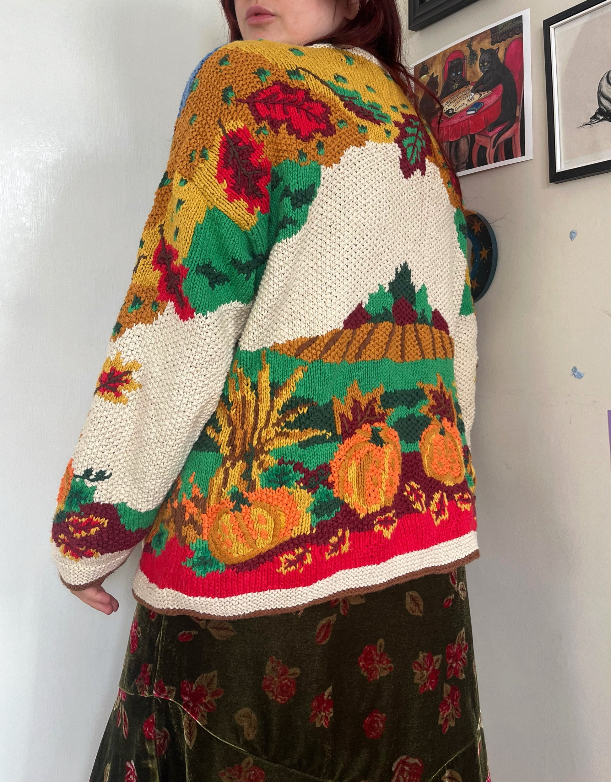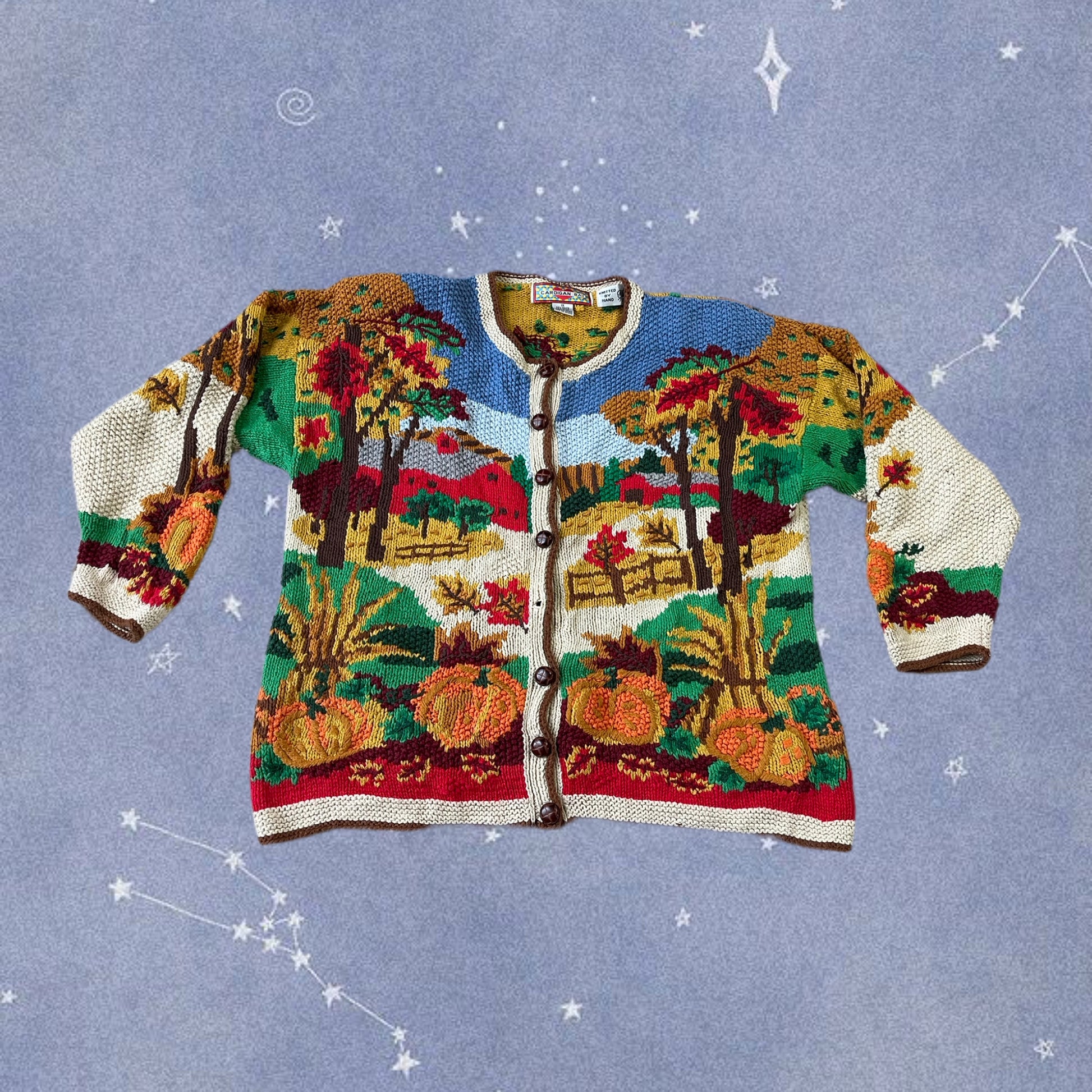 The most amazing 1990s Autumnal design cardigan! Button up front and features a scene on the front with pumpkins, trees, red barns and fields and a design on the back. Hand knit and super rare! Perfect for autumnal walks in the forest, going foraging or just getting cosy on the couch and watching Gilmore Girls. Made from ramie and cotton. *Missing a button in the photos but this has been replaced with a similar looking one!