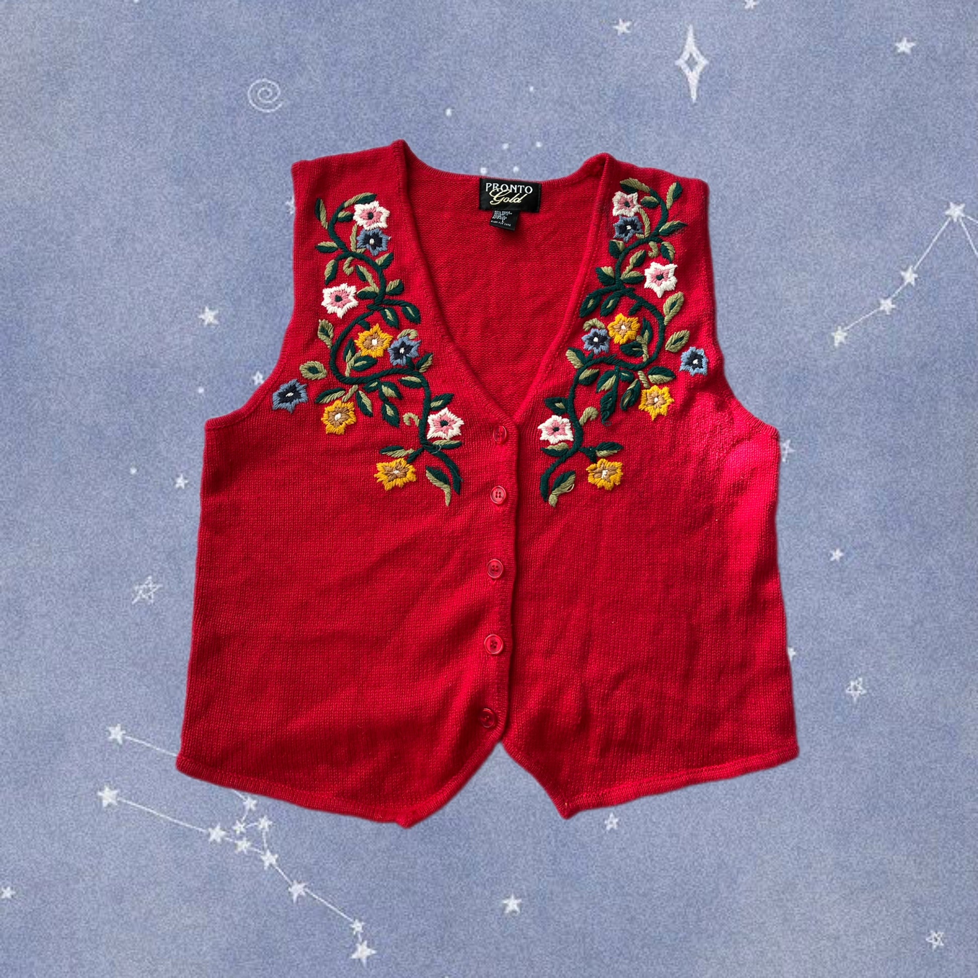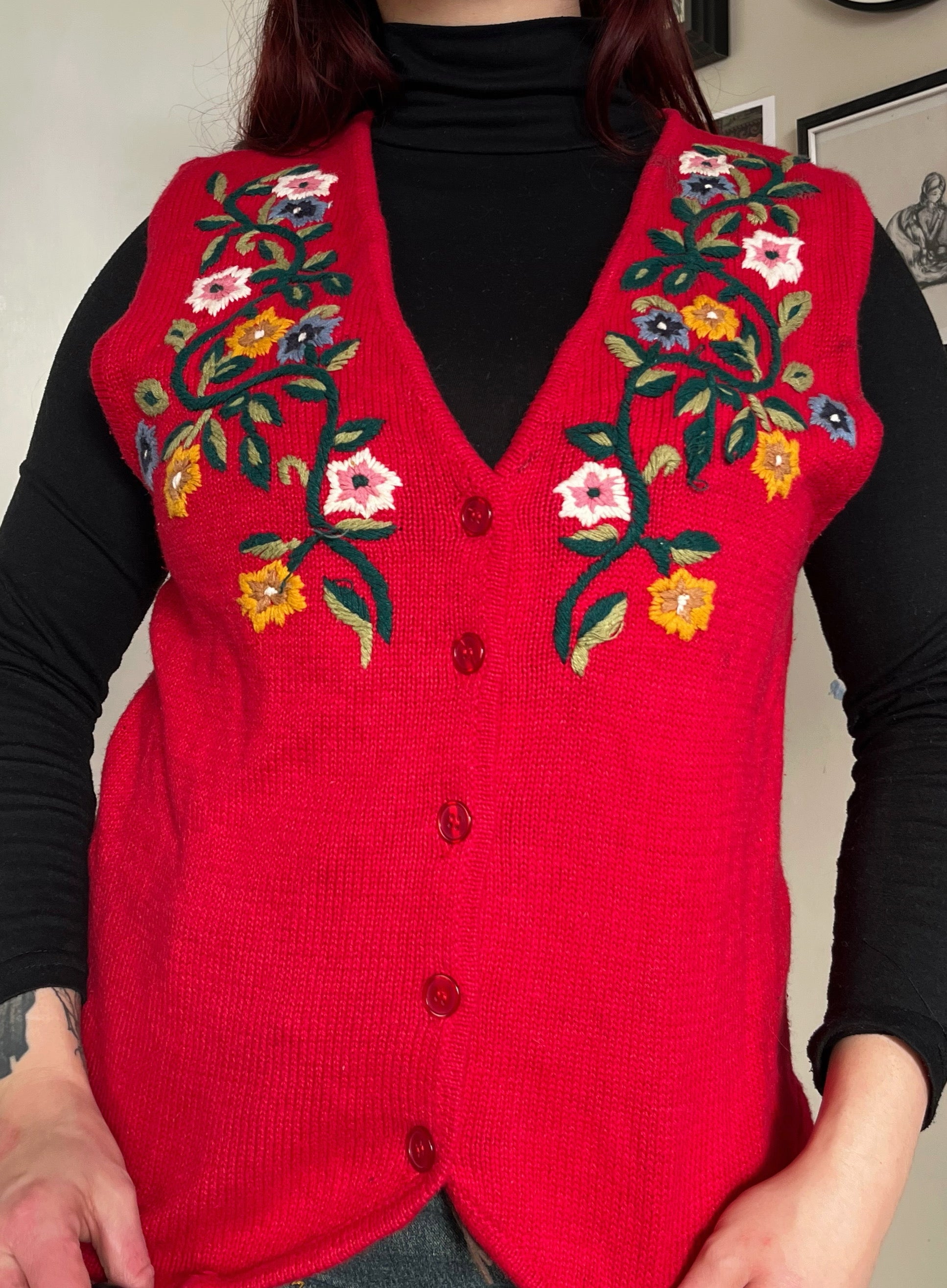1990s button up front red sweater vest! Features a festive floral design on the front.