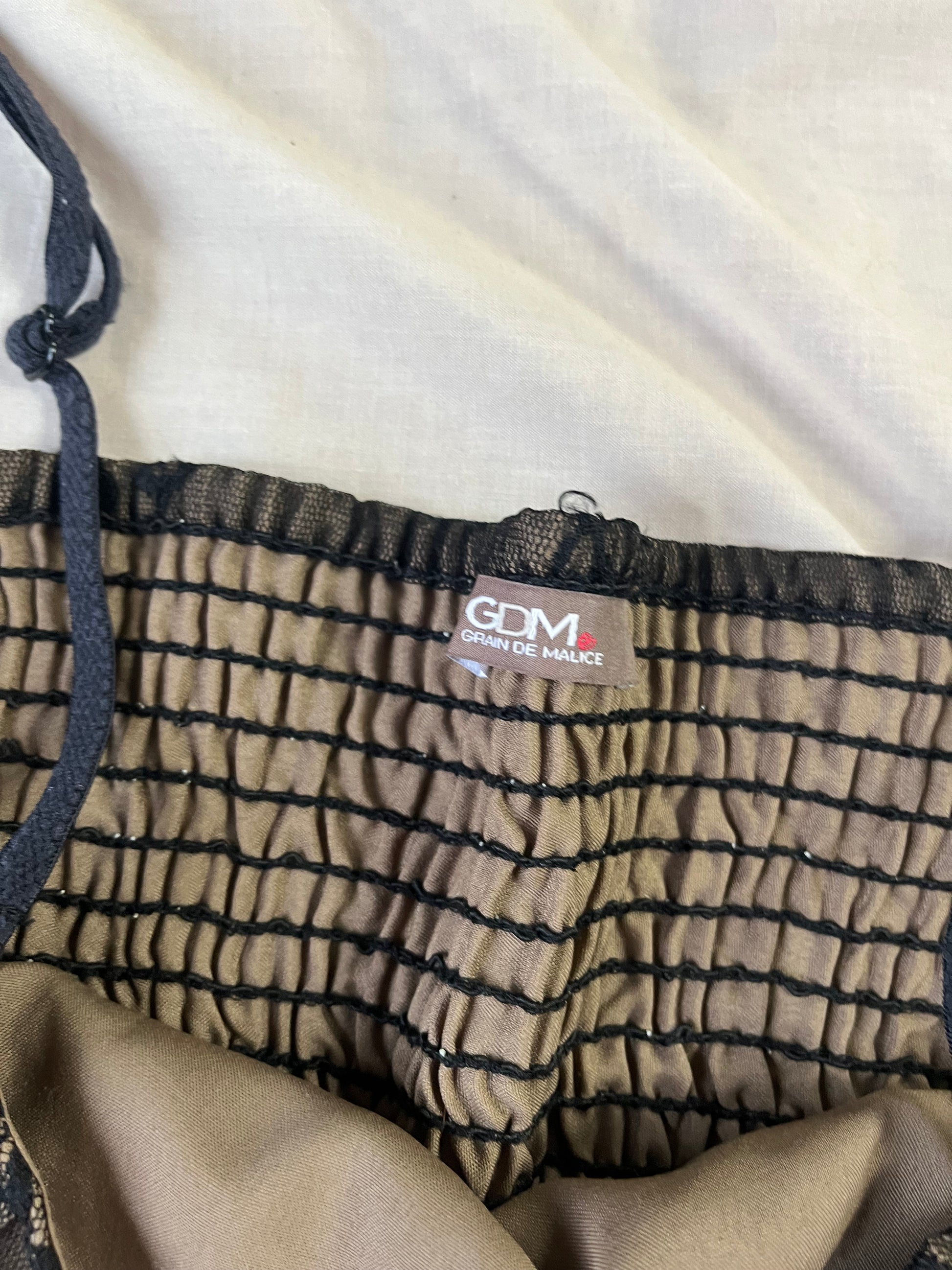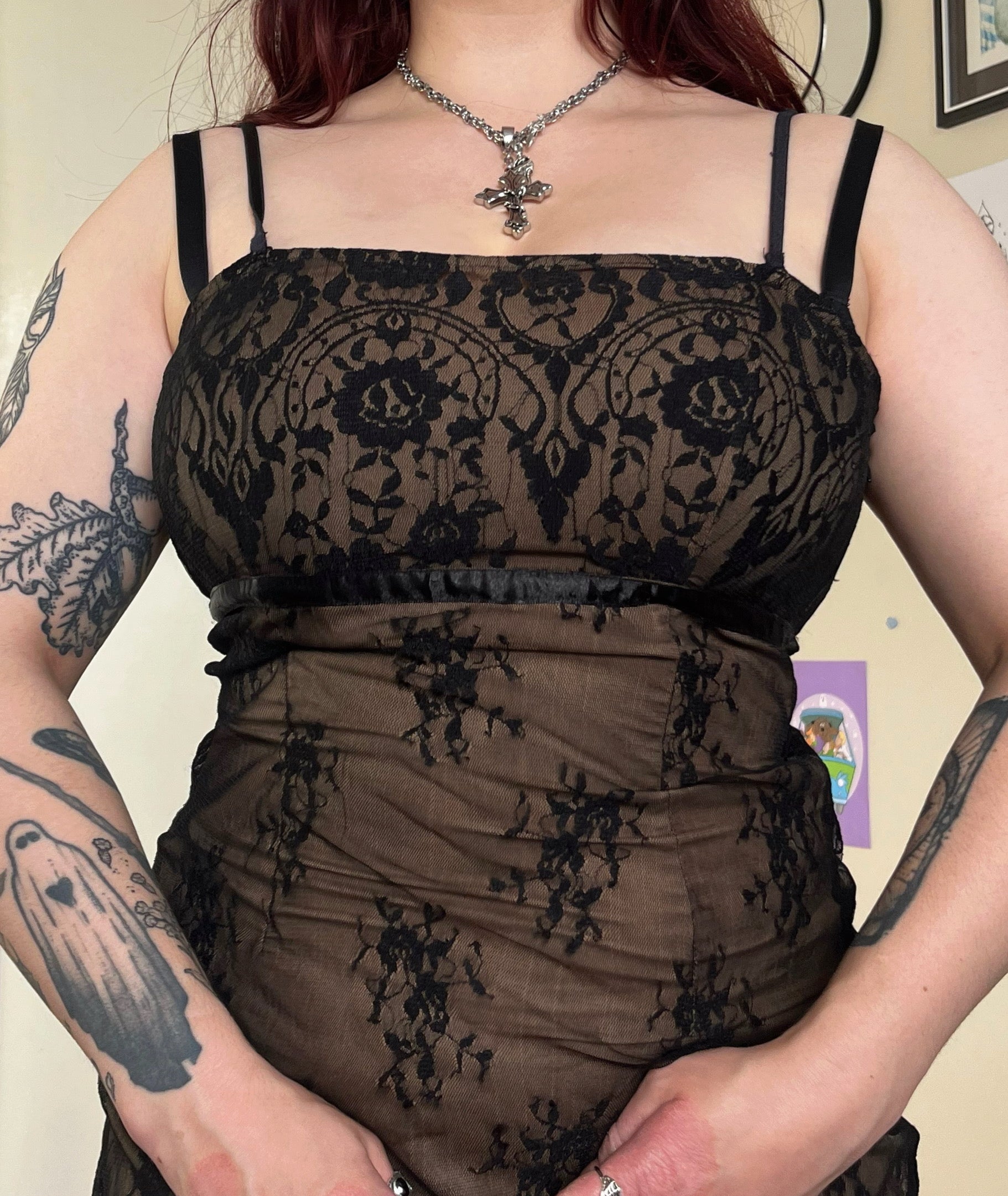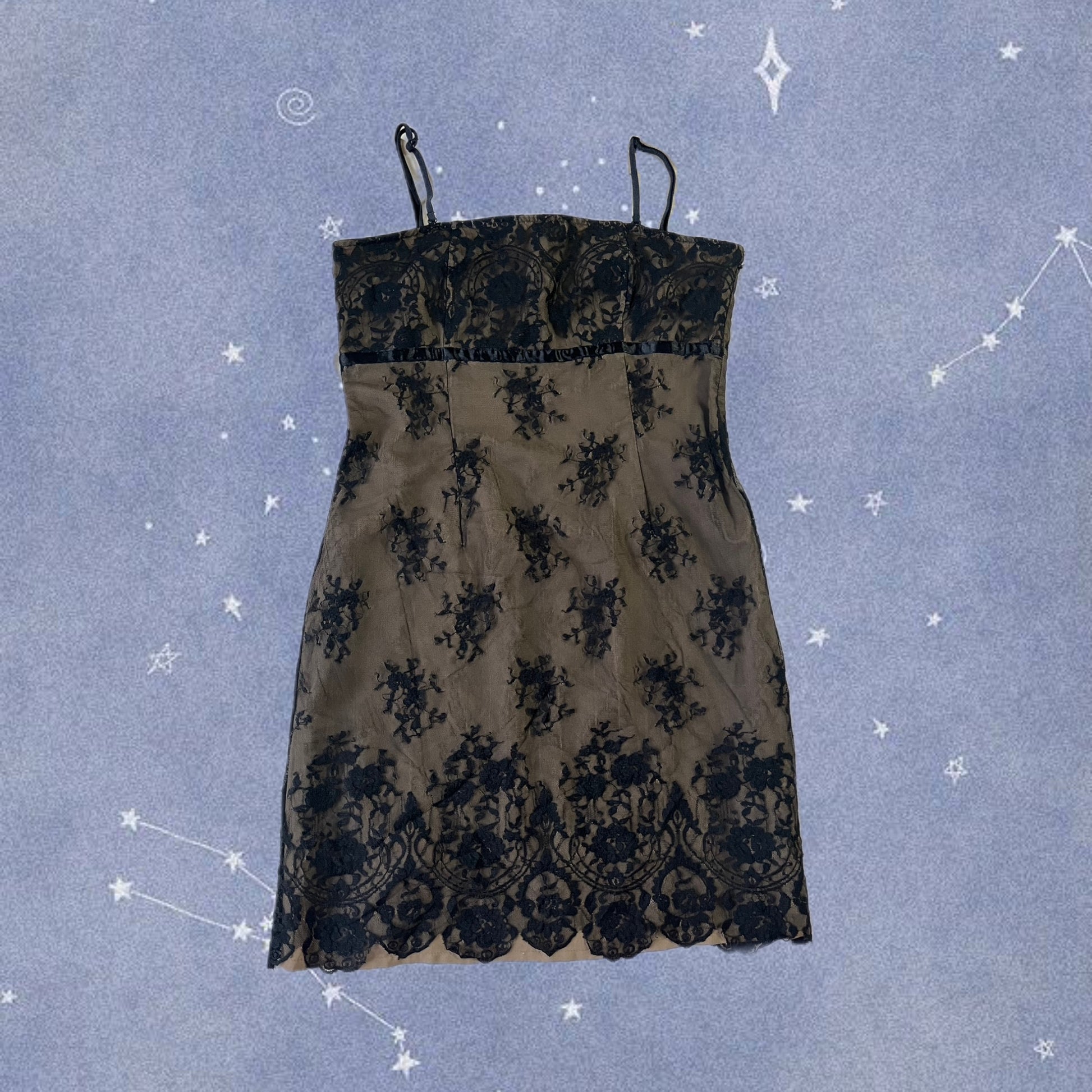 Super cute 2000s black and tan lace design mini dress! Zips up at the back and has a figure hugging fit.
