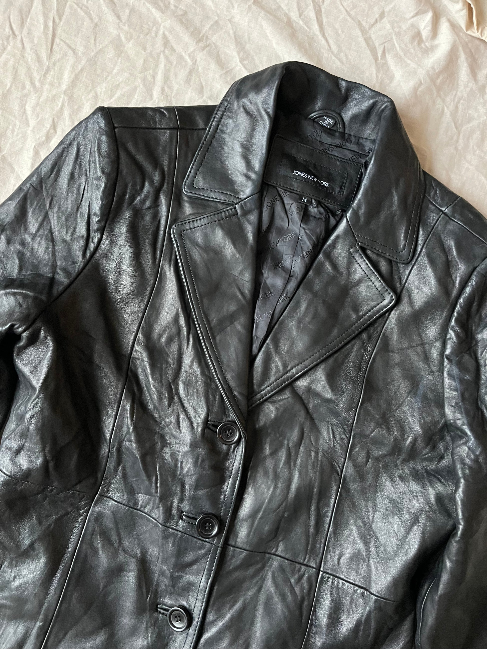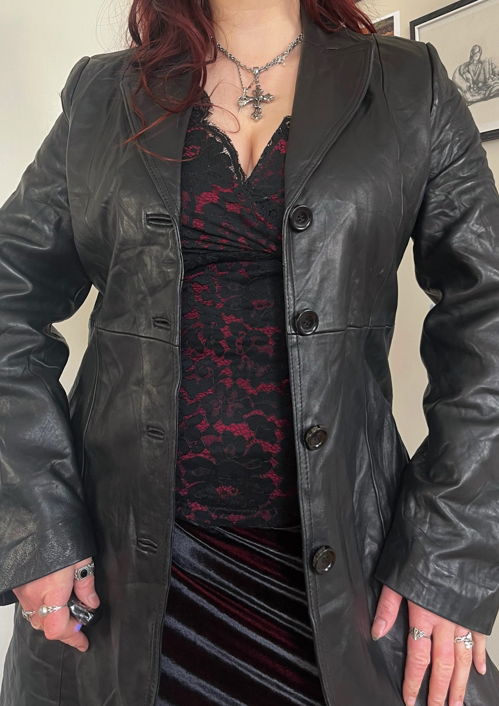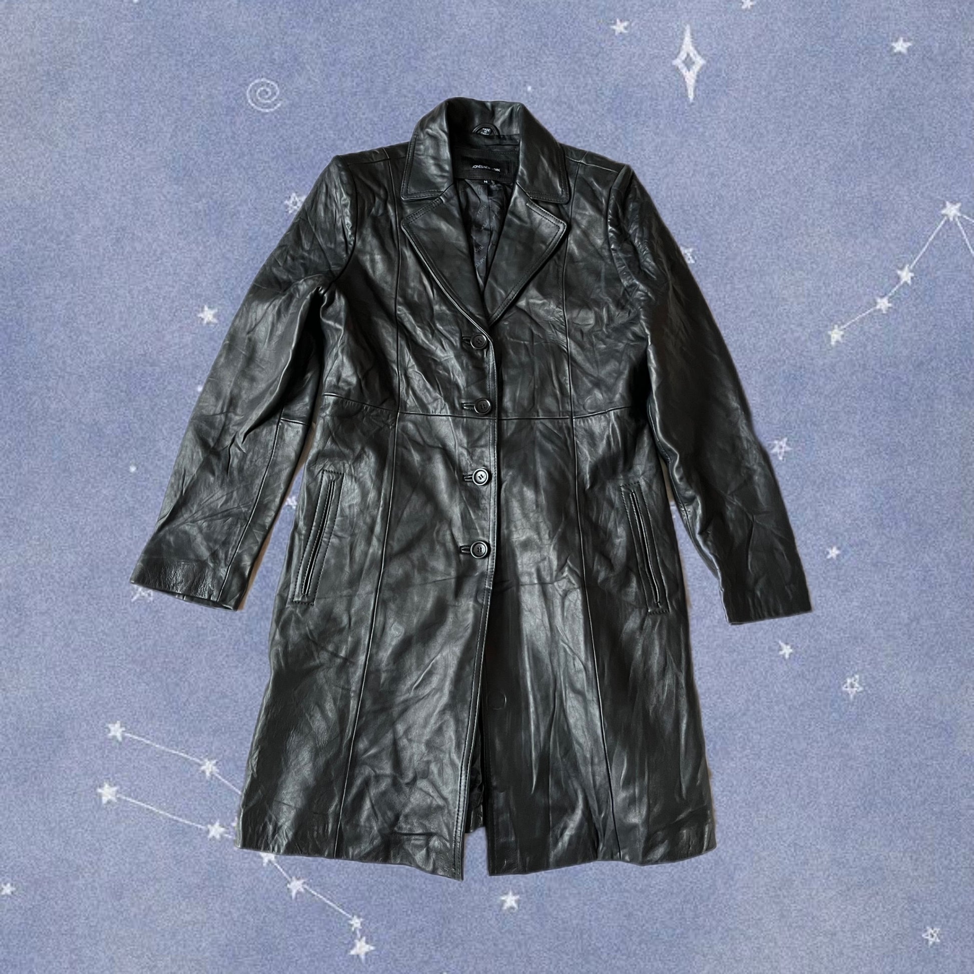 1990s black leather button up front trench coat! Gorgeous flattering fit and made of 100% real leather.