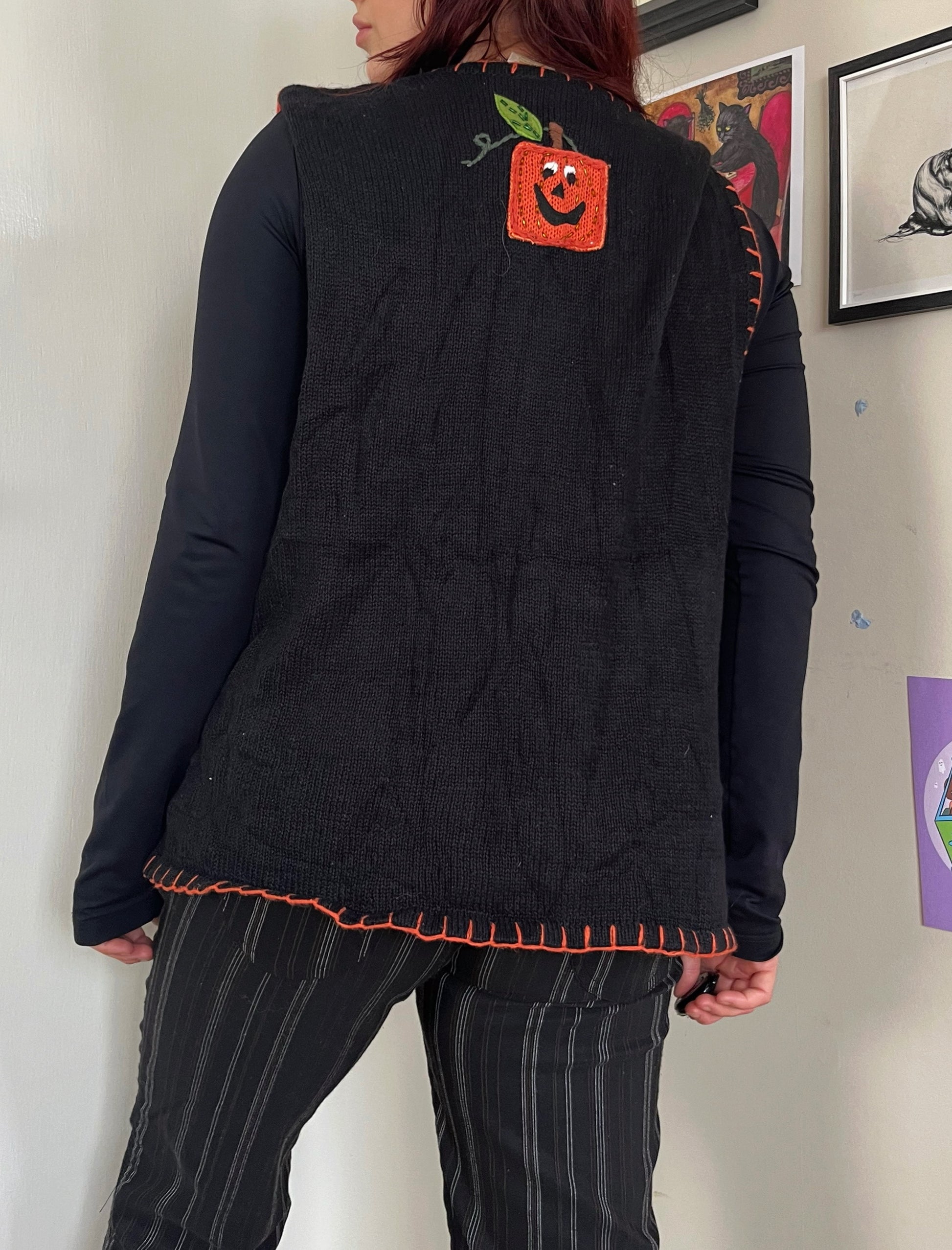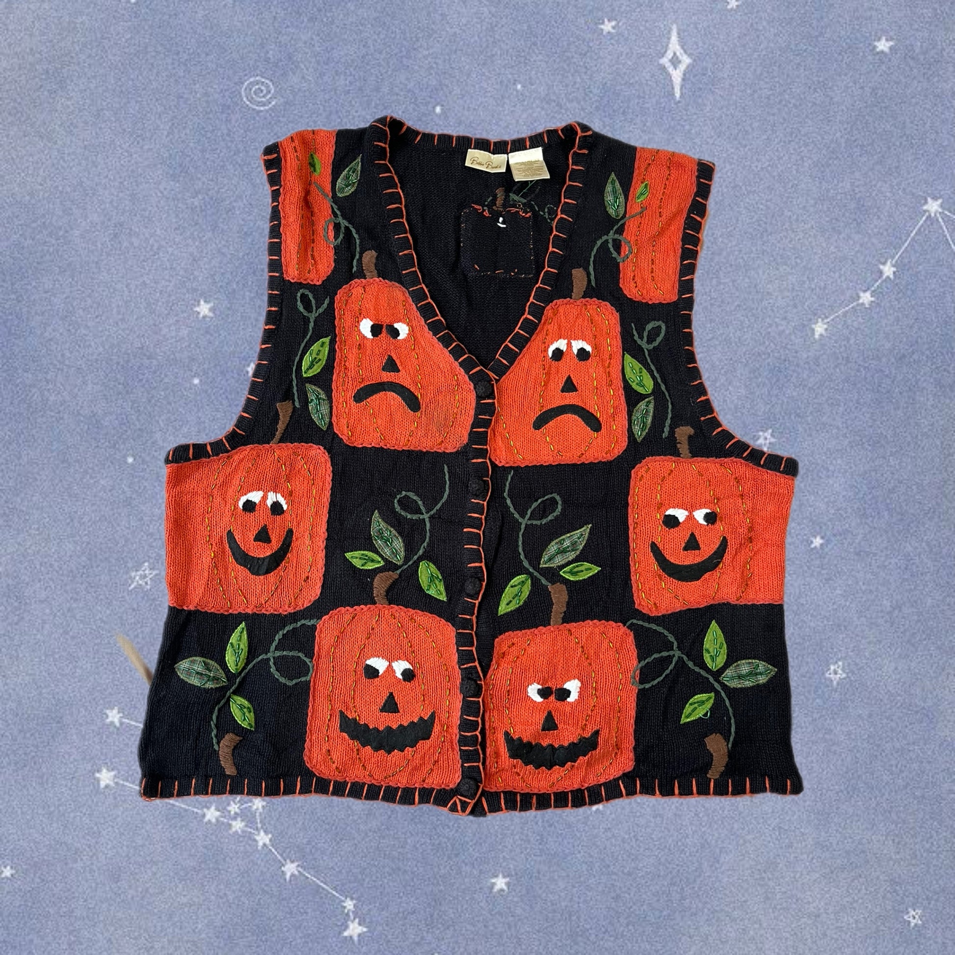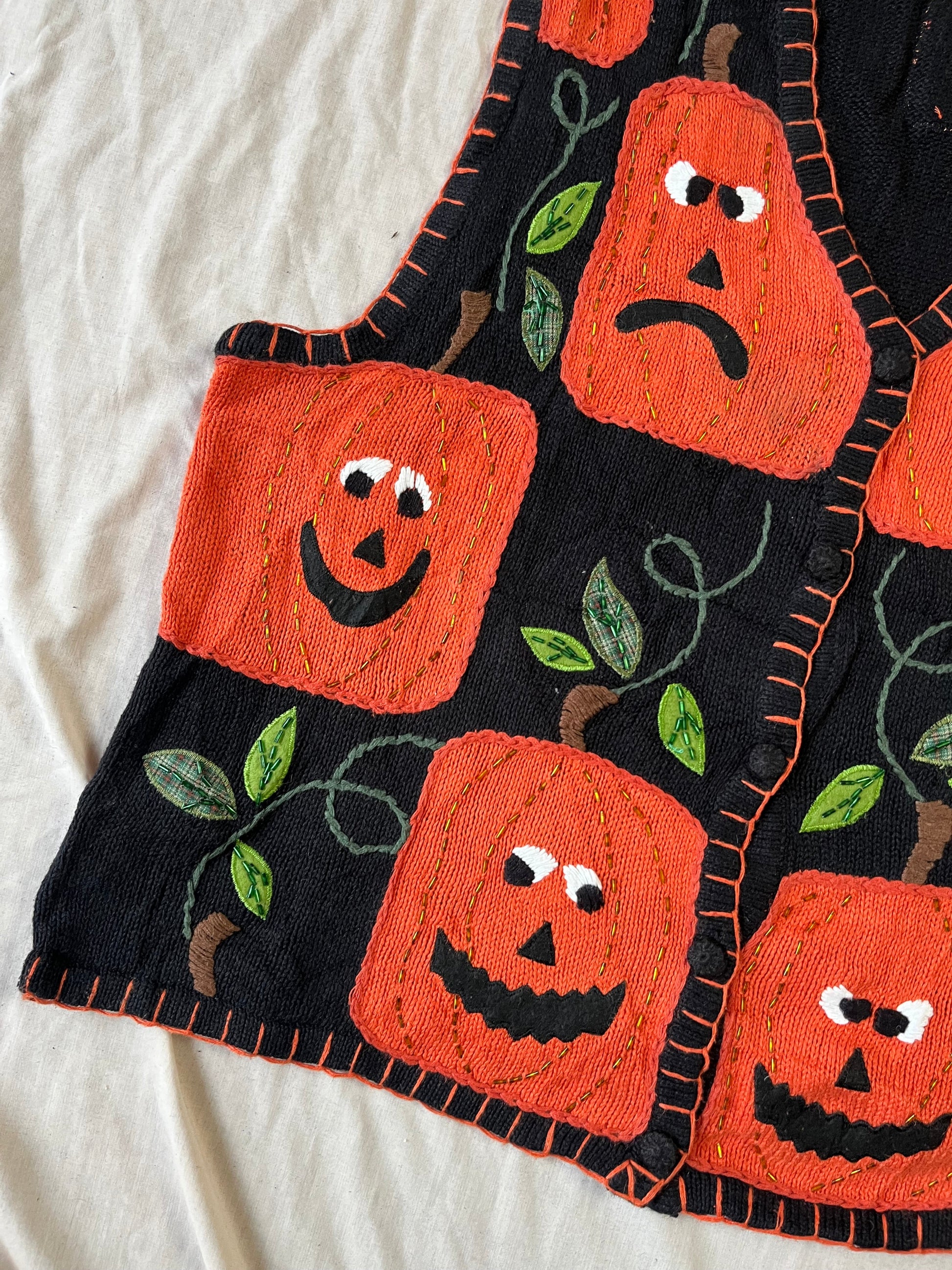 1990s Halloween button up front sweater vest! Has a gorgeous patch work design of happy/sad/scary Jack O' Lanterns! Labelled XL, fits true to size.