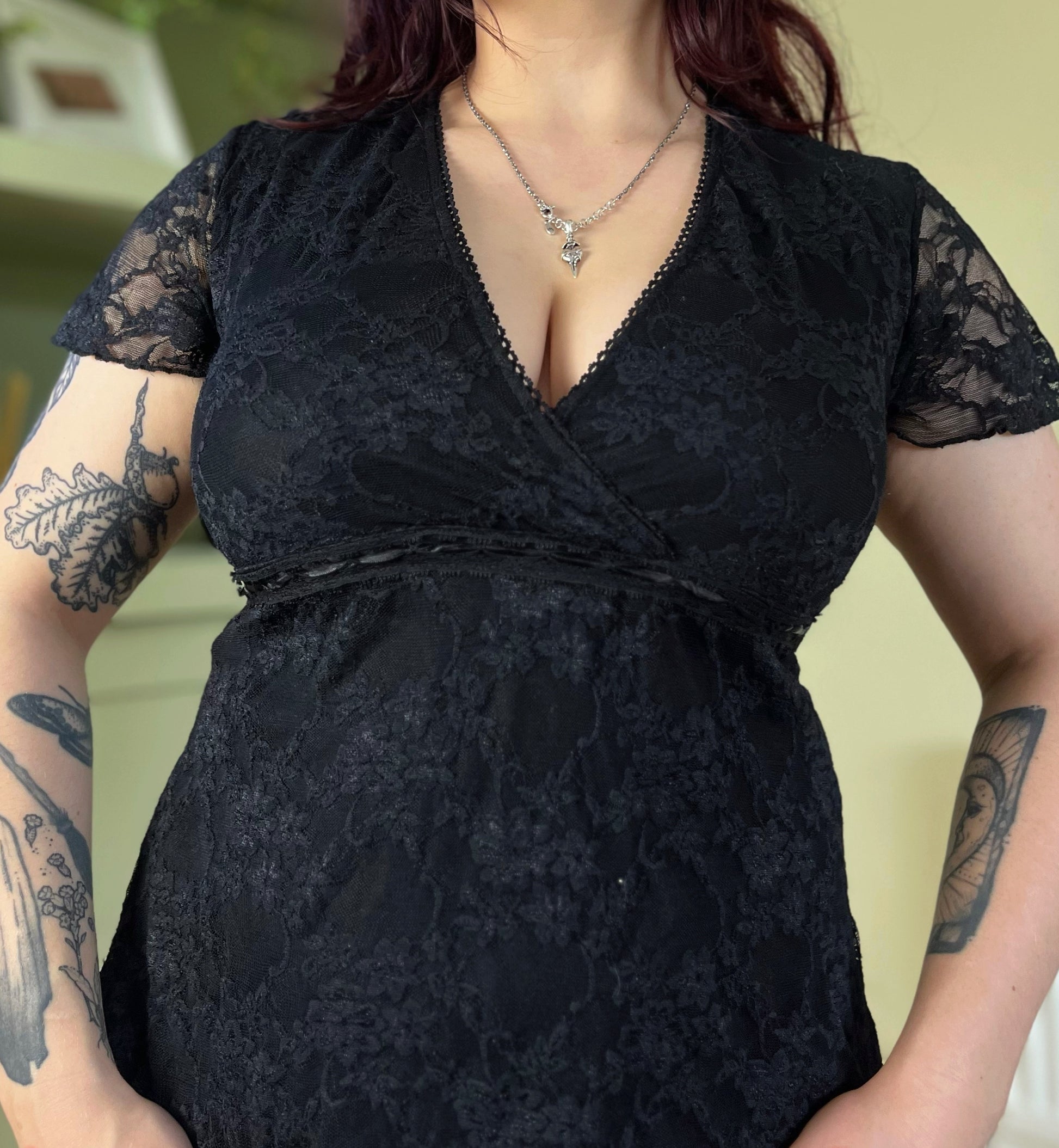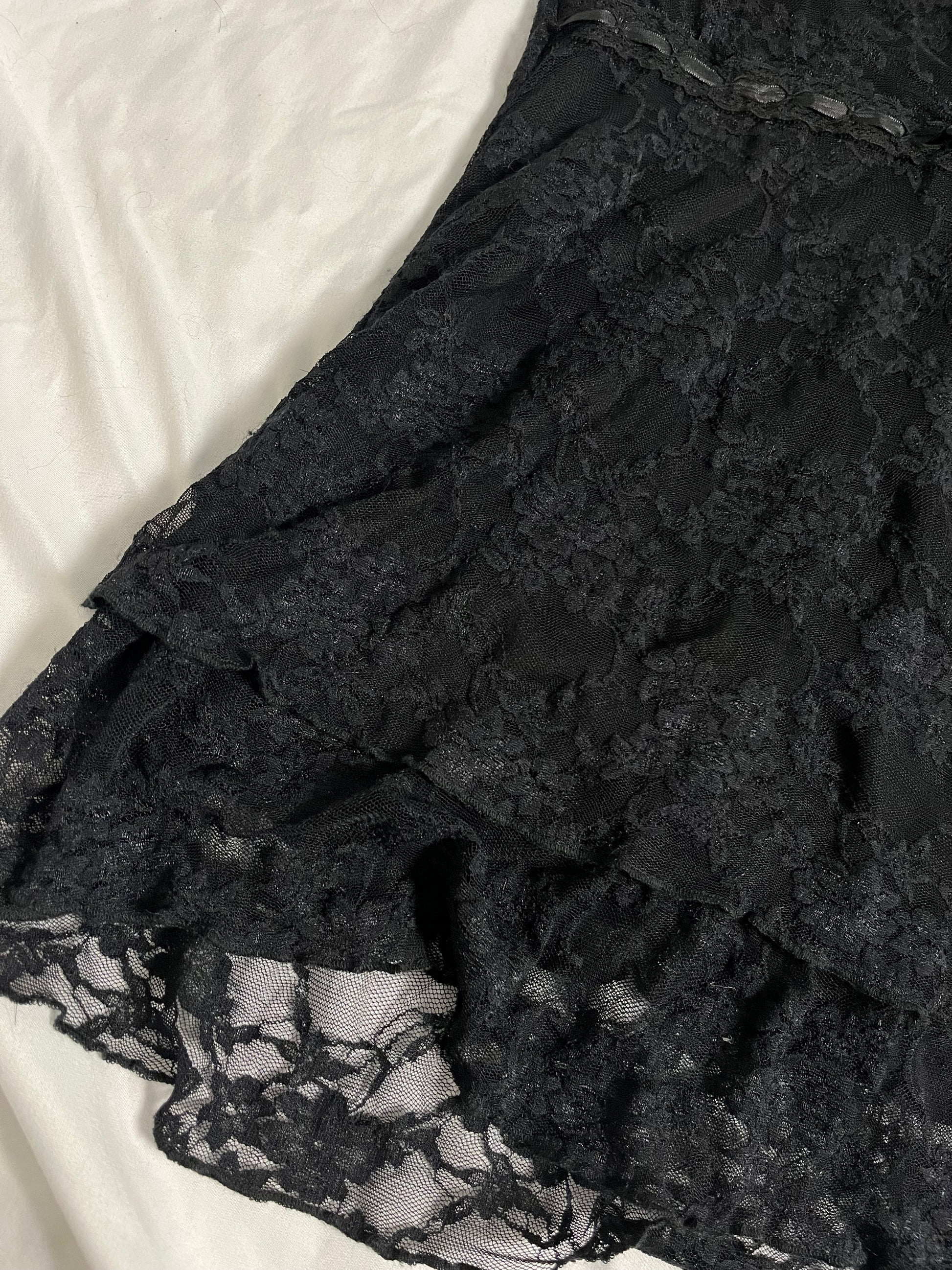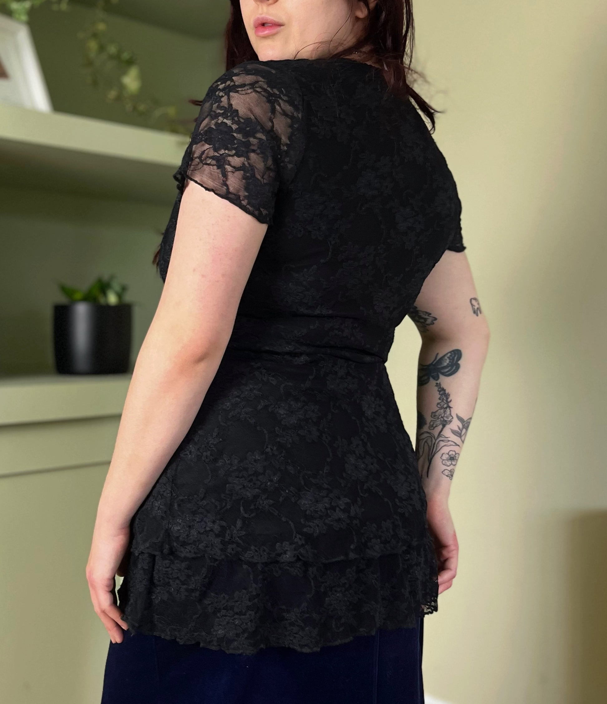 2000s black lacey babydoll style top! This has a stretchy fit and a babydoll style design.