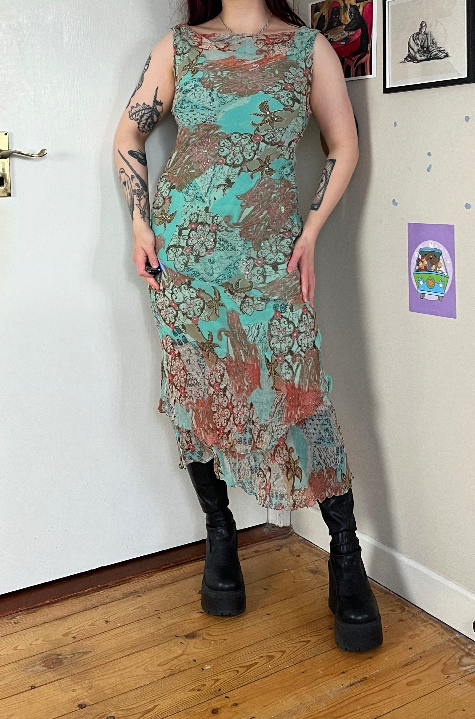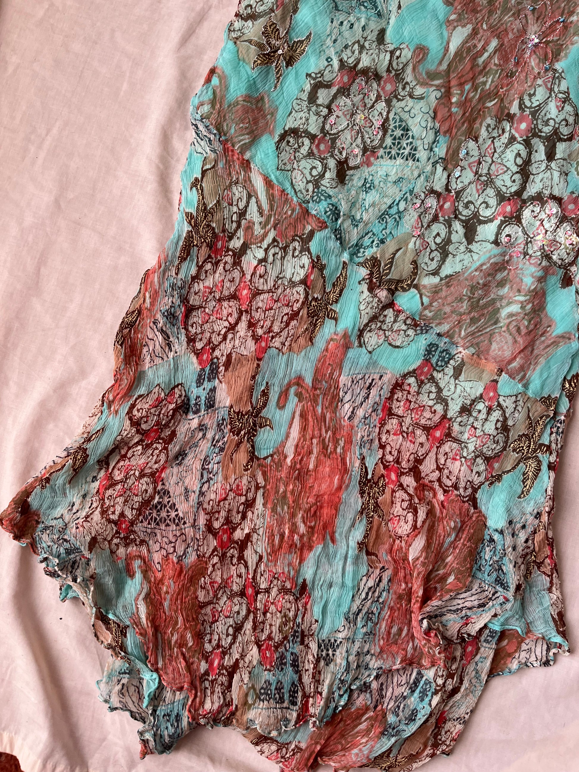 1990s coral pink and sea blue chiffon dress! This gives me such mermaid vibes! Material clings to the body for a flattering fit and has lots of stretch.