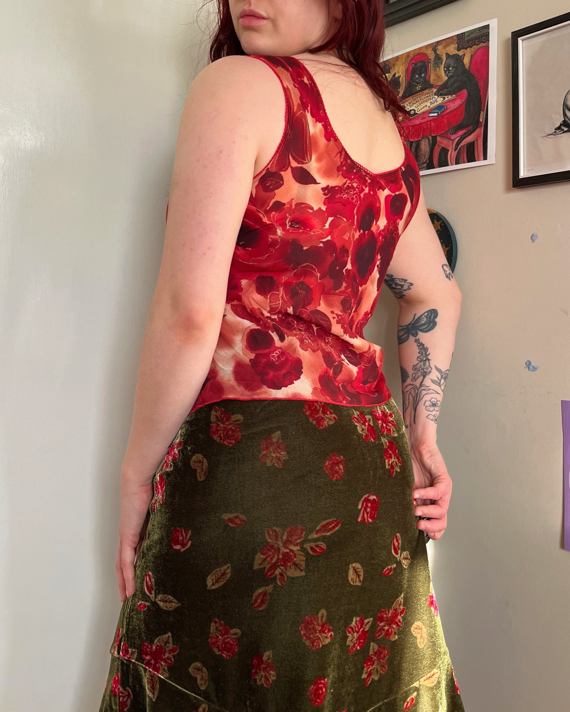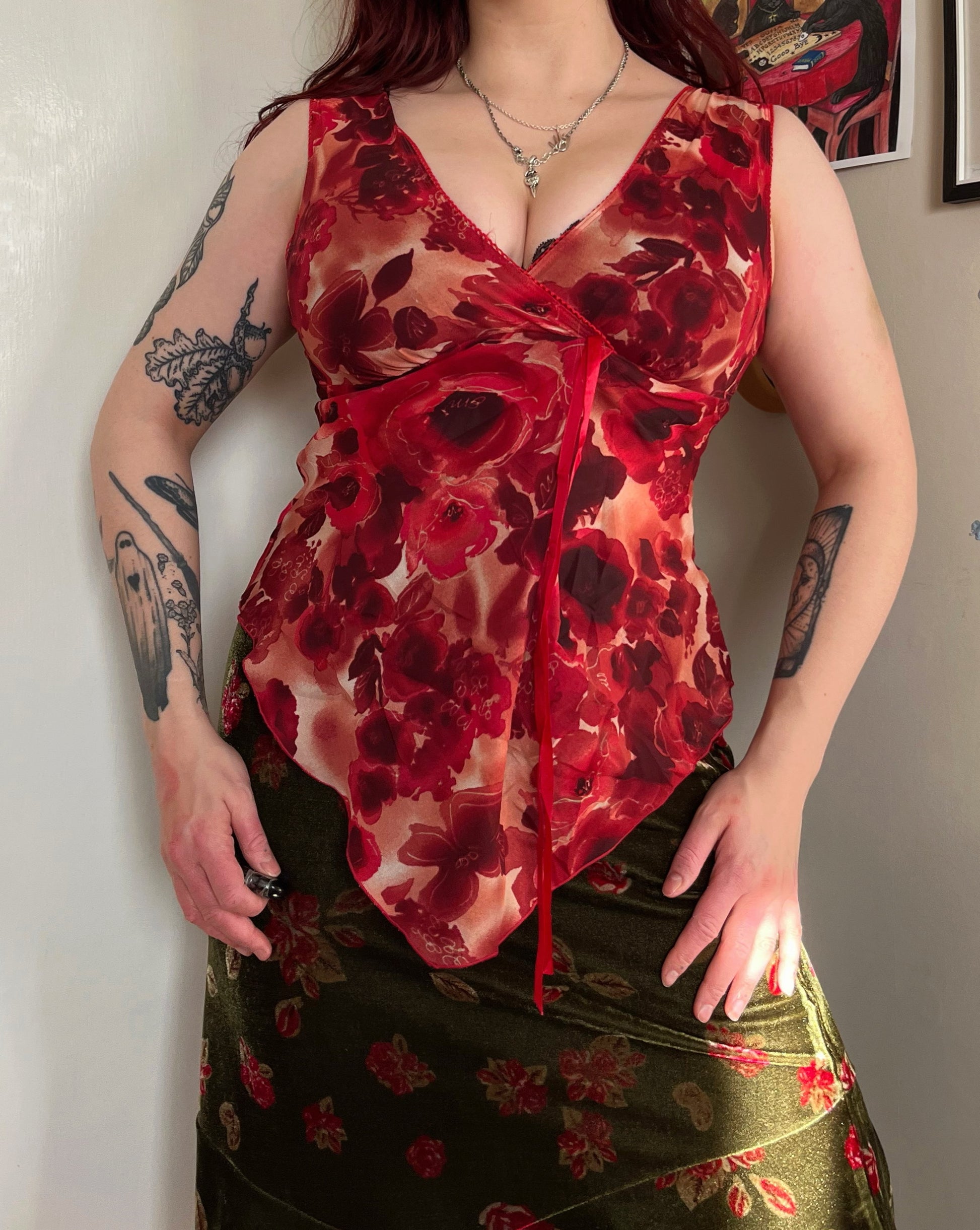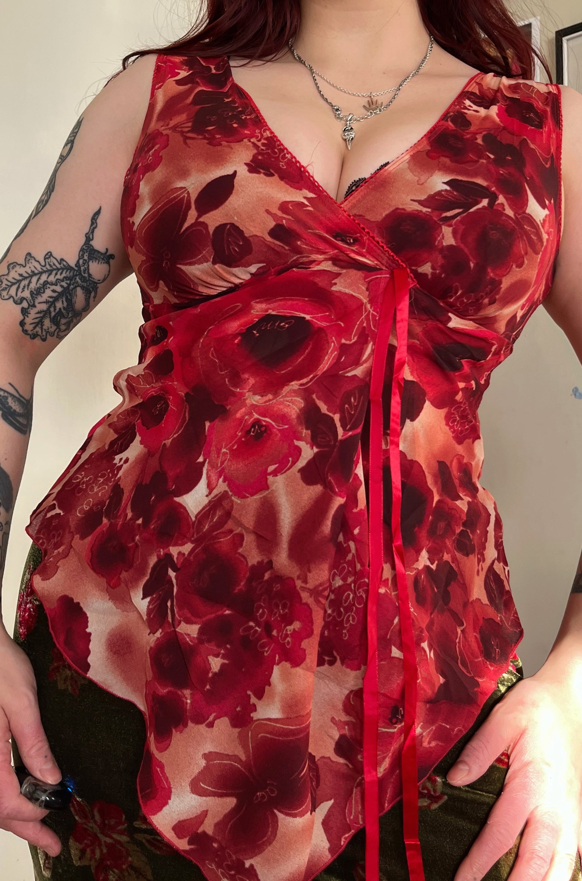 Gorgeous 2000s red floral mesh top! Flattering fit with an asymmetrical hem.