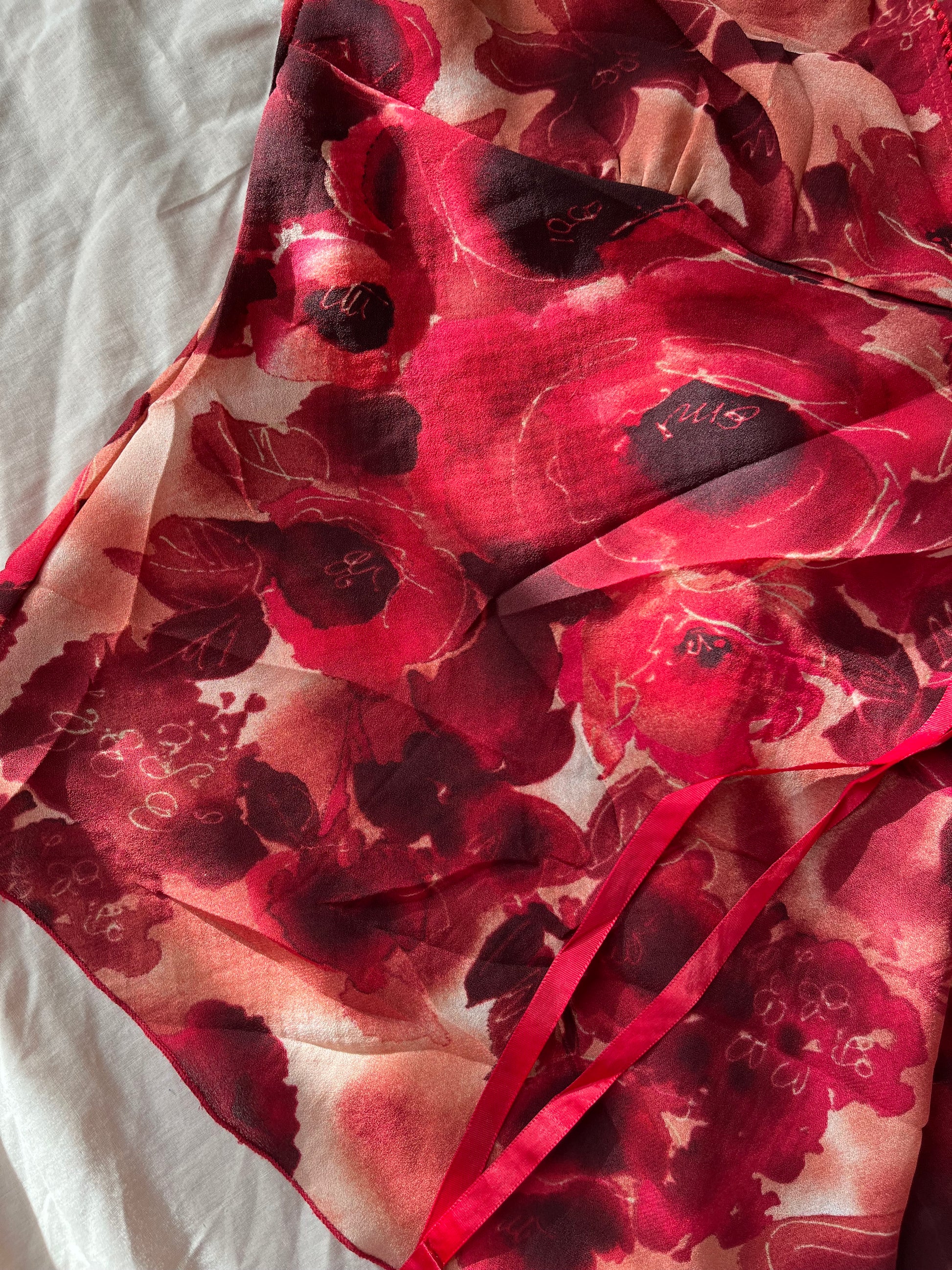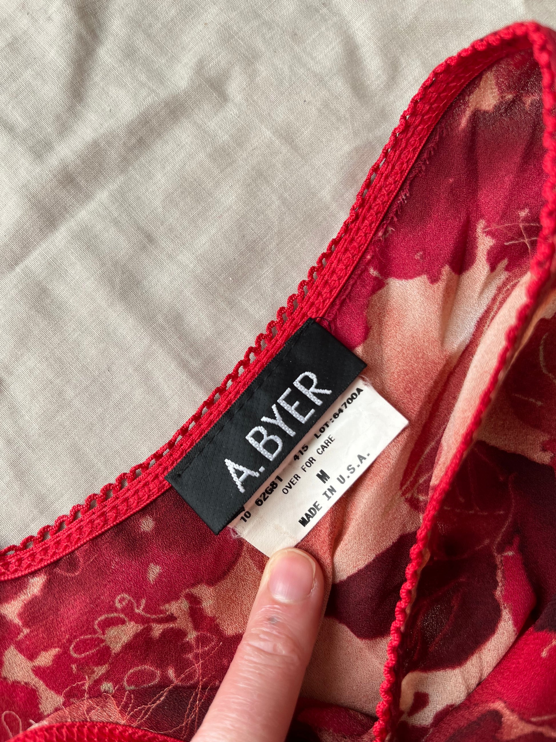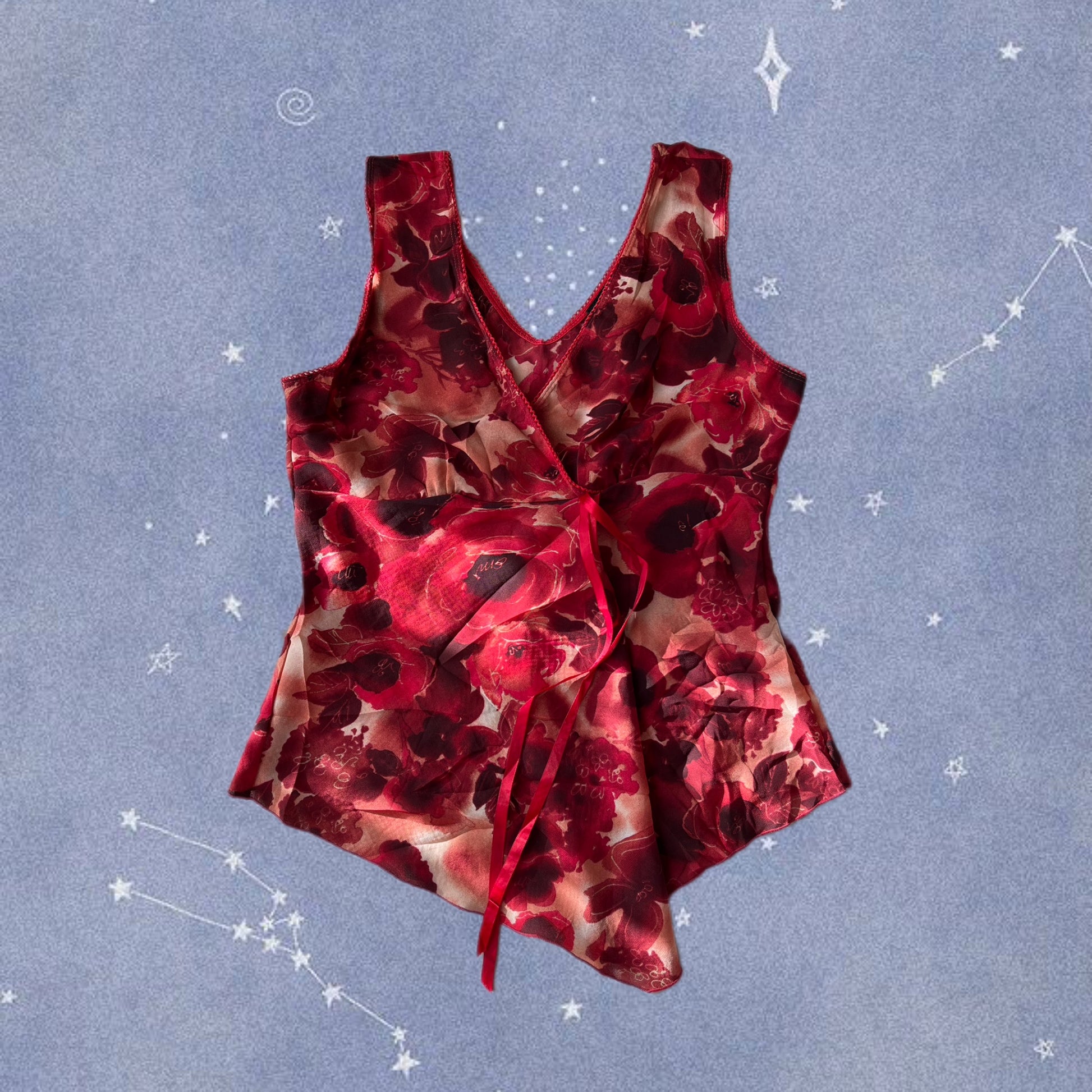 Gorgeous 2000s red floral mesh top! Flattering fit with an asymmetrical hem.