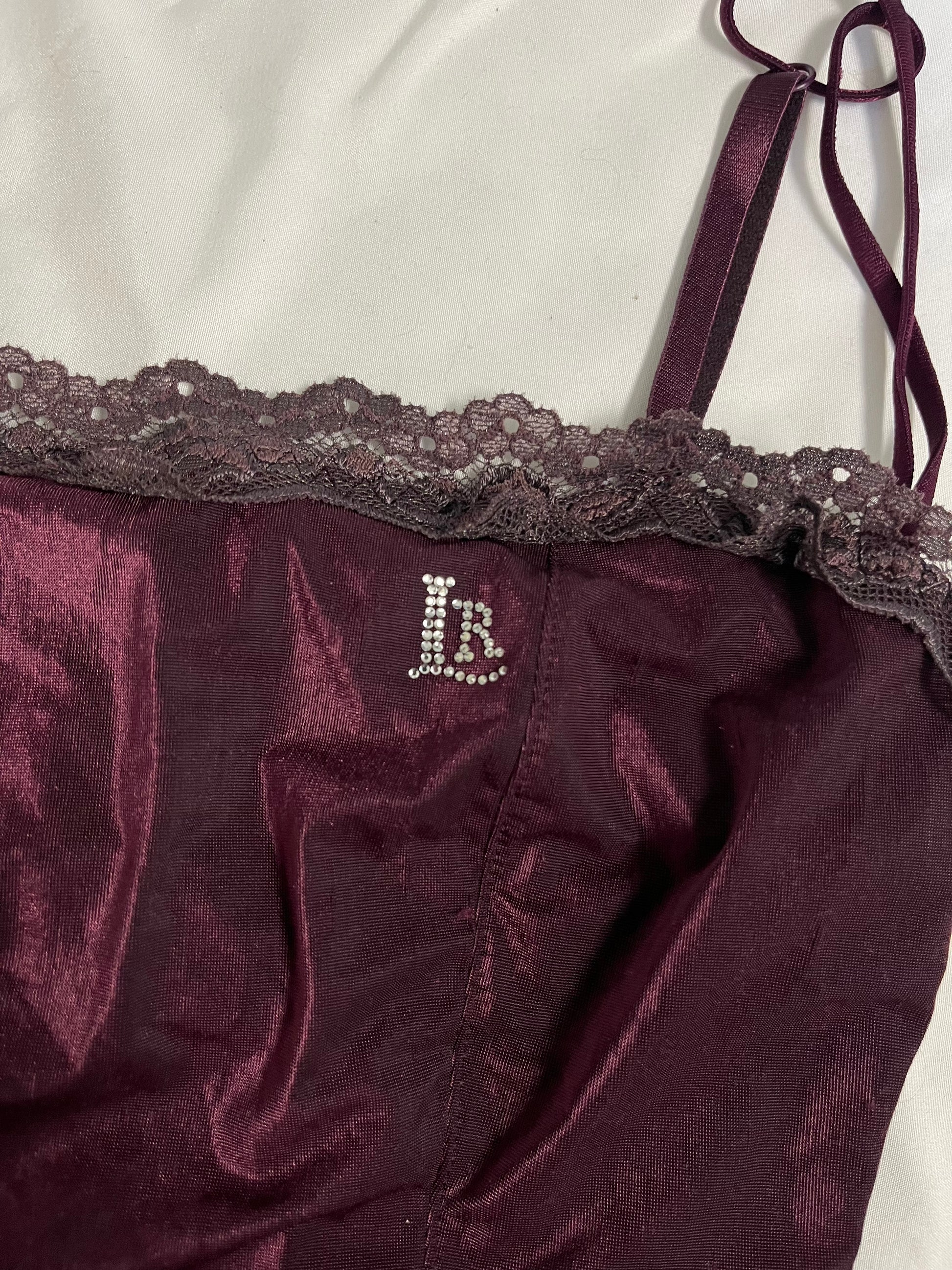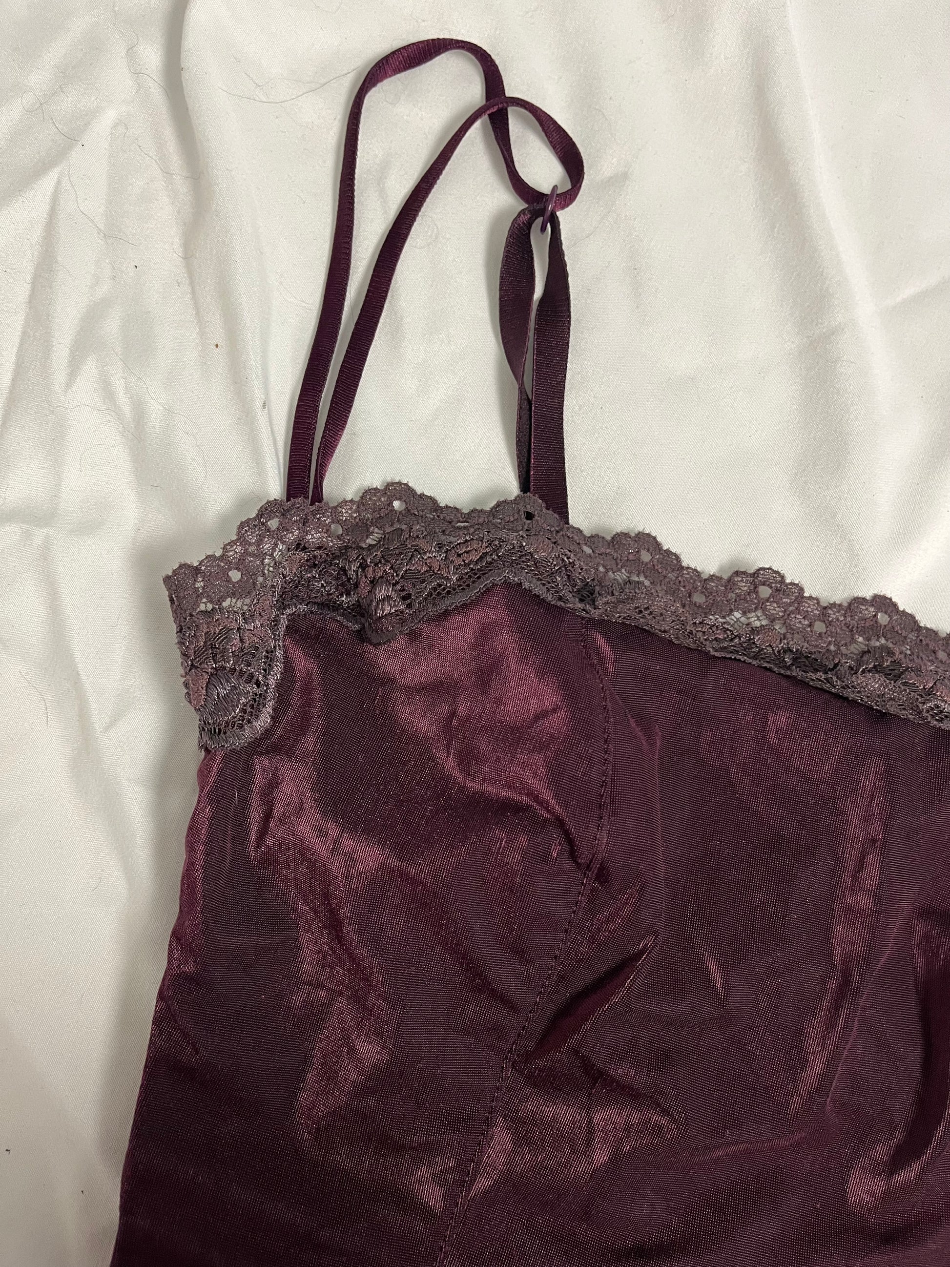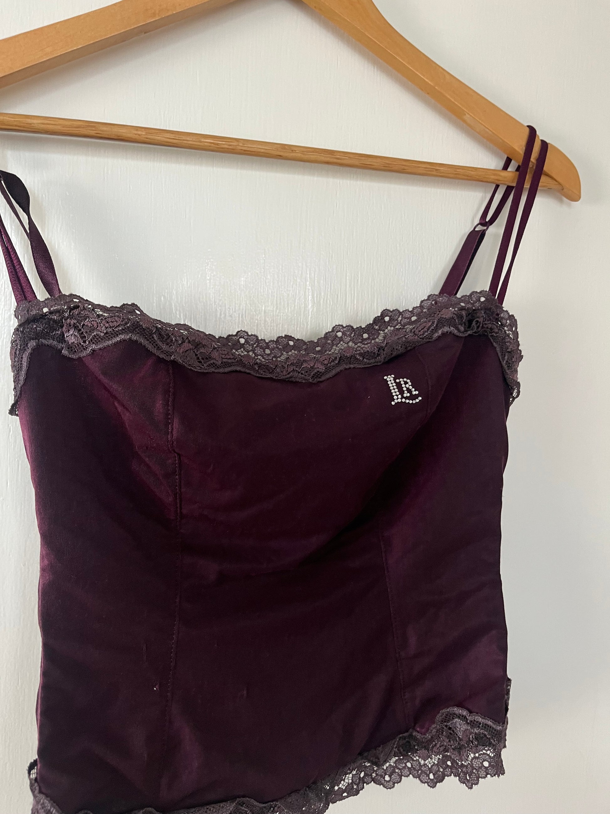 2000s purple cami top! This has a stretchy fit with boning throughout for a structured fit and a satin like feel.