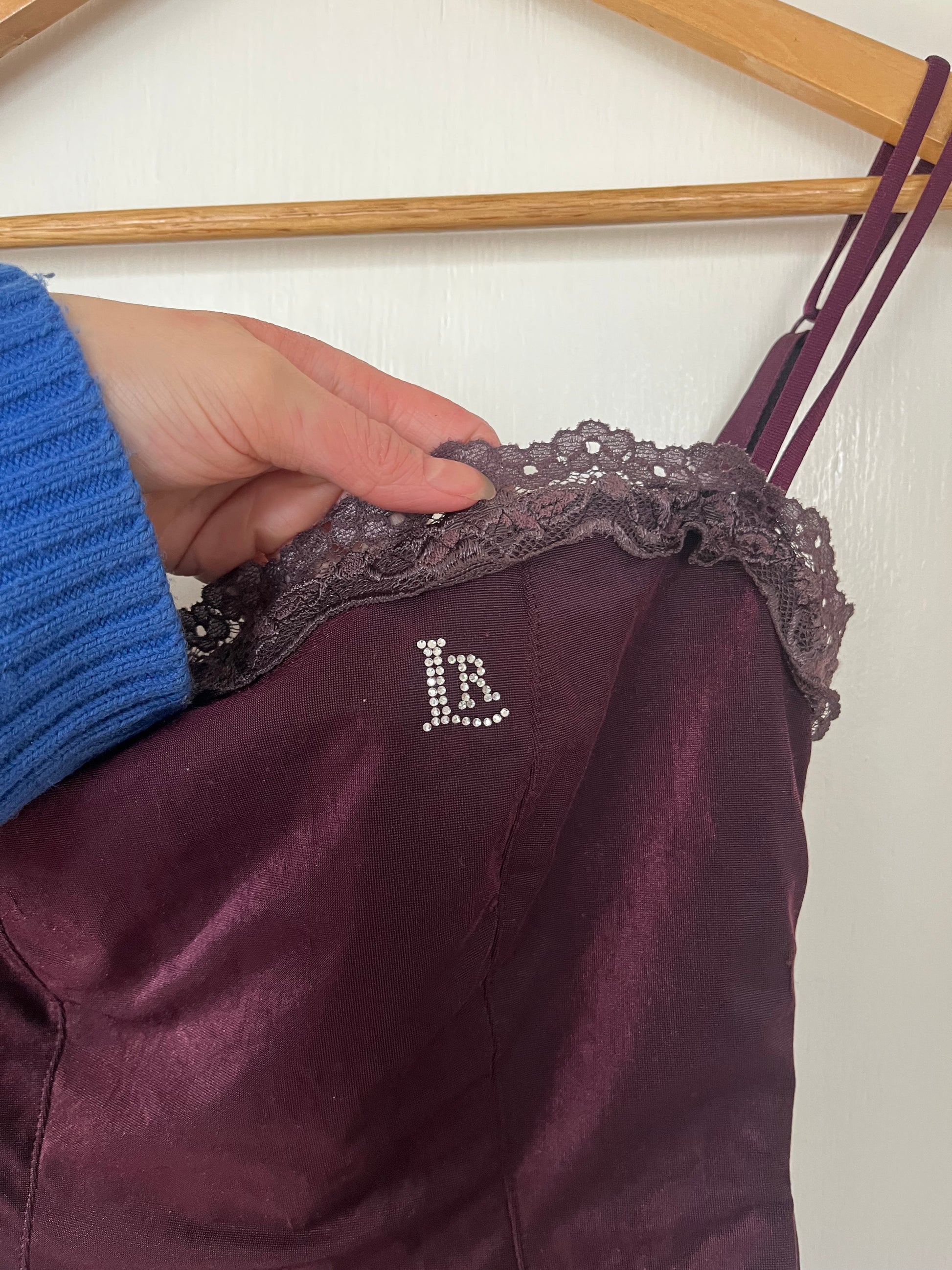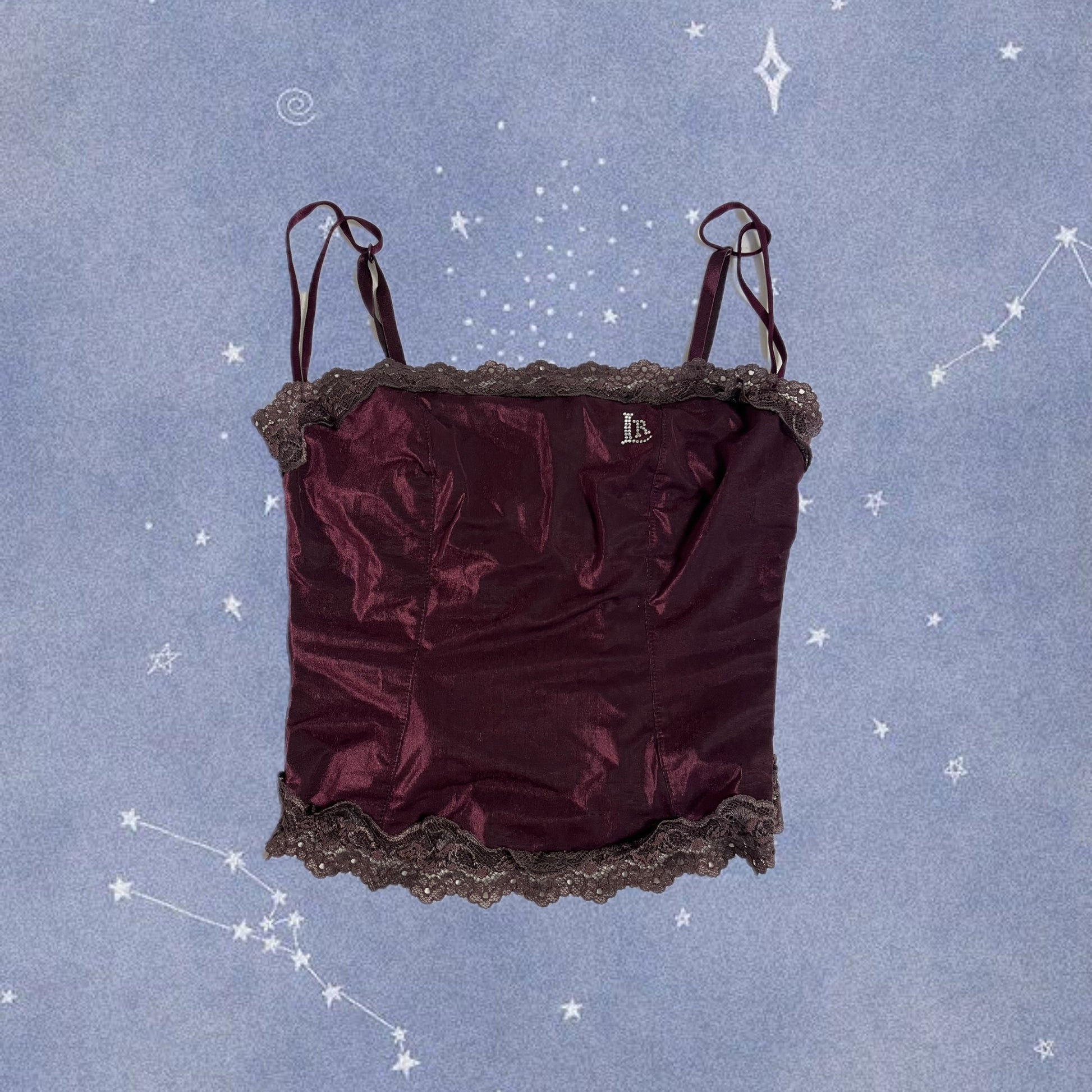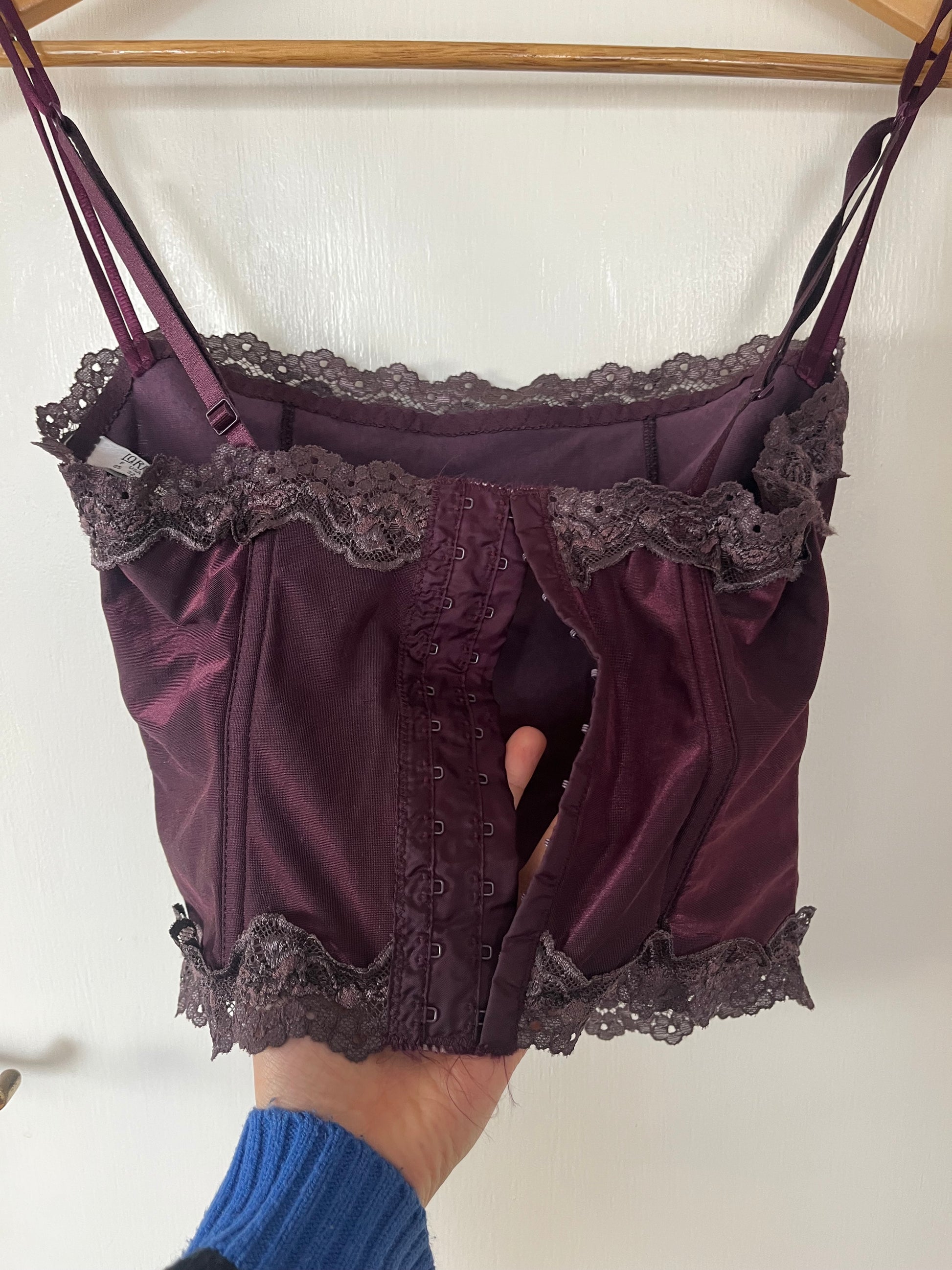 2000s purple cami top! This has a stretchy fit with boning throughout for a structured fit and a satin like feel.
