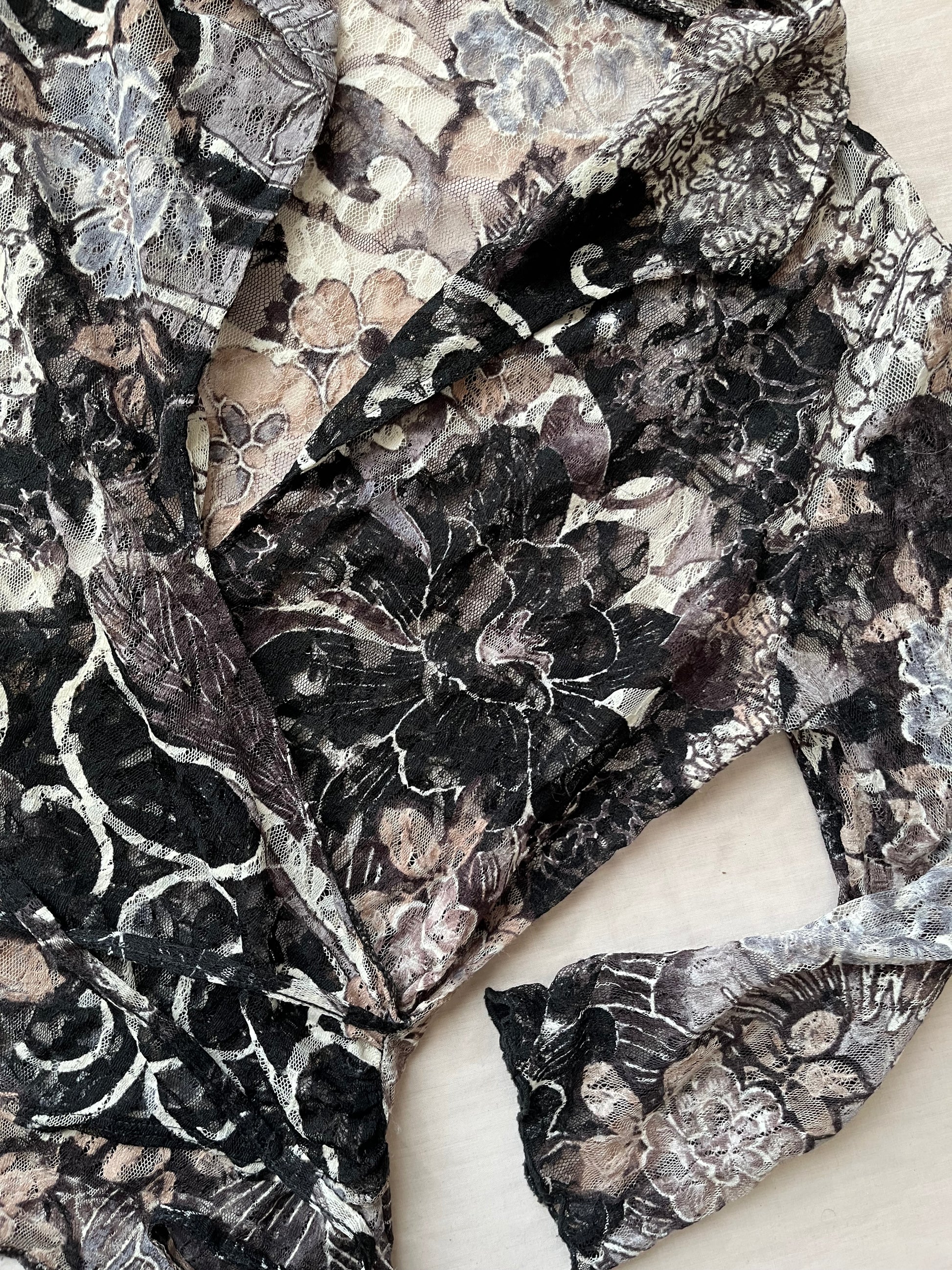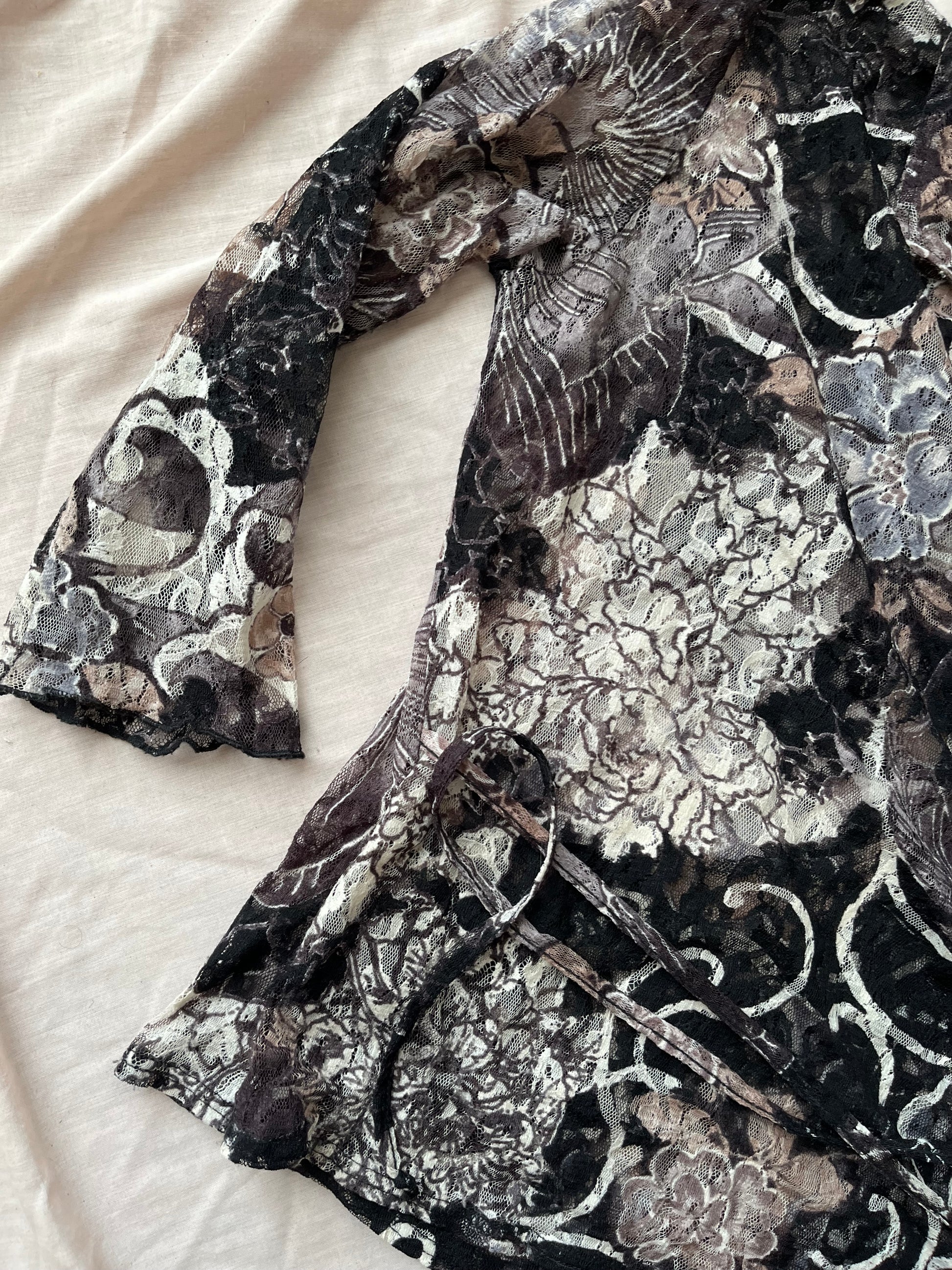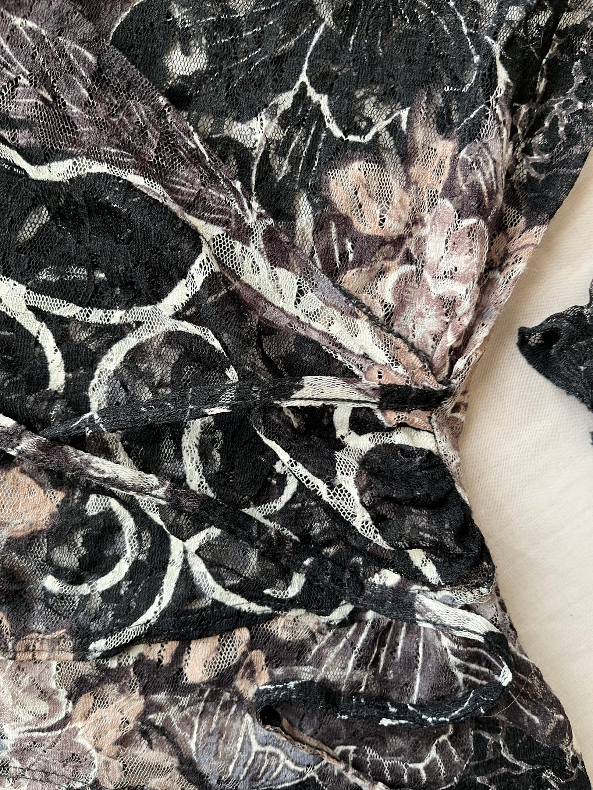 Amazing 2000s brown, black and white patterned lace top! Wrap style top with a flattering fit.