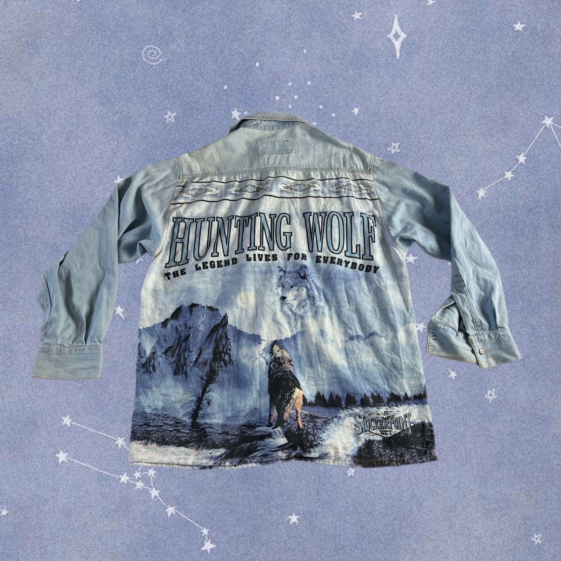 1990s wolf themed shirt. Button up front with a big design on the back.