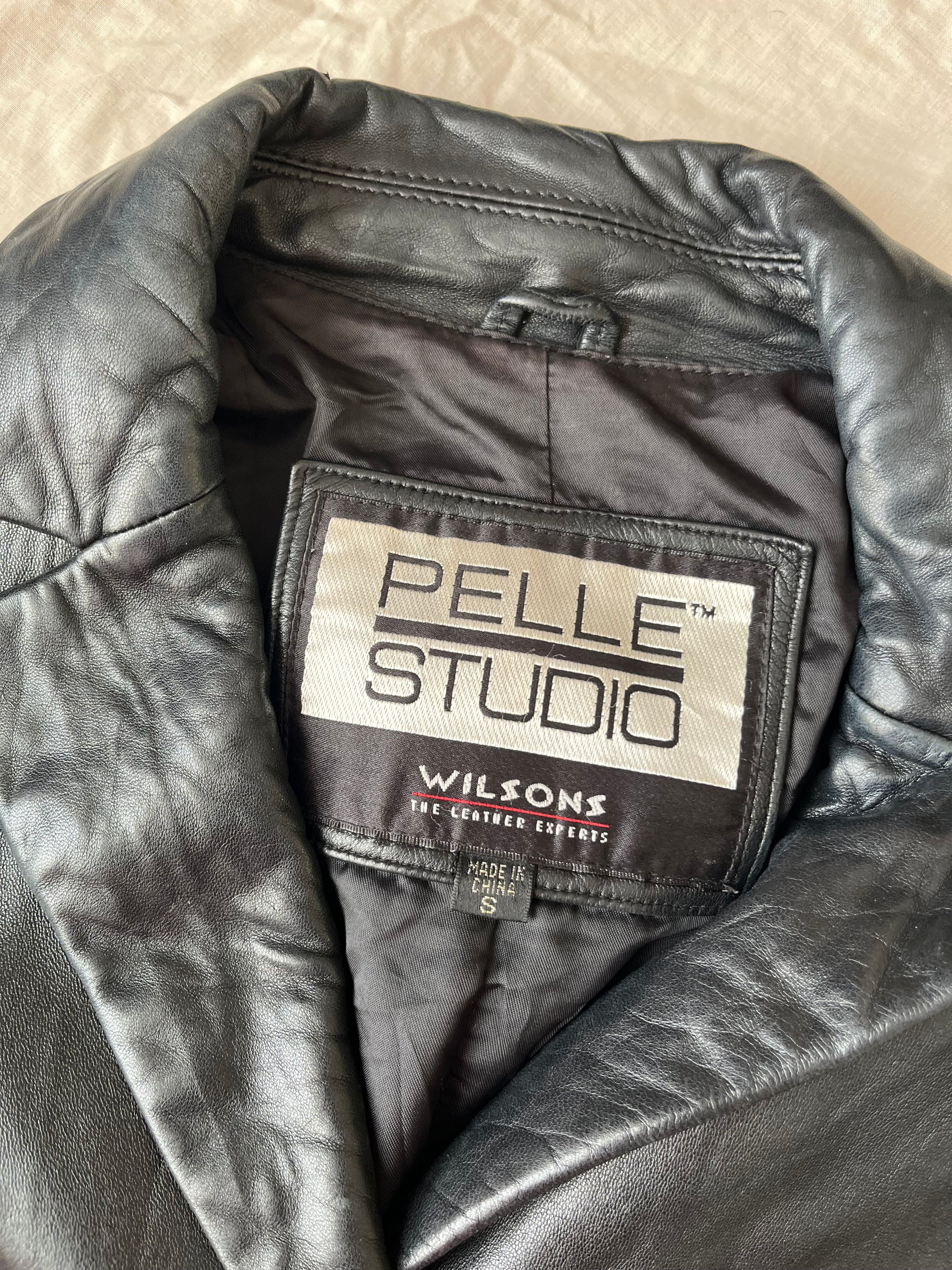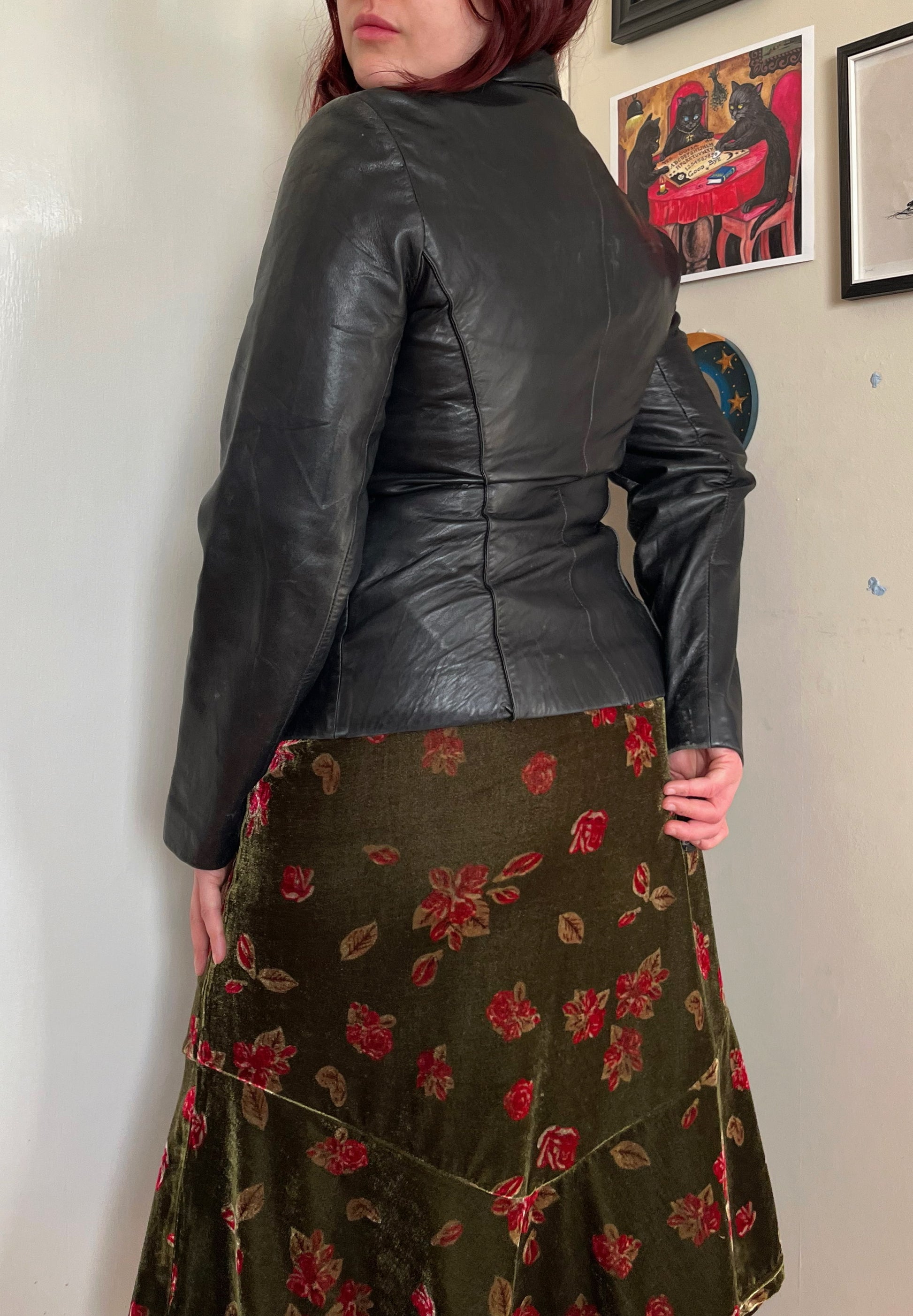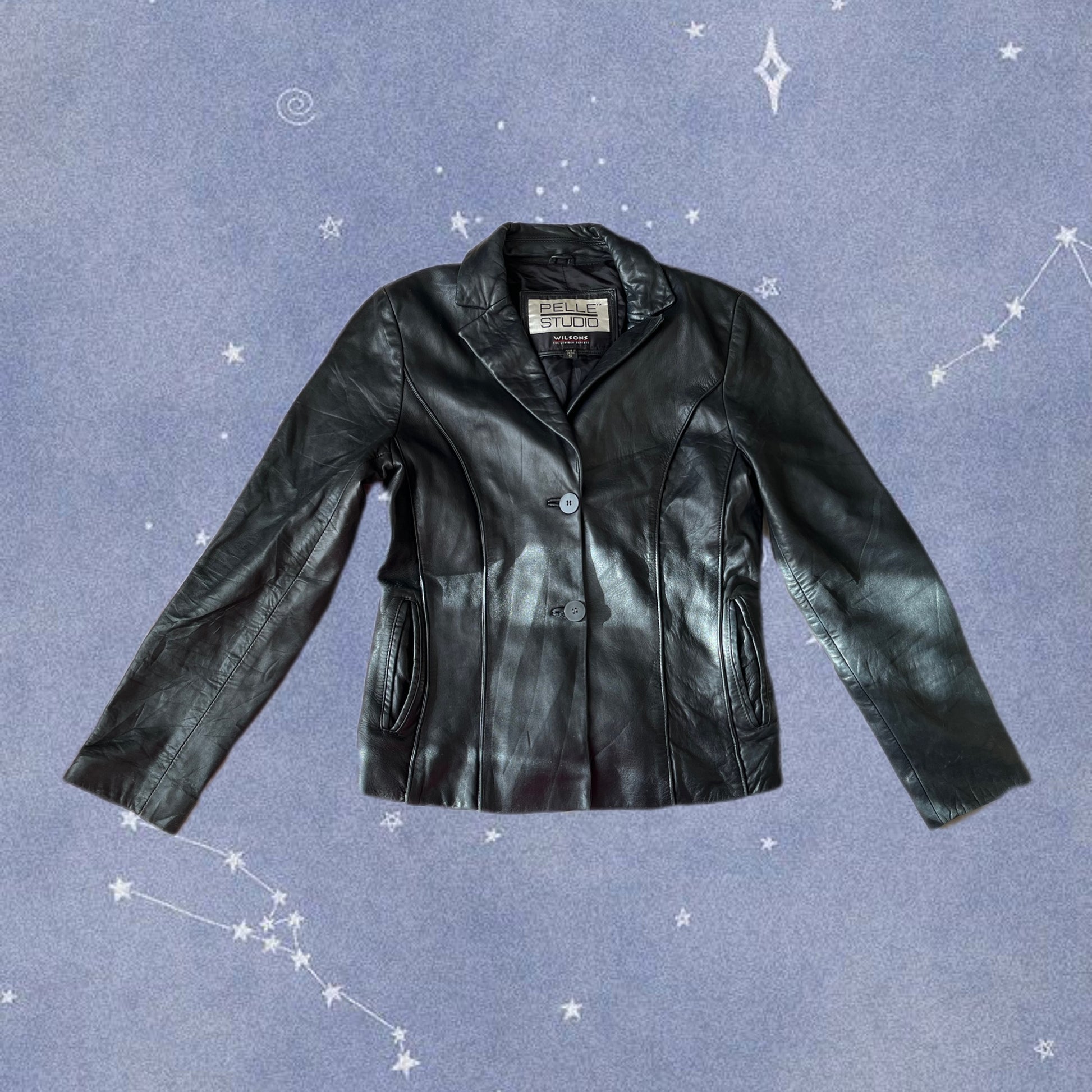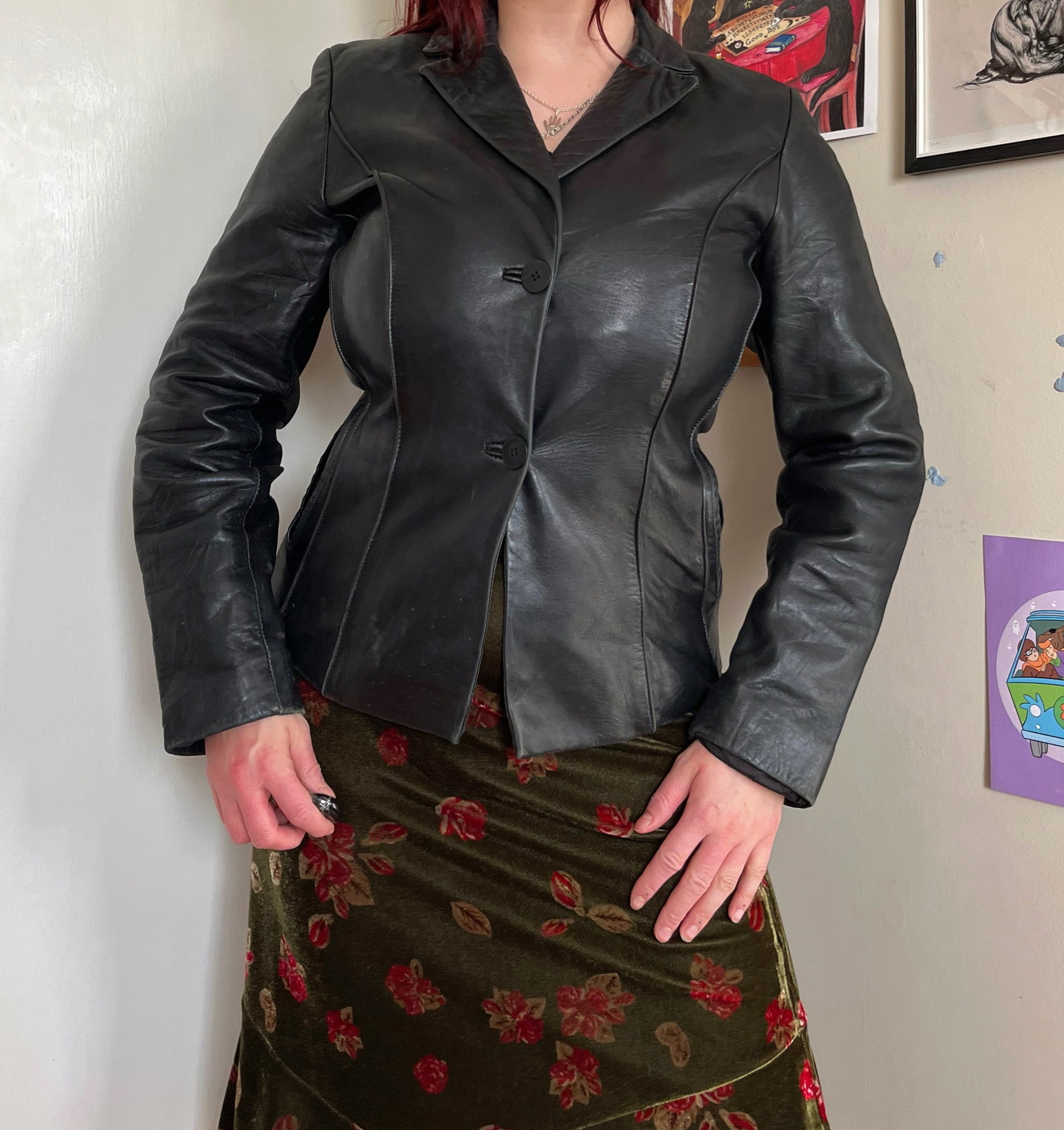 1990s black leather jacket! Flattering fit with two buttons on the front.