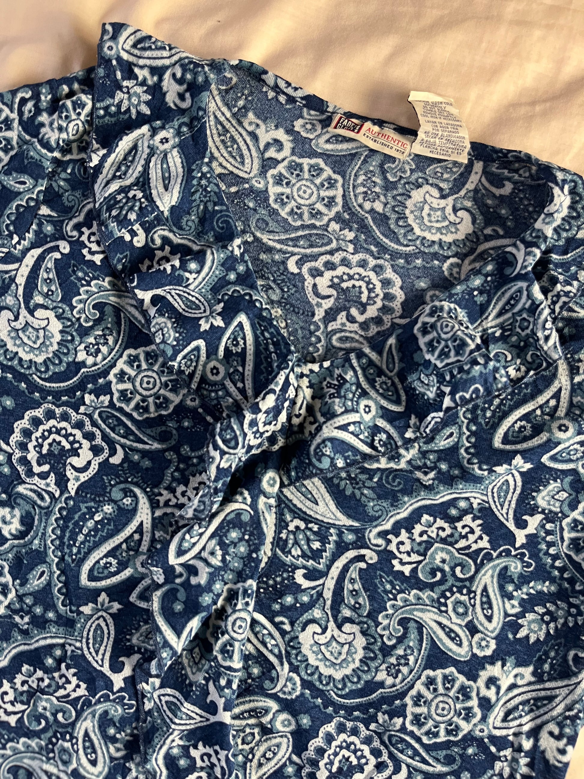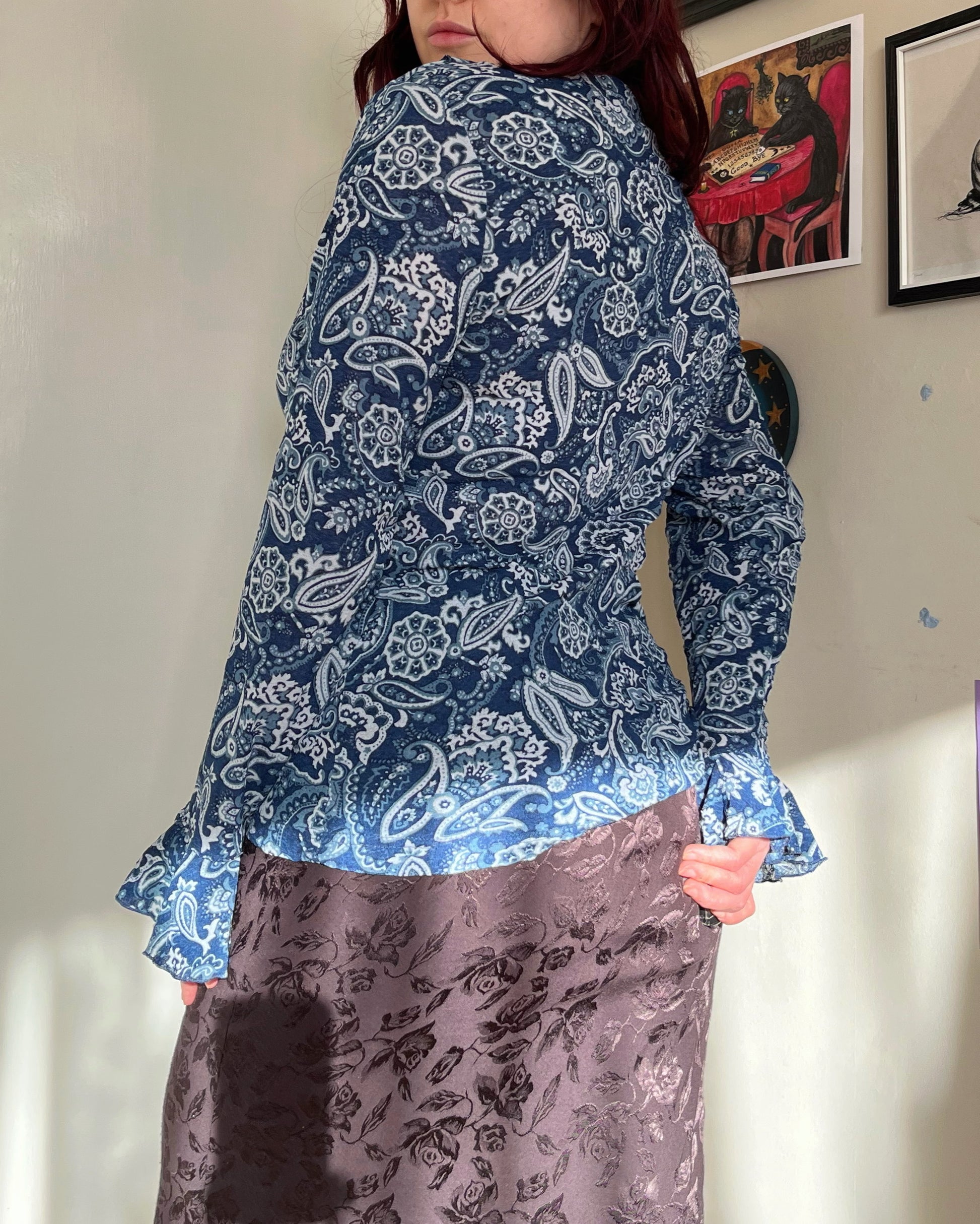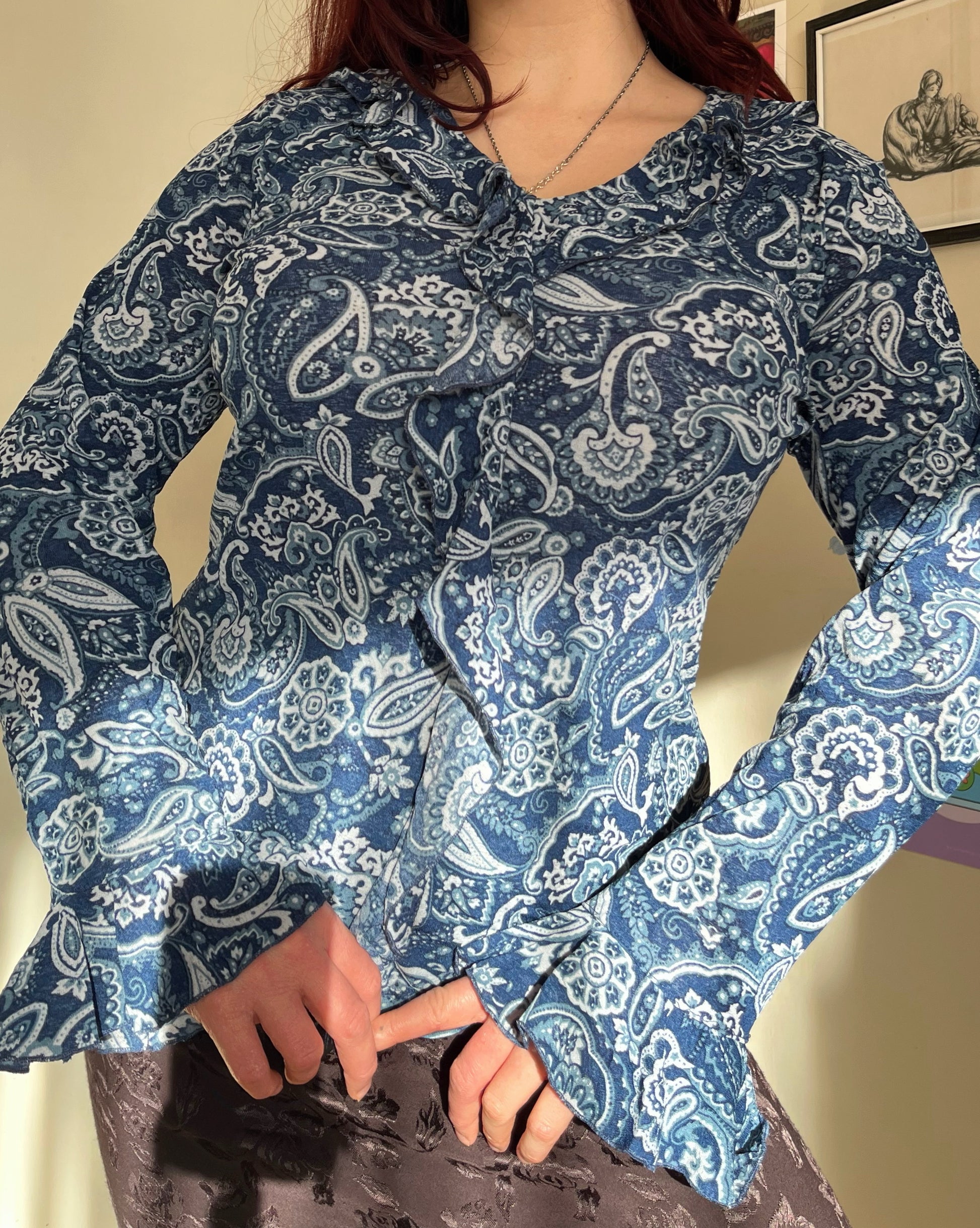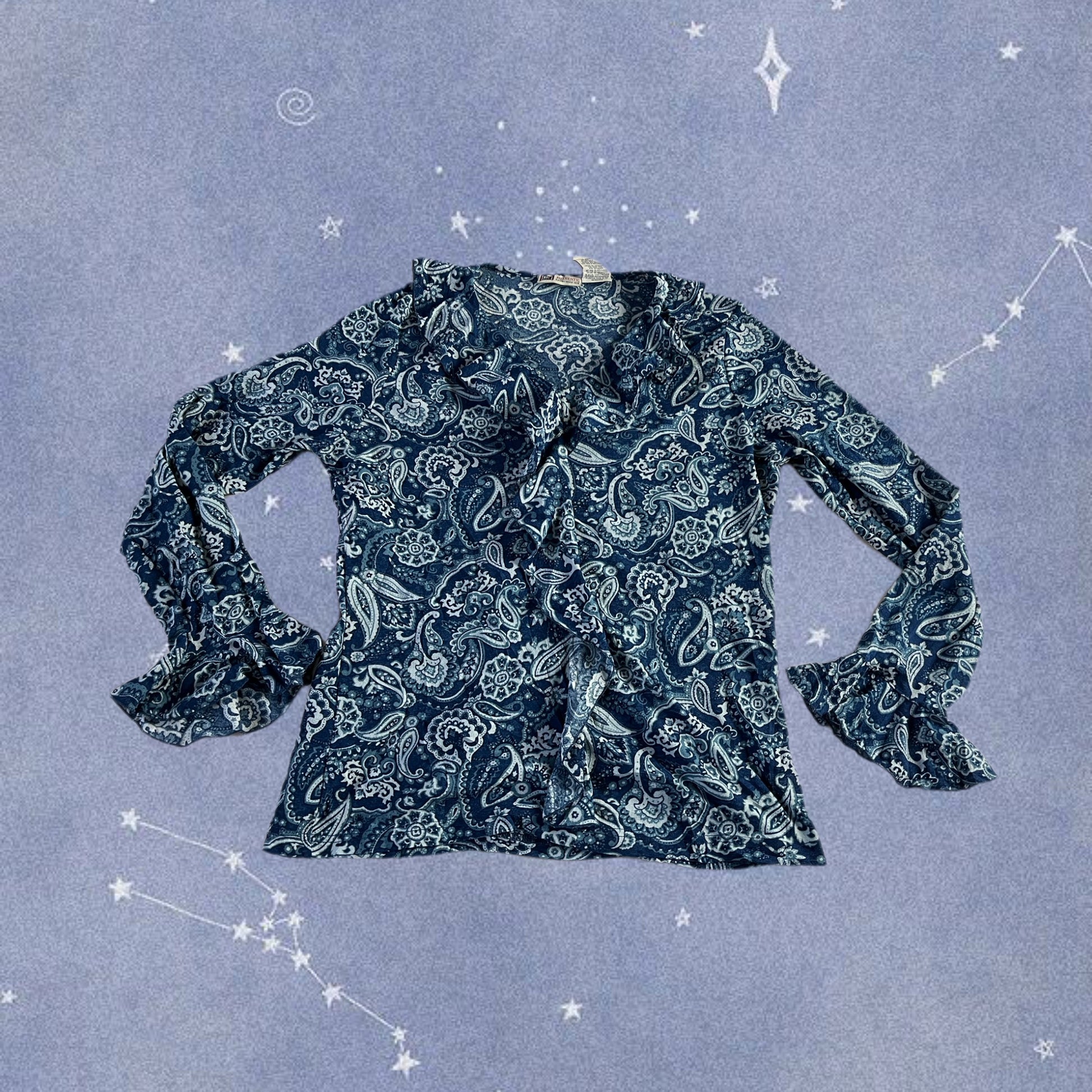2000s blue mesh paisley pattern top! Slightly flared sleeves, stretchy fit and ruffles on the front.