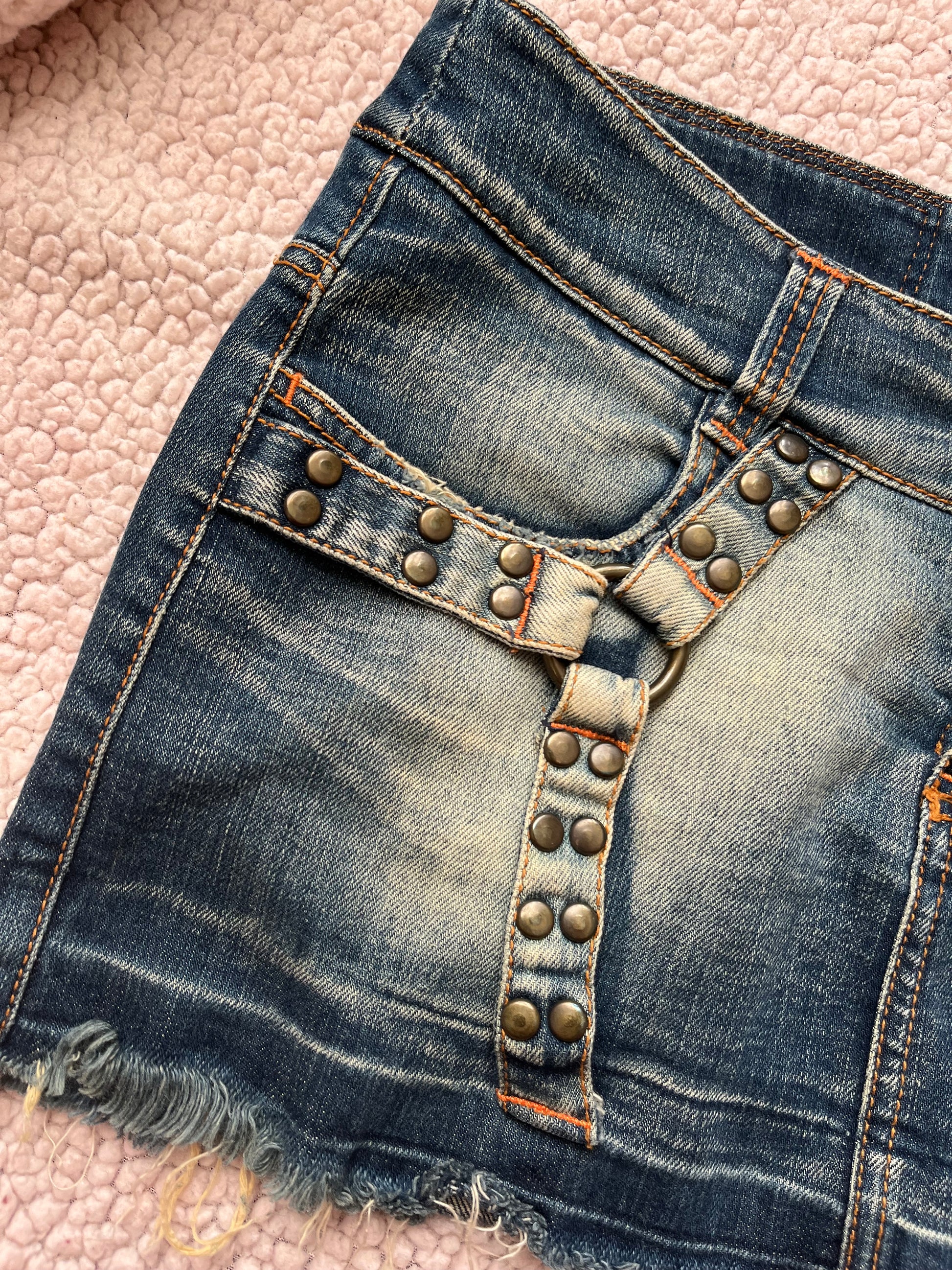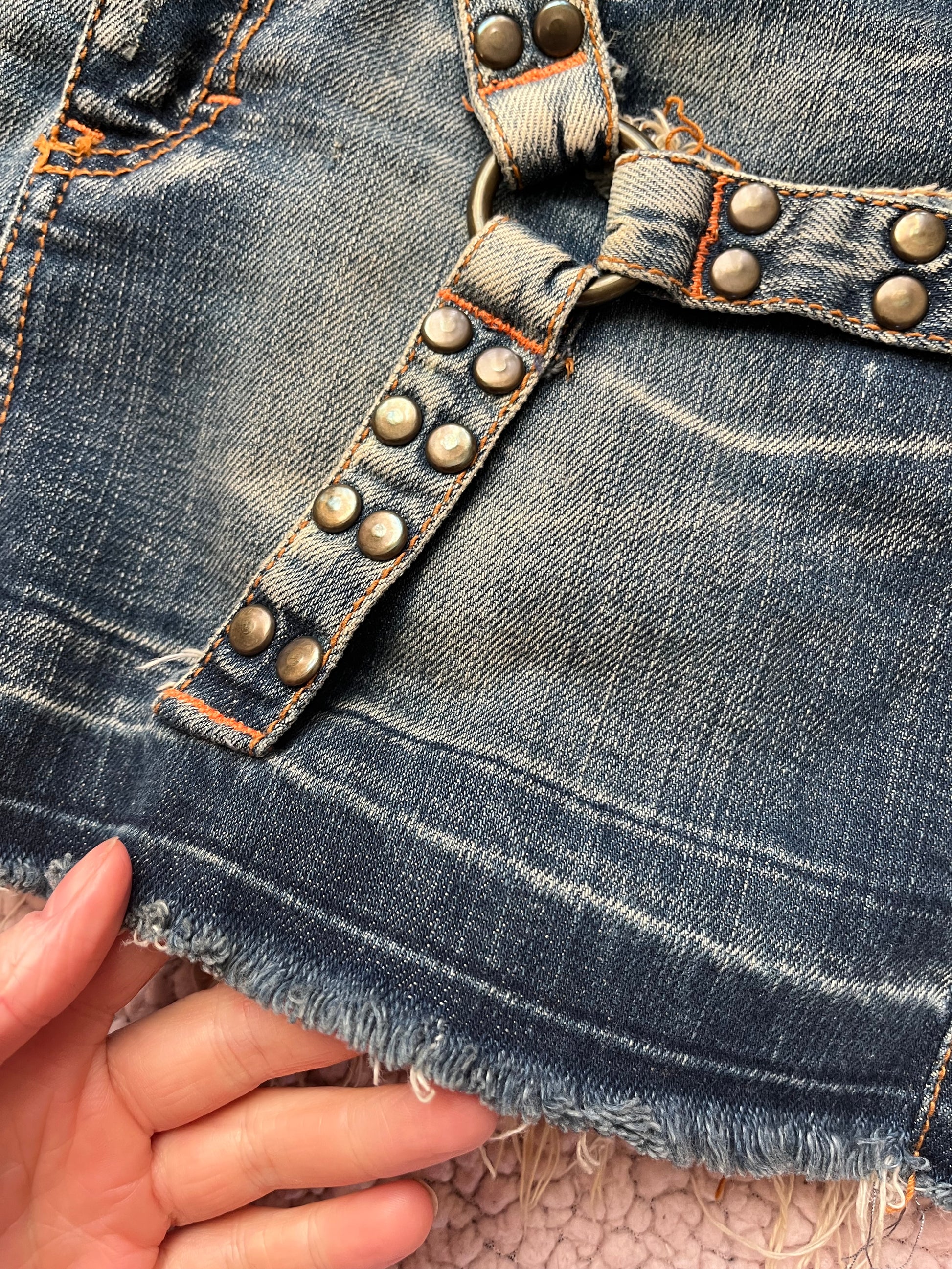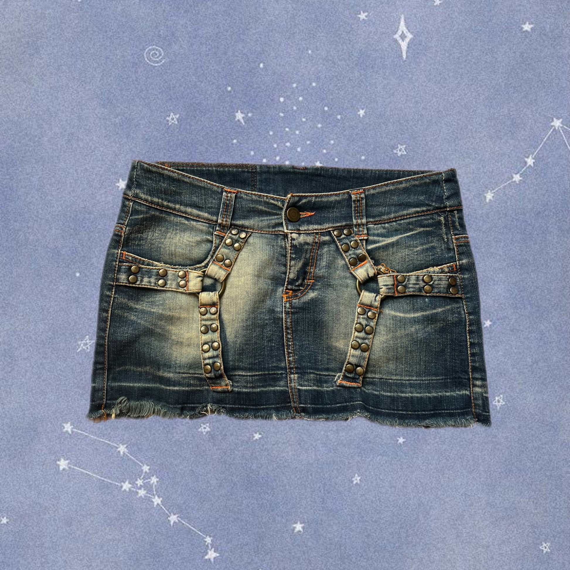 2000s denim mini skirt! Low waisted with a cool buckle design all over.