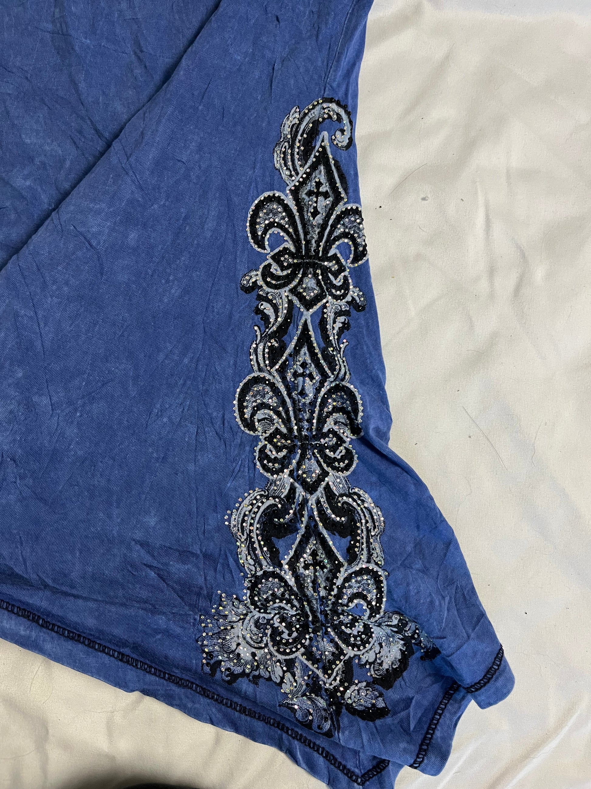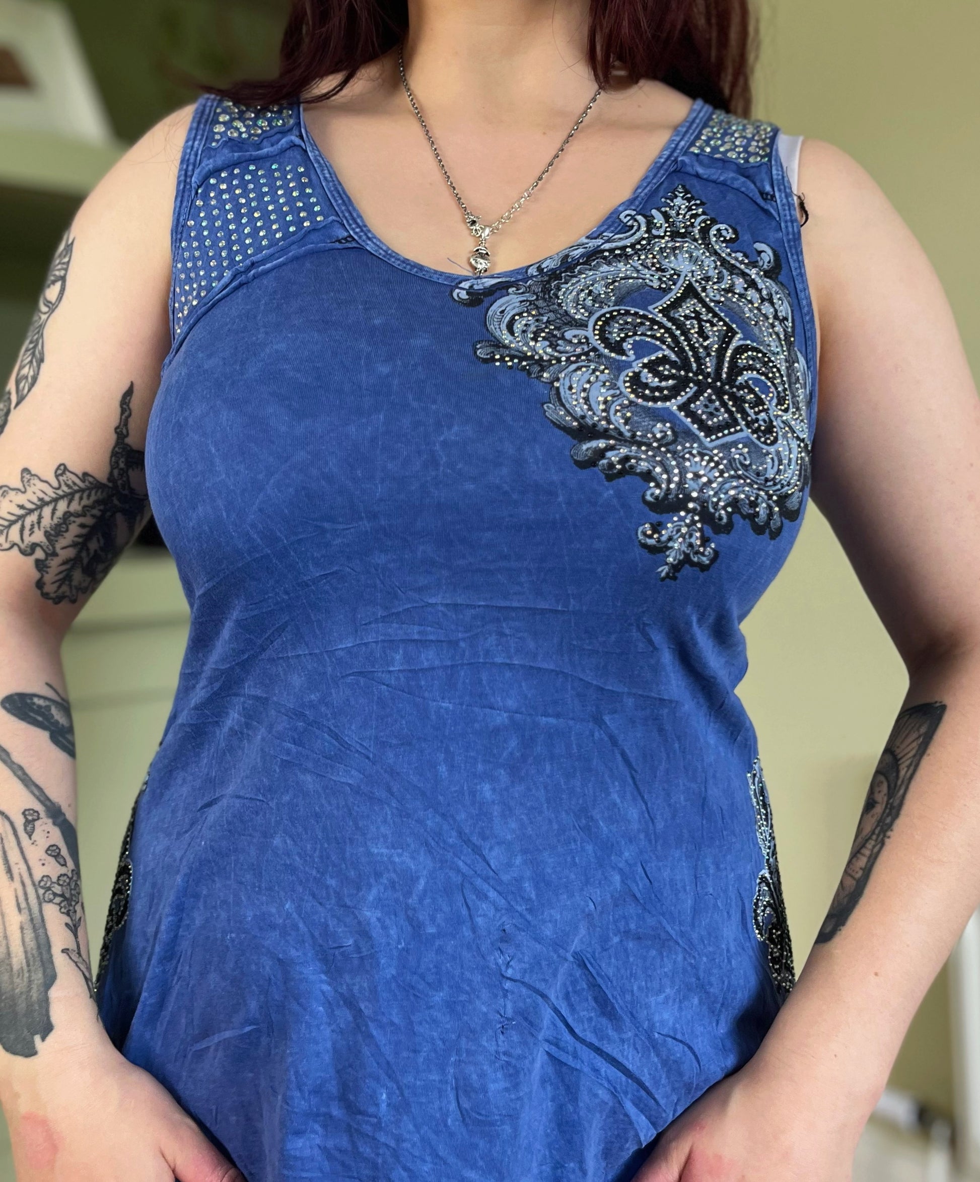 2000s sleeveless long gothic top! Features an asymmetrical hem and a design on the front and back.