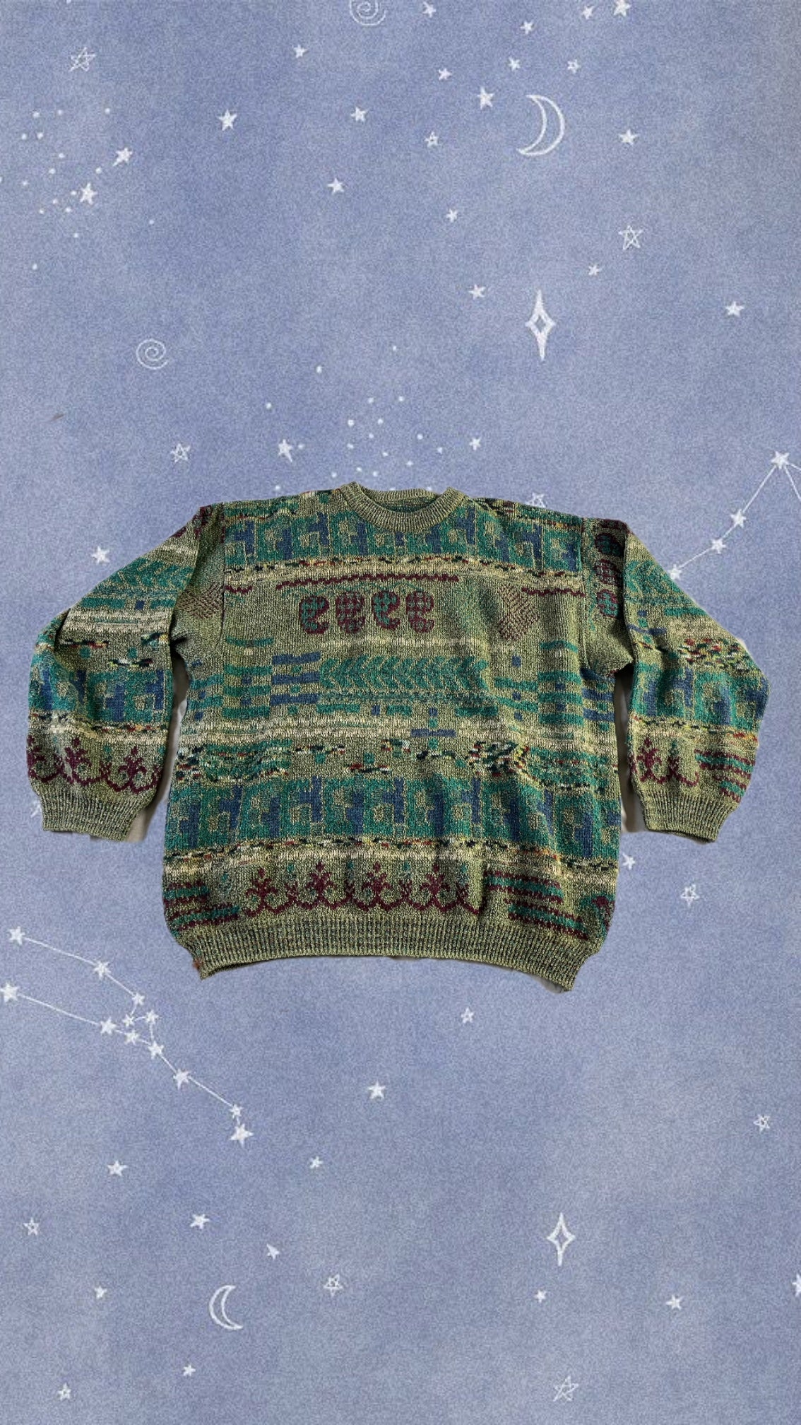 Gorgeous 90s green, blue, and red patterned jumper! Super cosy and slouchy, chunky fit. In perfect vintage condition and would best fit UK 10-22 depending on desired fit. Made from viscose, polyester and wool.