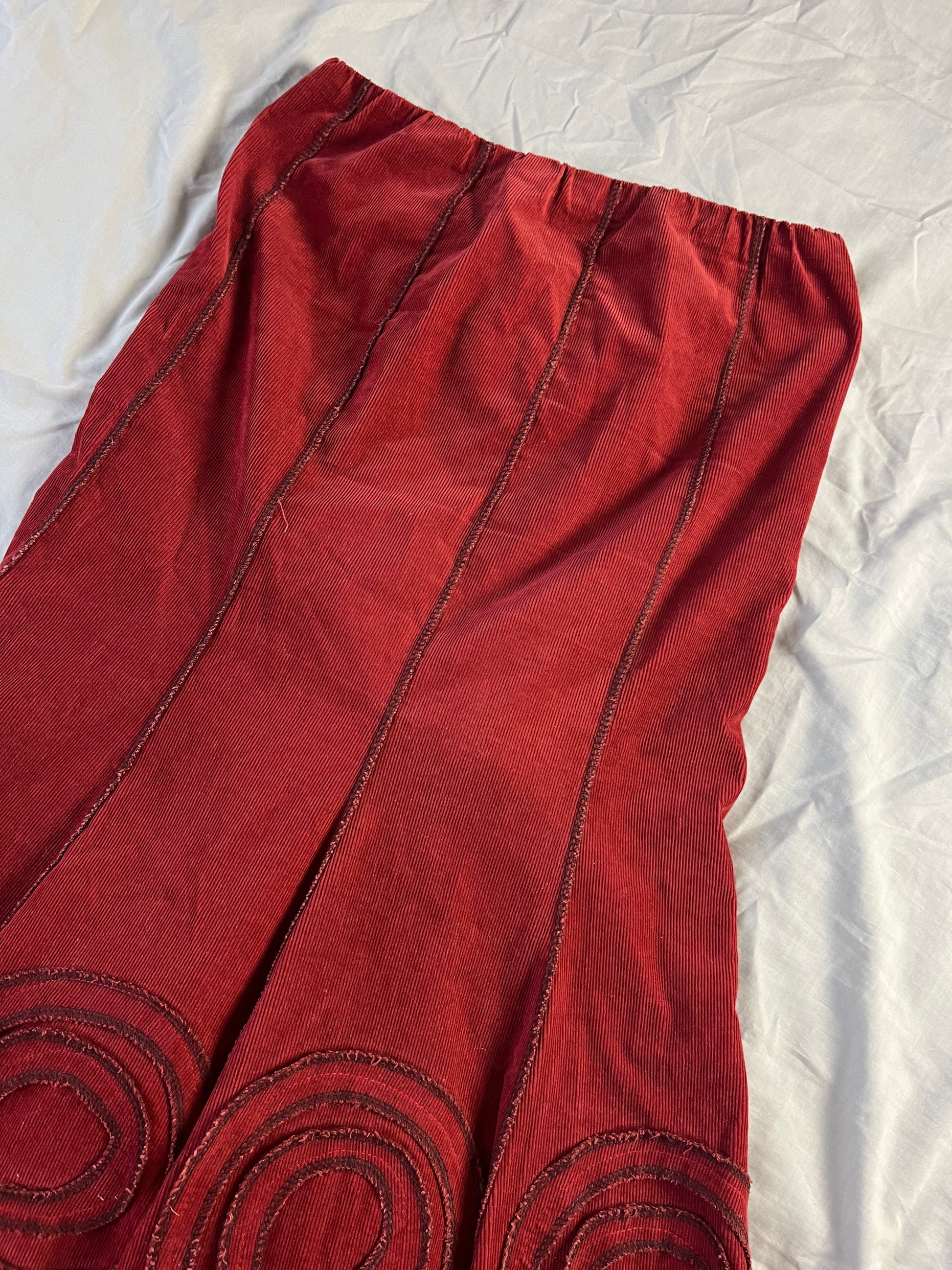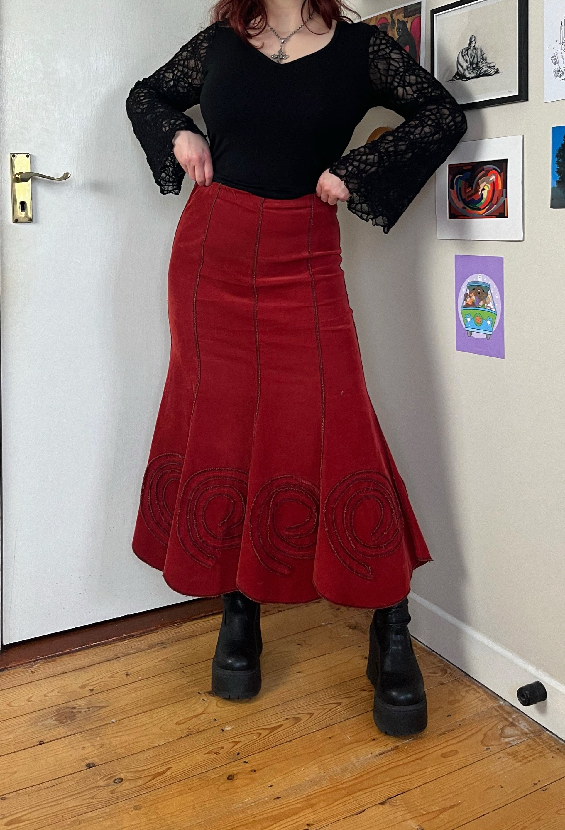 Stunning 1990s deep red corduroy maxi skirt! This has a mermaid fit with a spiral pattern on the hem and a stretchy waist. In perfect vintage condition and would best fit UK 14-18.