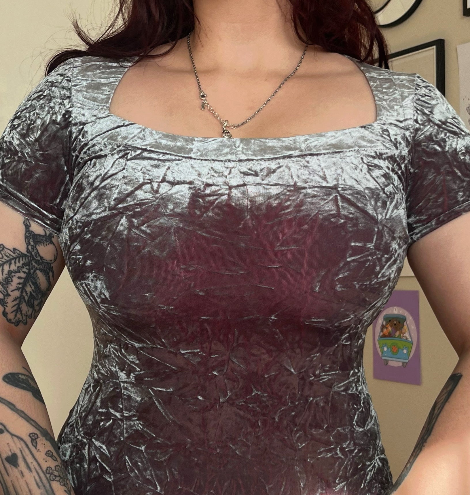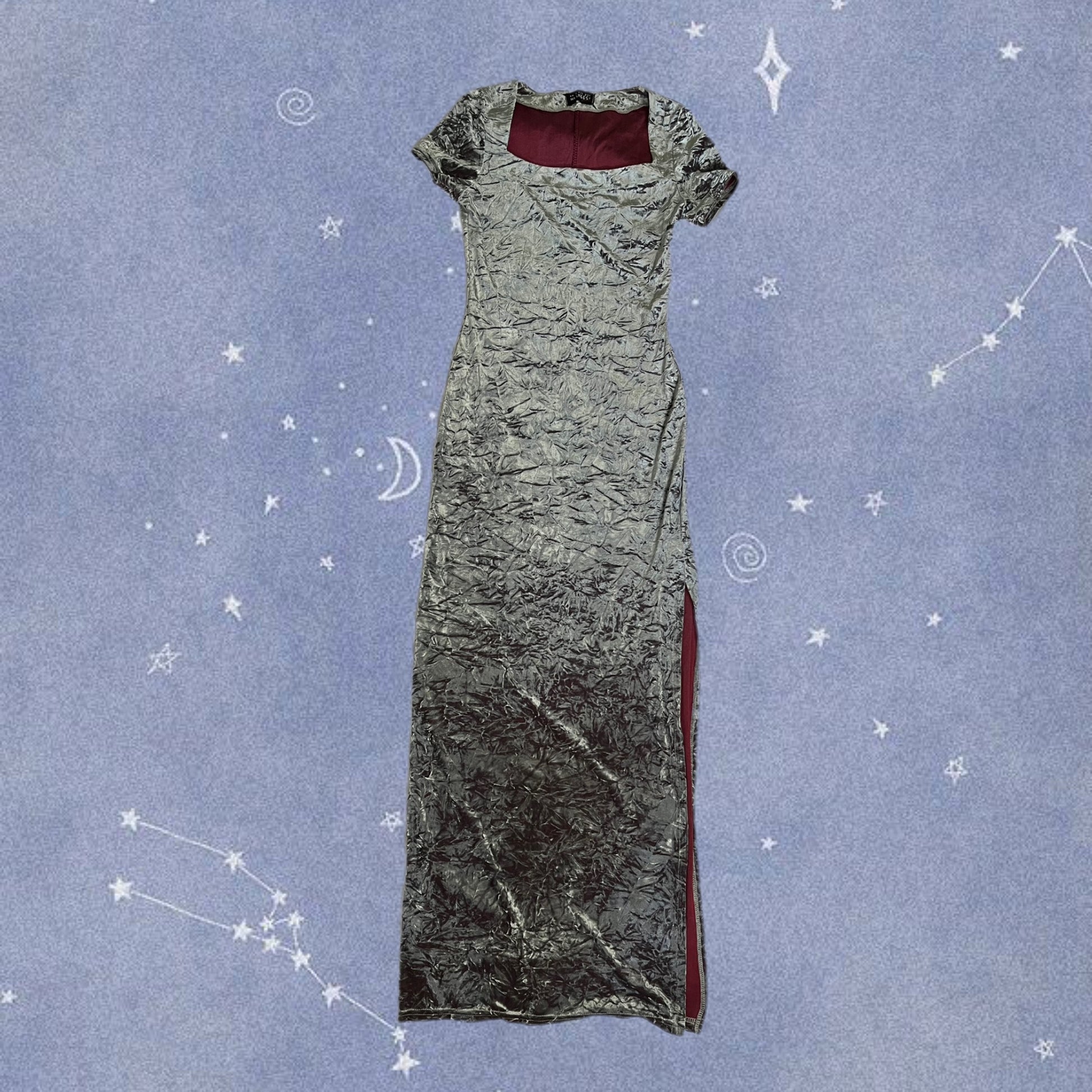 1990s silver velvet maxi dress! This has a square neck line and a stretchy fit.