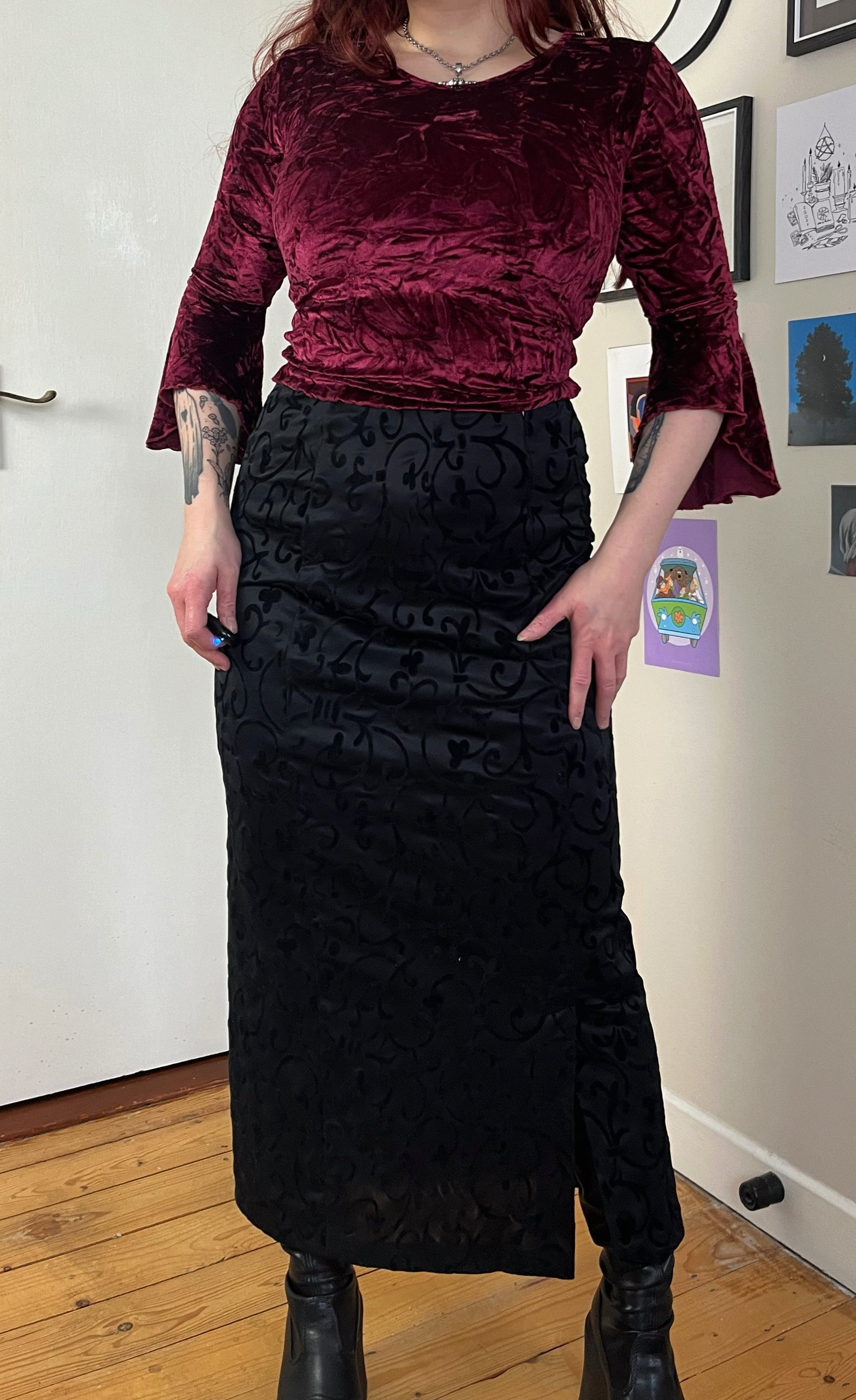 Stunning 2000s black maxi skirt by Naf Naf! This has a black velvet filigree pattern all over and a zip on the back. In perfect vintage condition and would best fit UK 10.