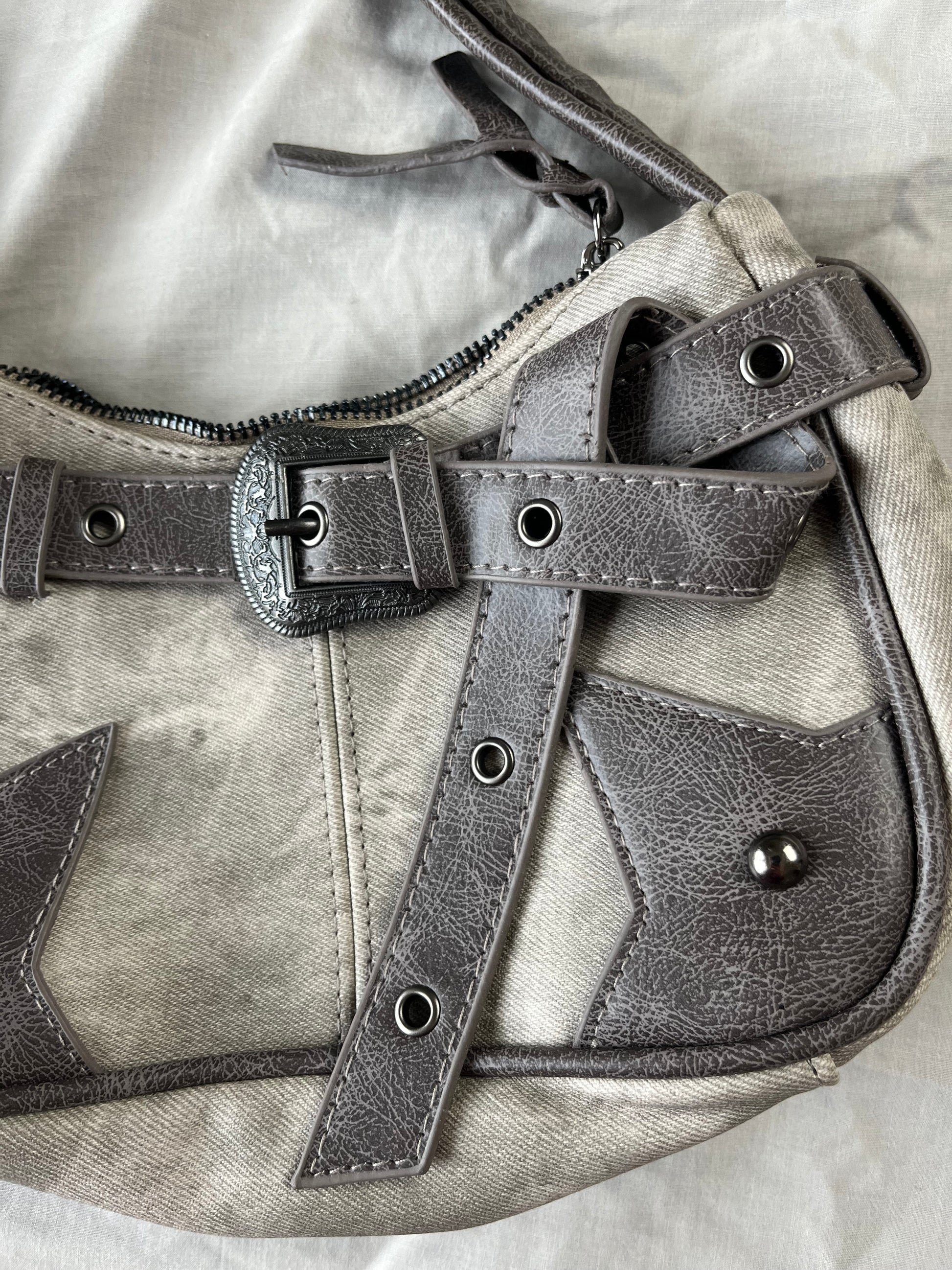 2000s light grey shoulder bag! Faux leather and features a belt buck detail on the front.