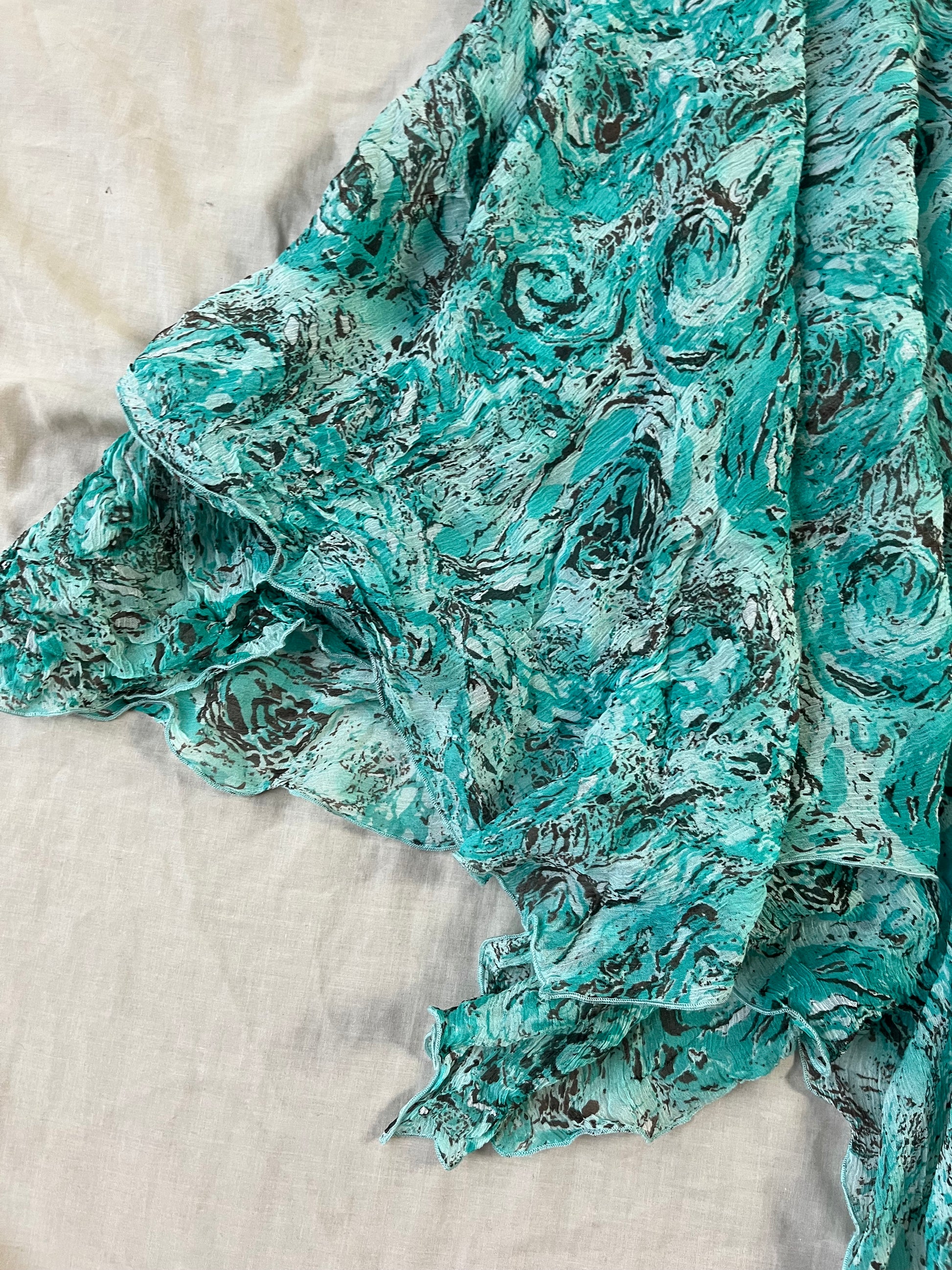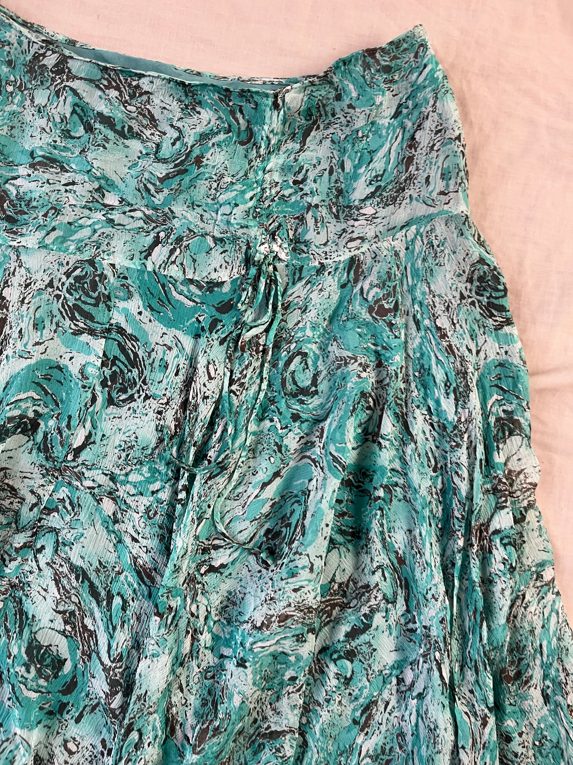 1990s blue/brown floral pattern silk skirt! Asymmetrical hem and zips up at the side.