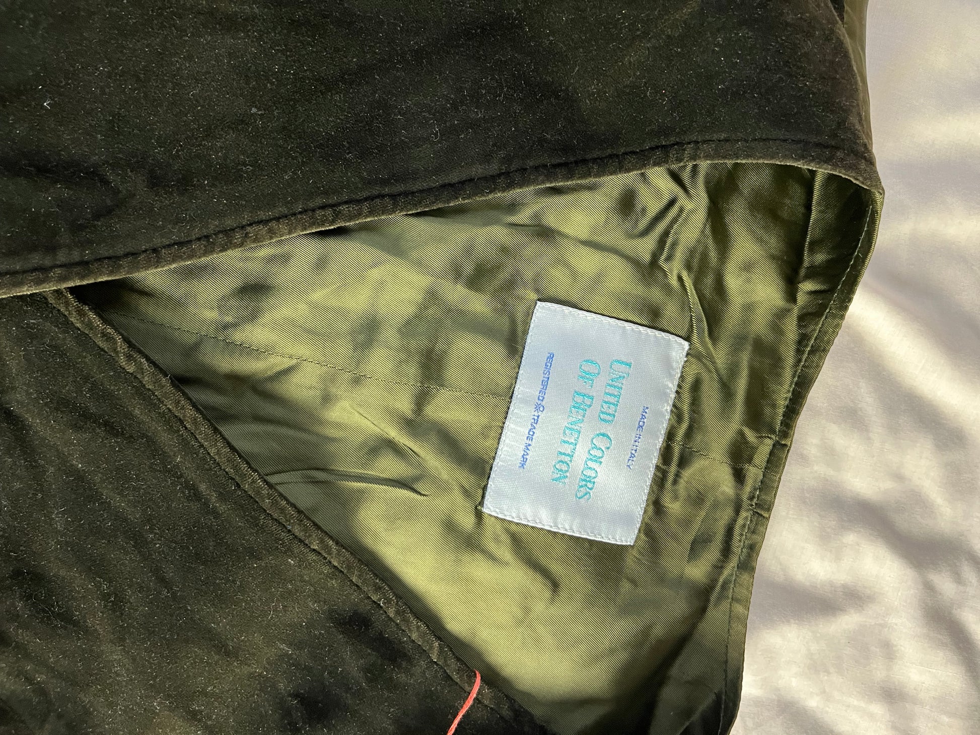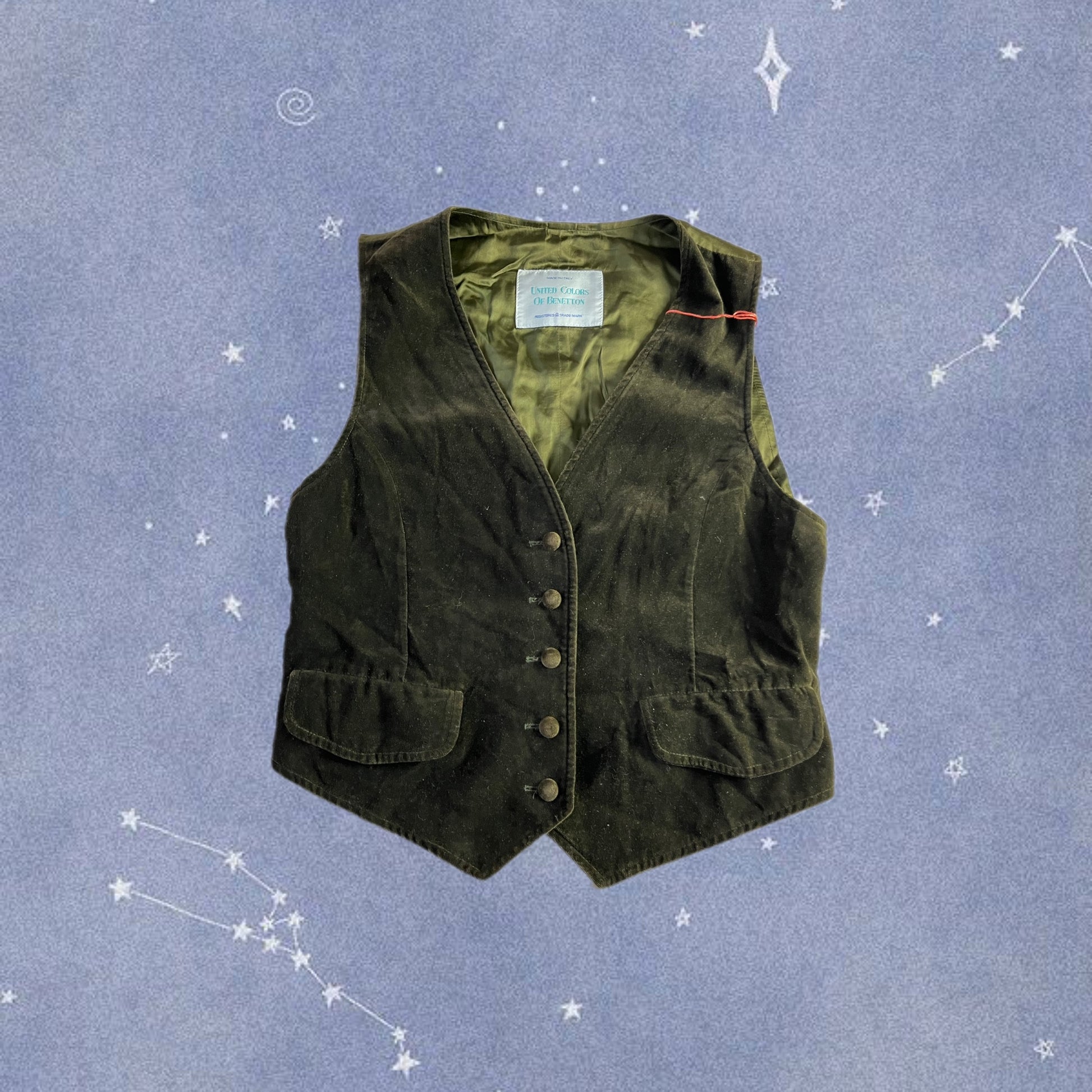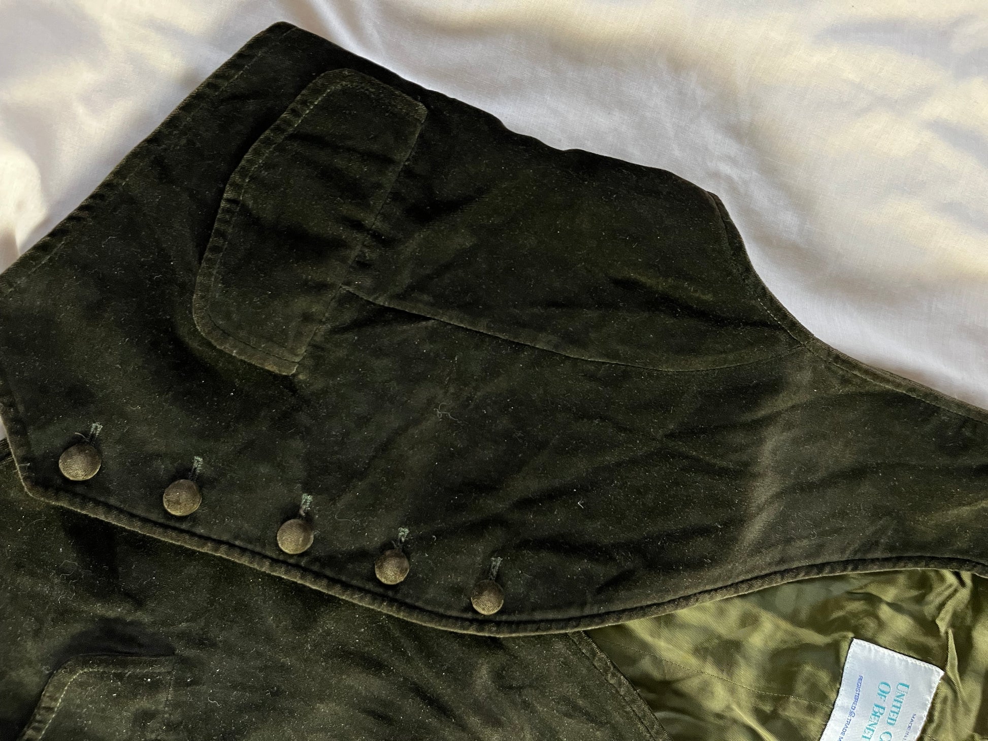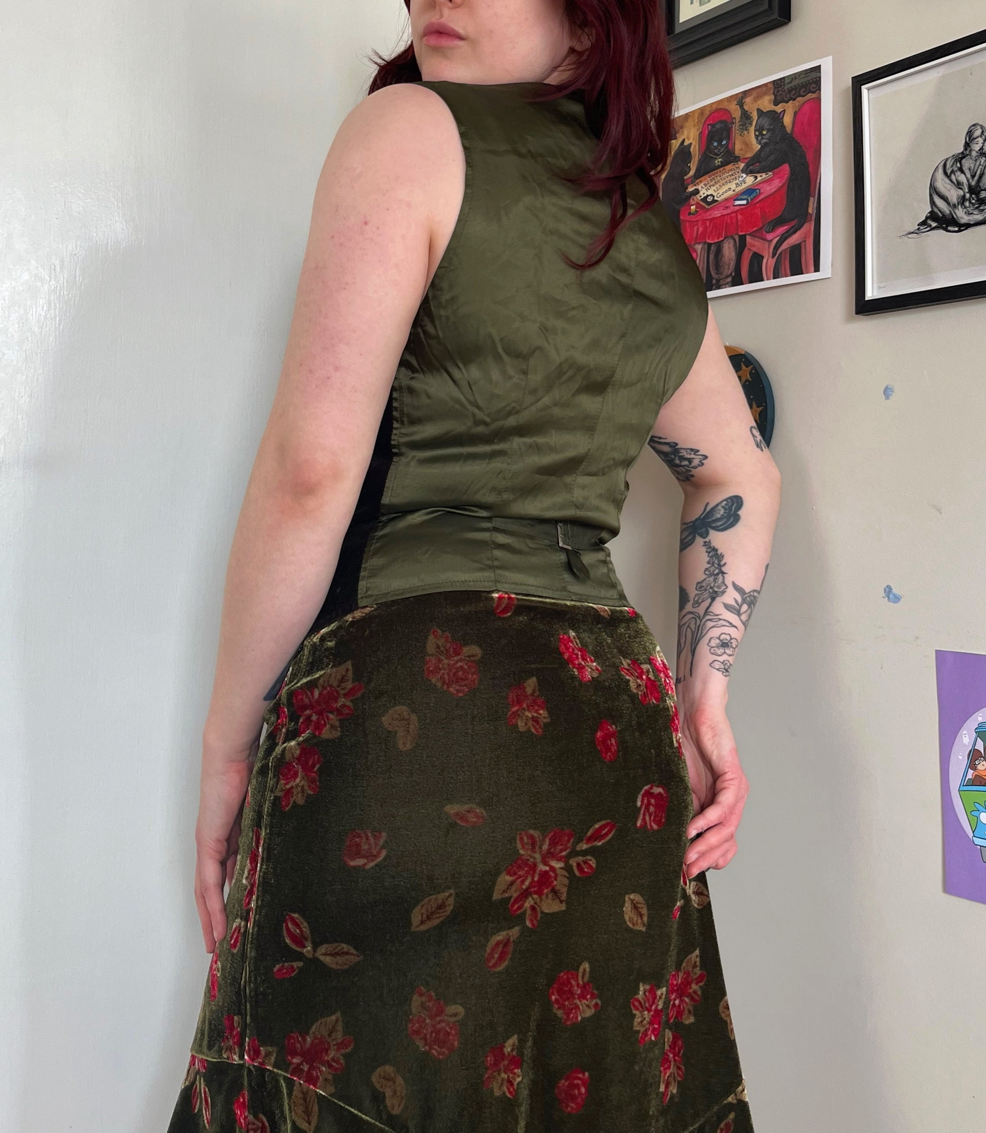2000s khaki green velvet vest. Buttons on the front and ties at the back.