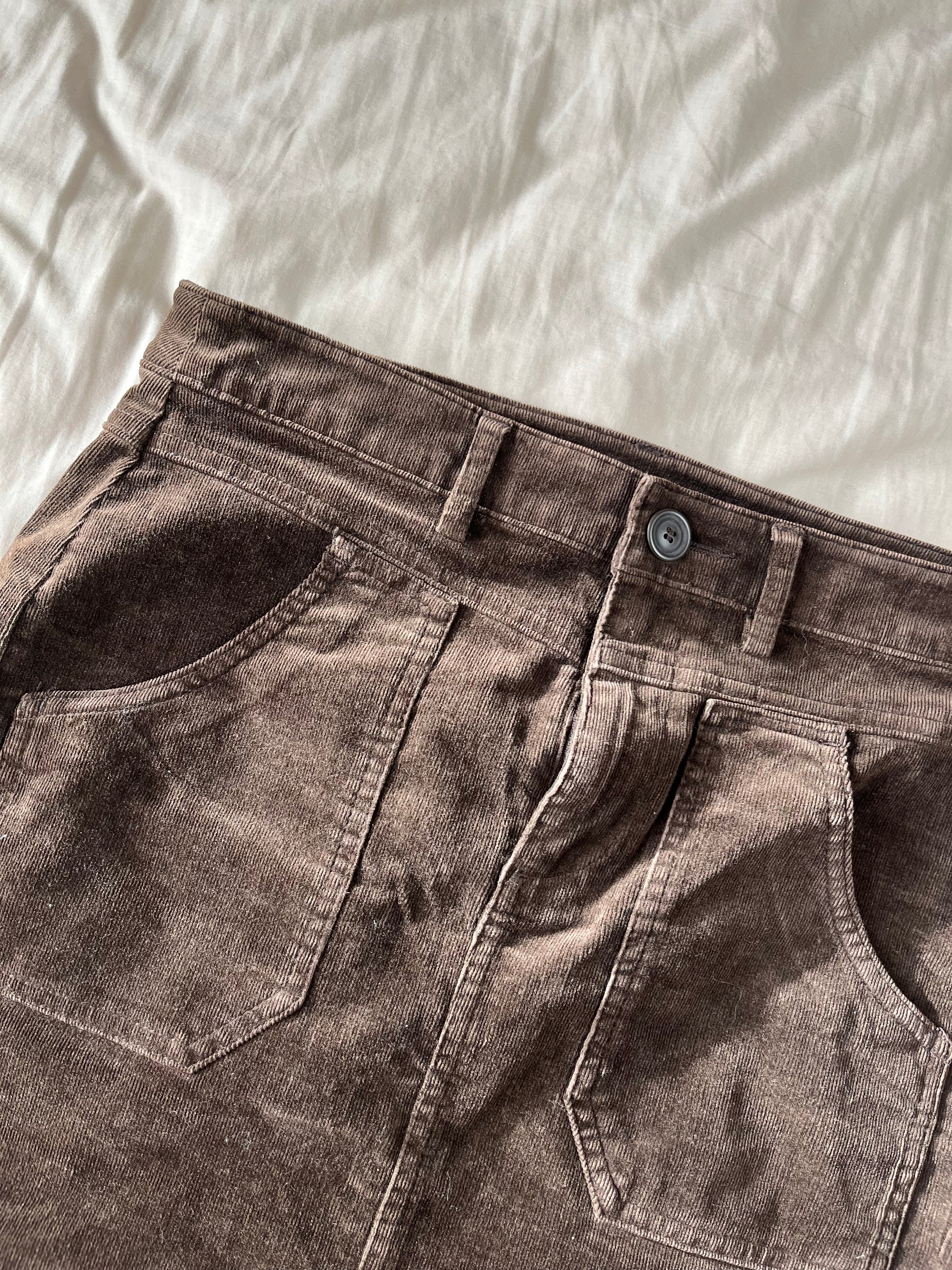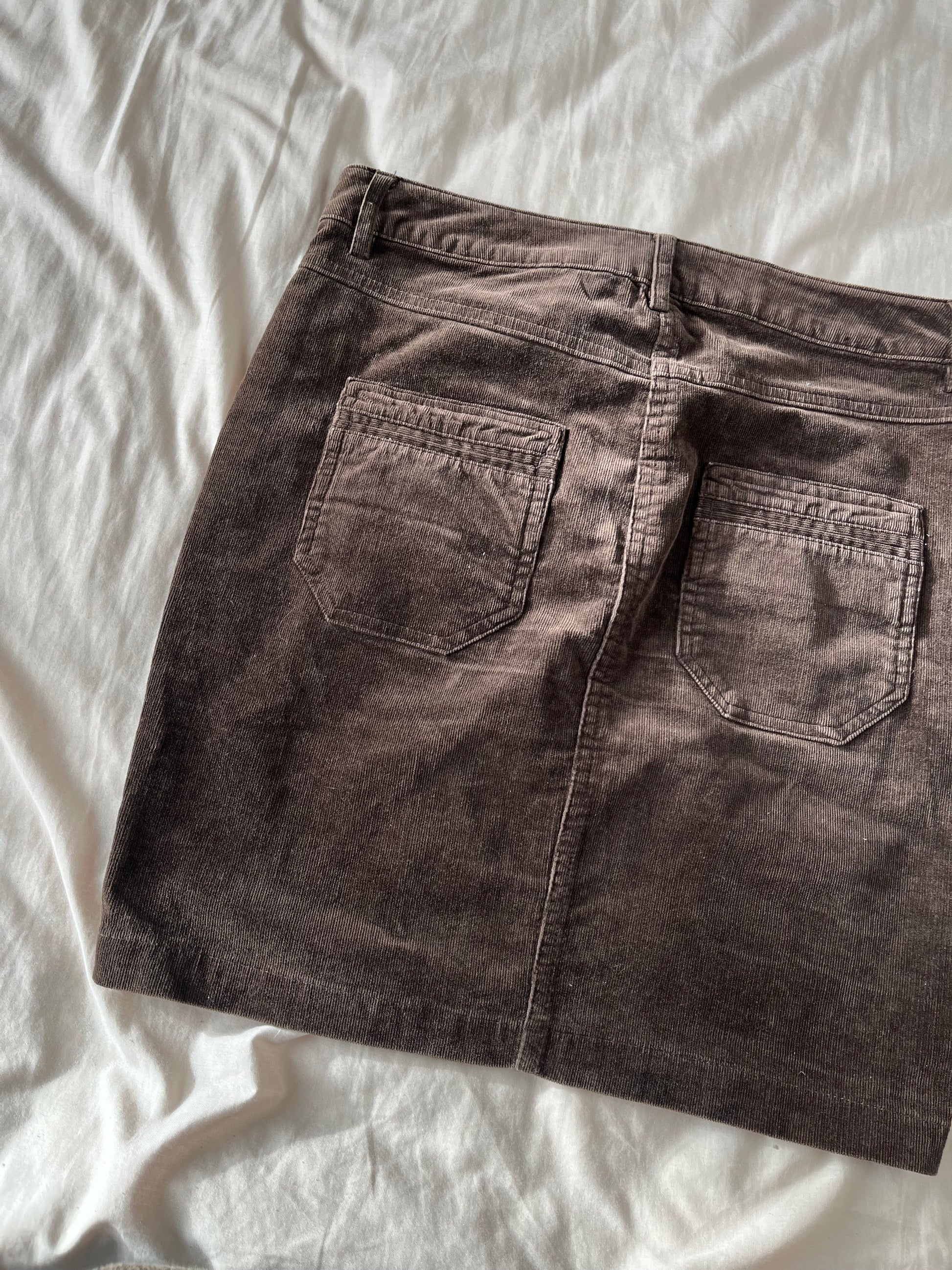 Gorgeous 2000s brown corduroy mini skirt! This has a stretchy fit with pockets. In perfect vintage condition and would best fit UK 8-10.