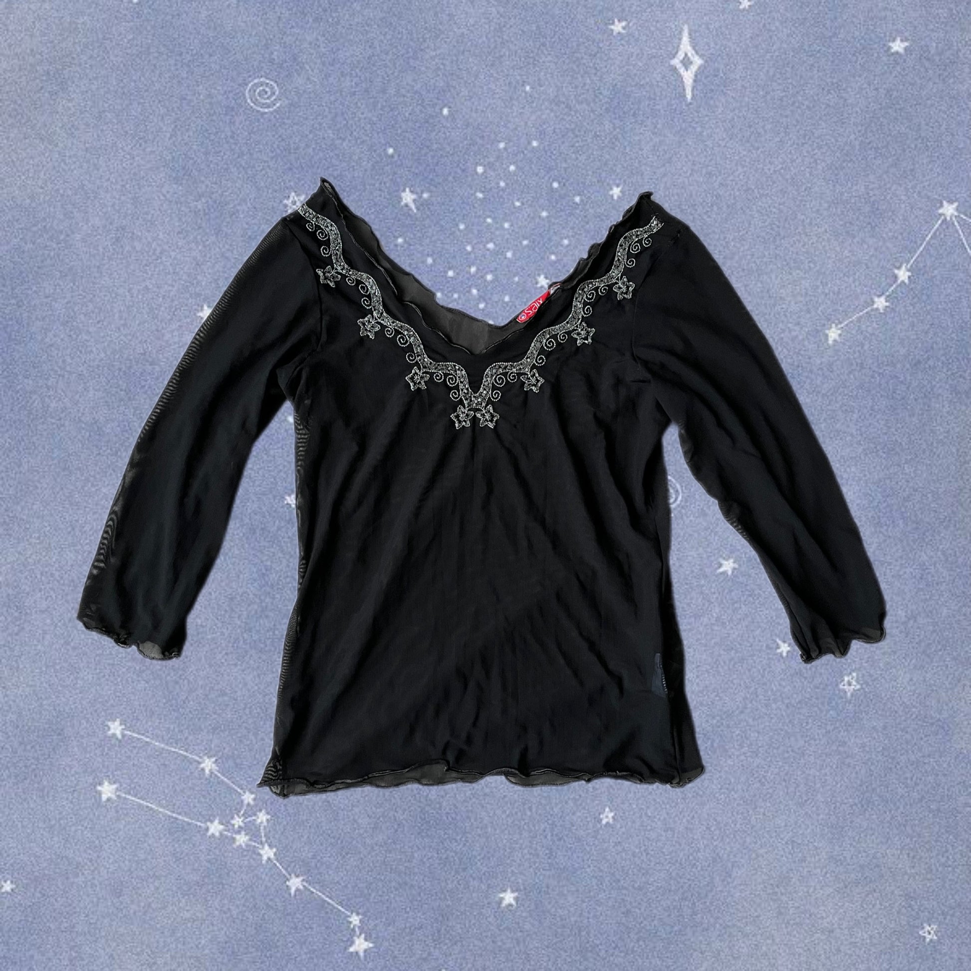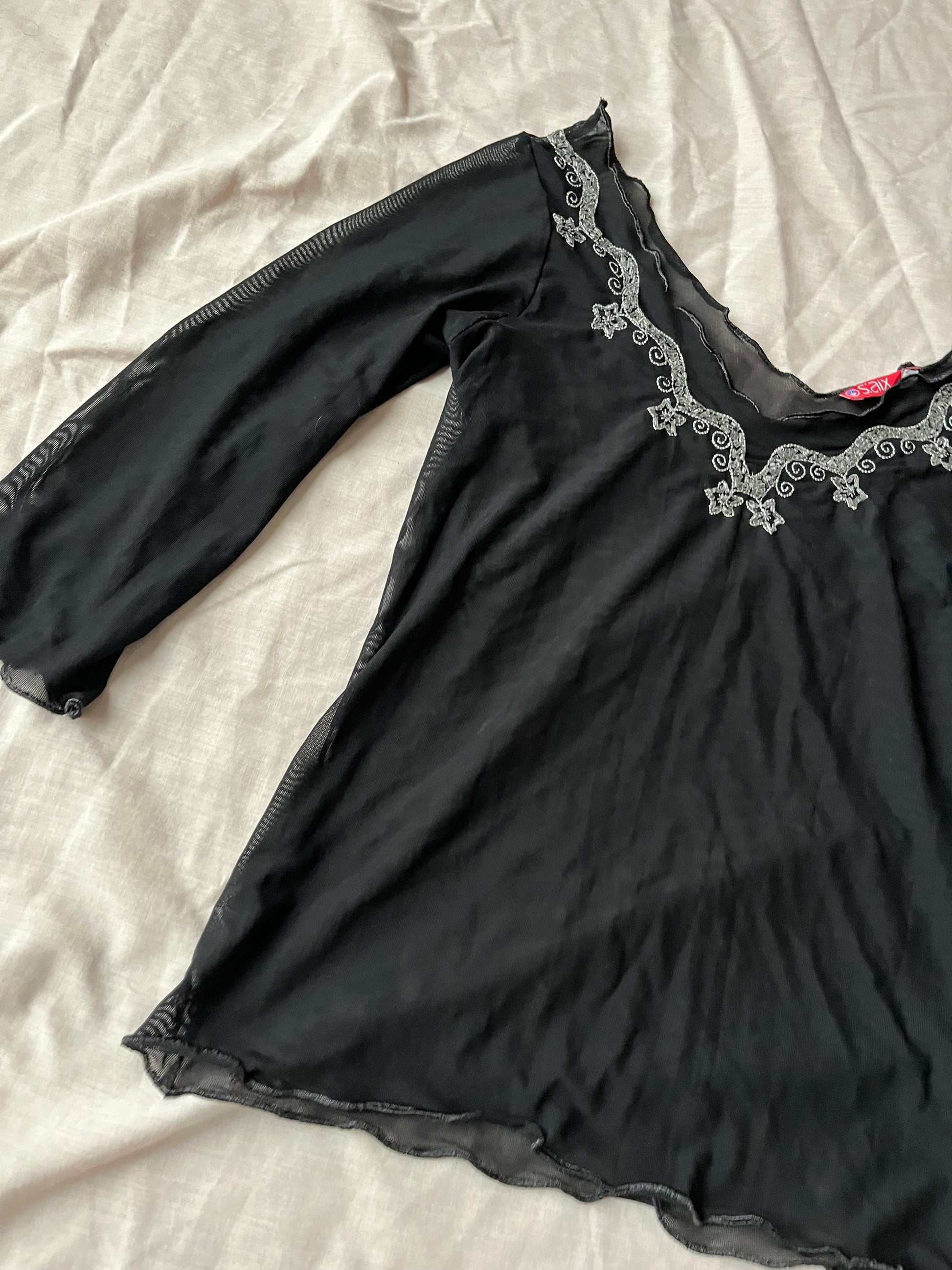 Beautiful 2000s black mesh stretchy top with silver beading details on the neckline.