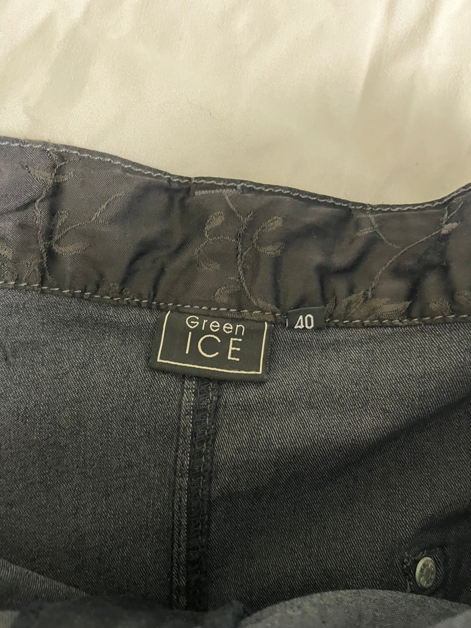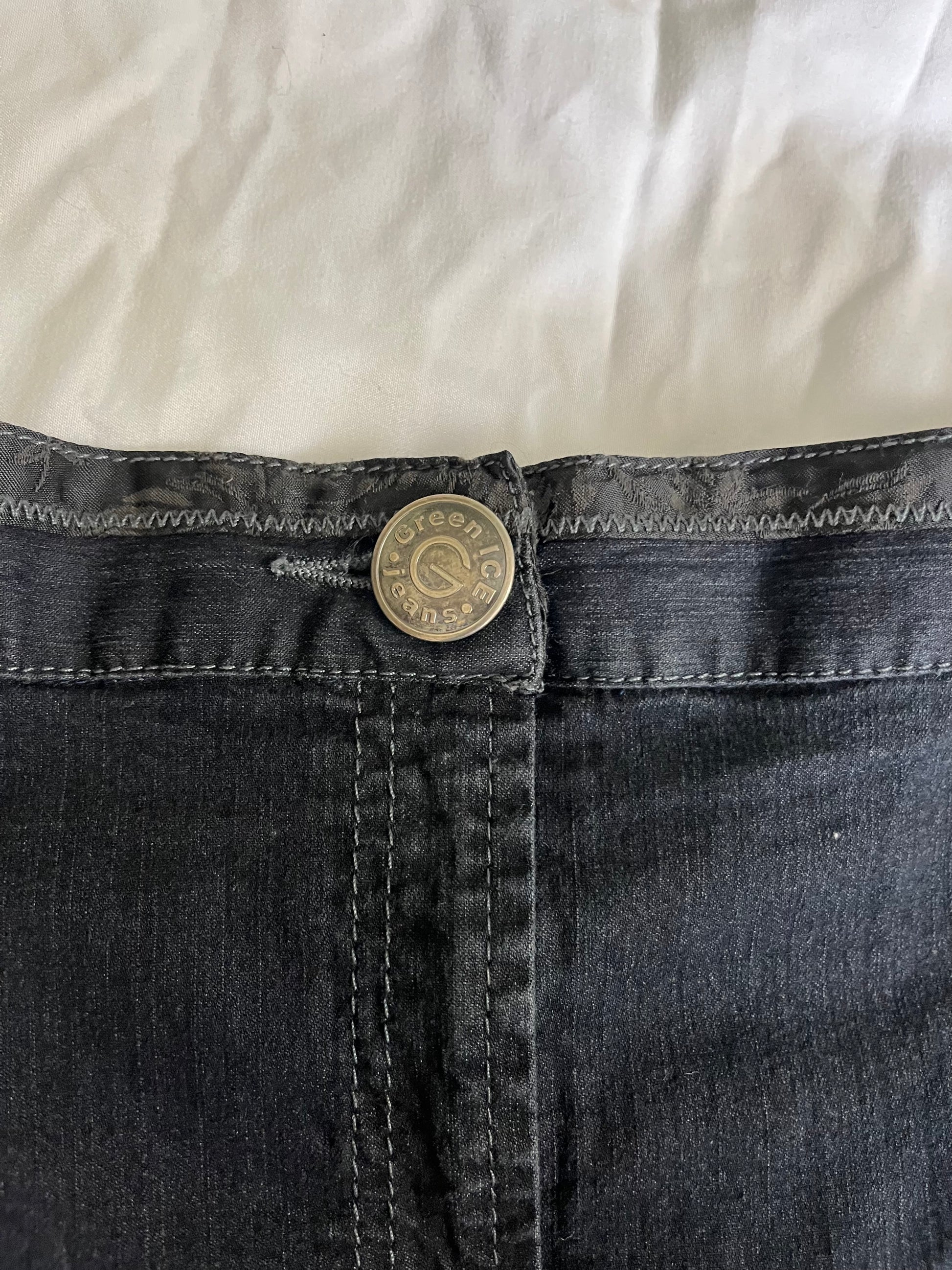 1990s denim and satin maxi skirt! This has a floral design on the satin parts and a button and zip on the front.