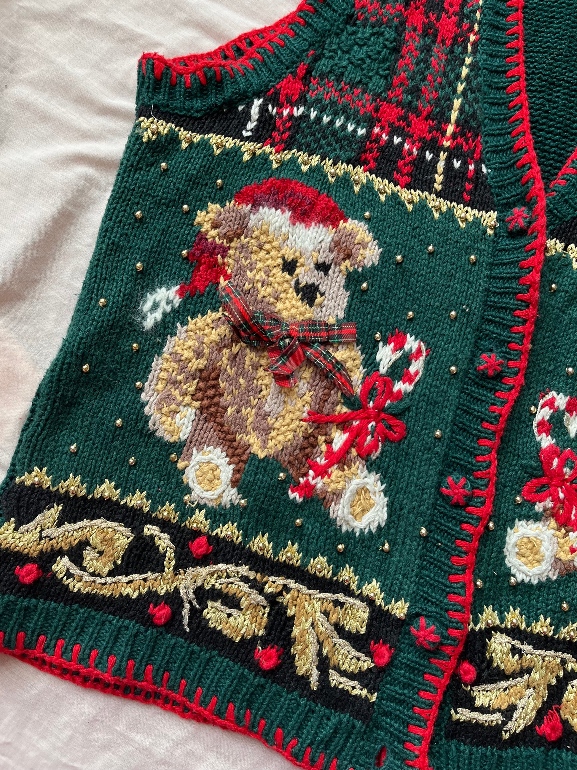 1997 button up green sweater vest! Features a festive design of winter themed teddys on the front.