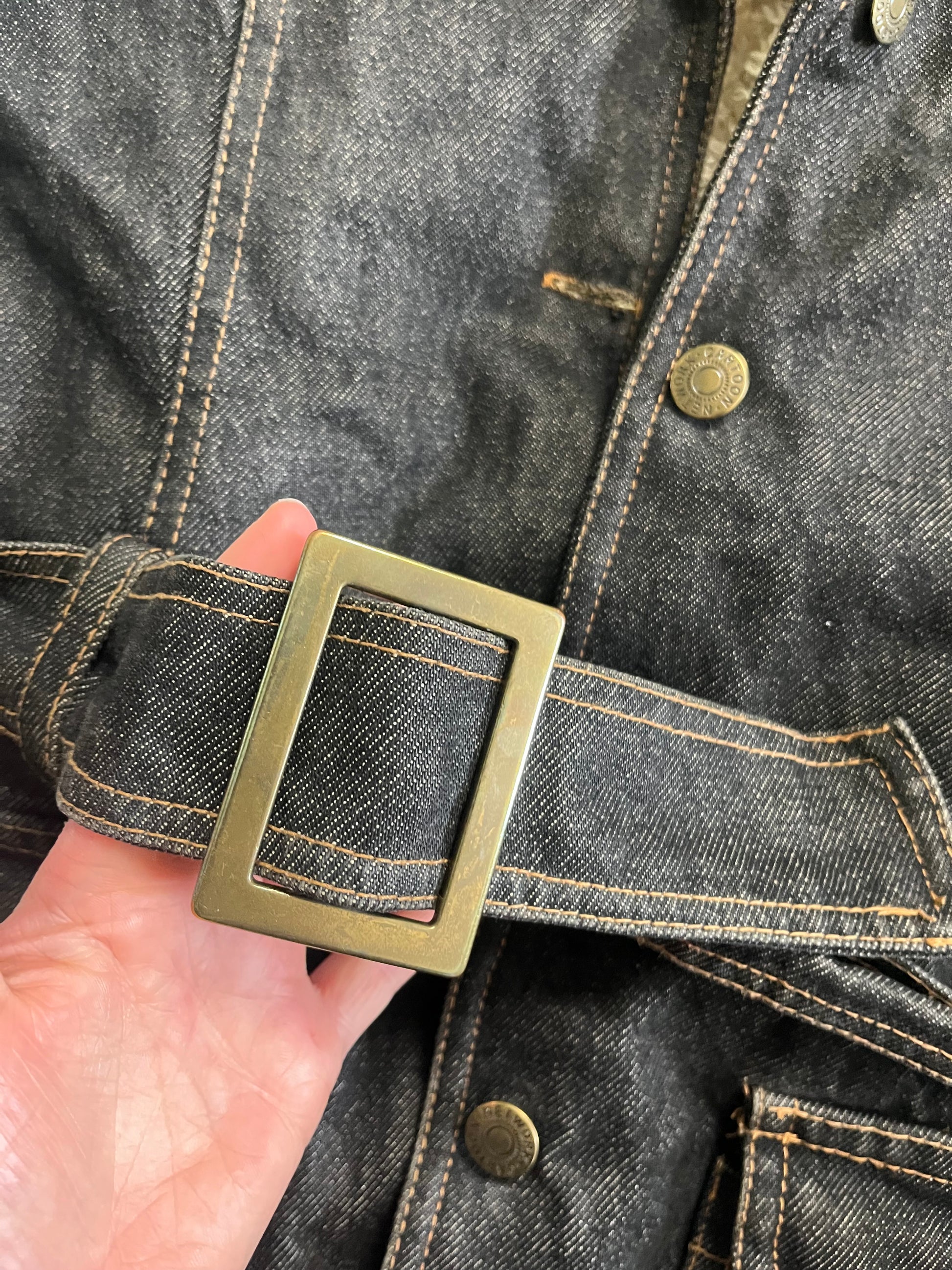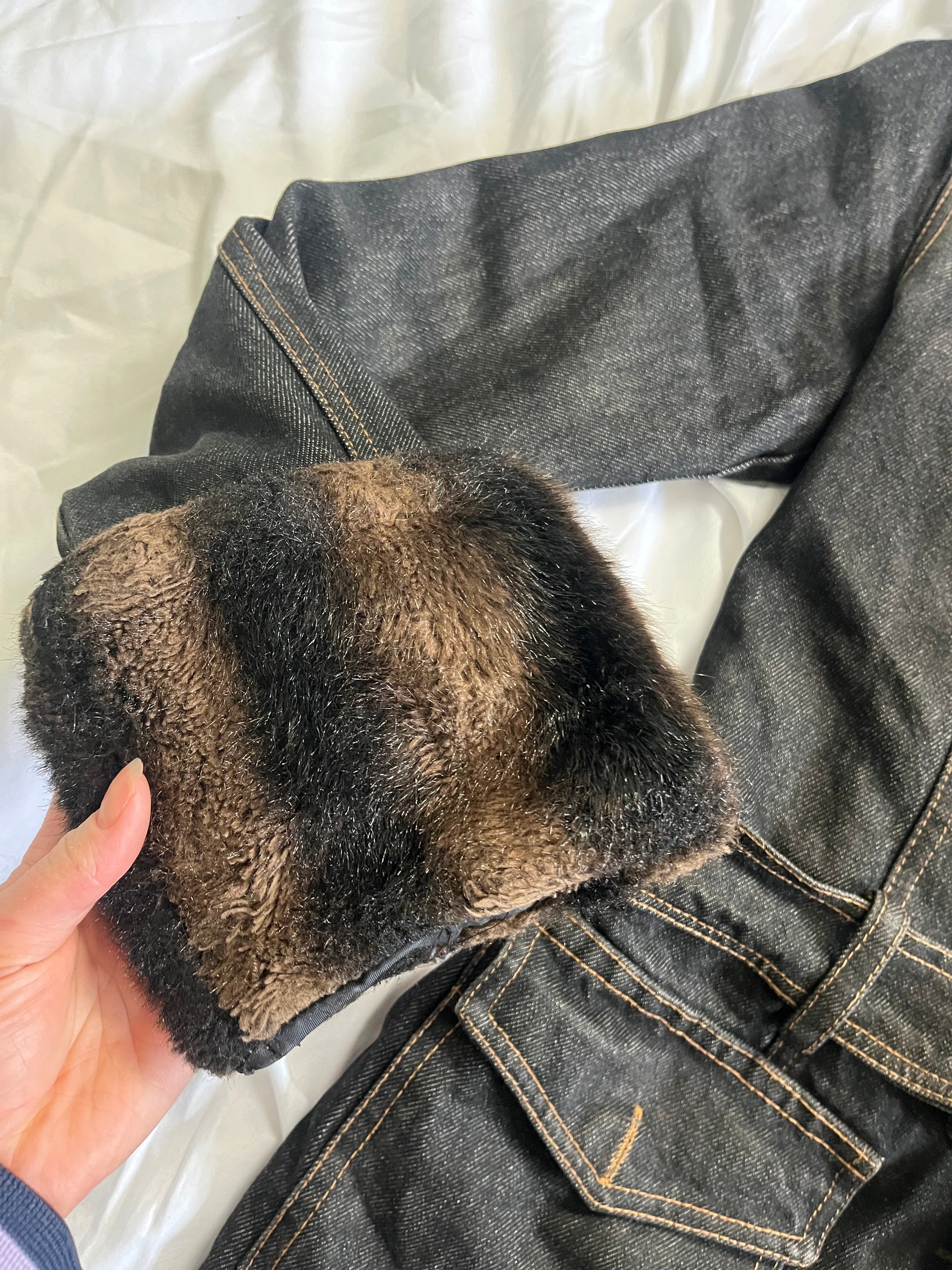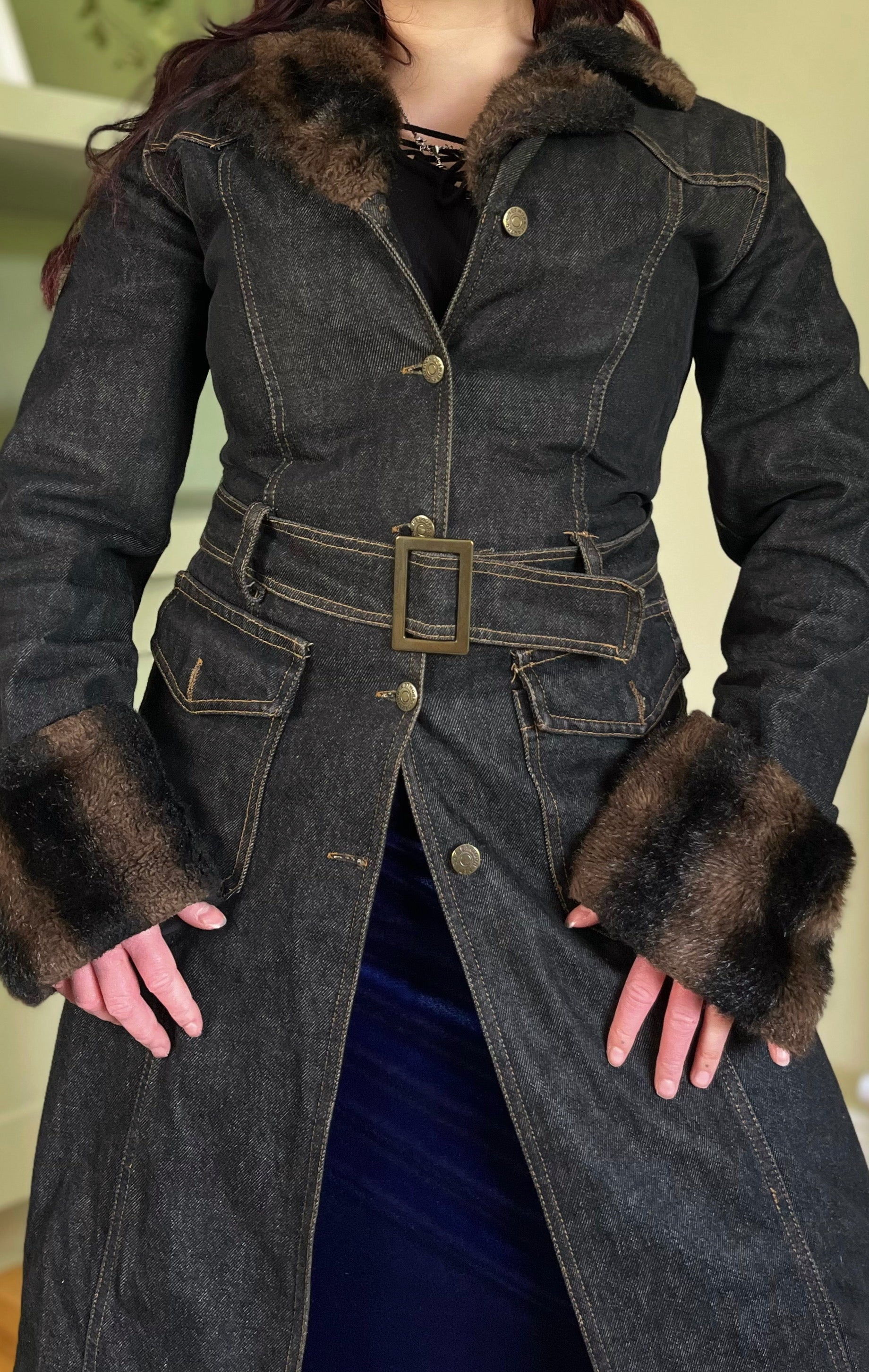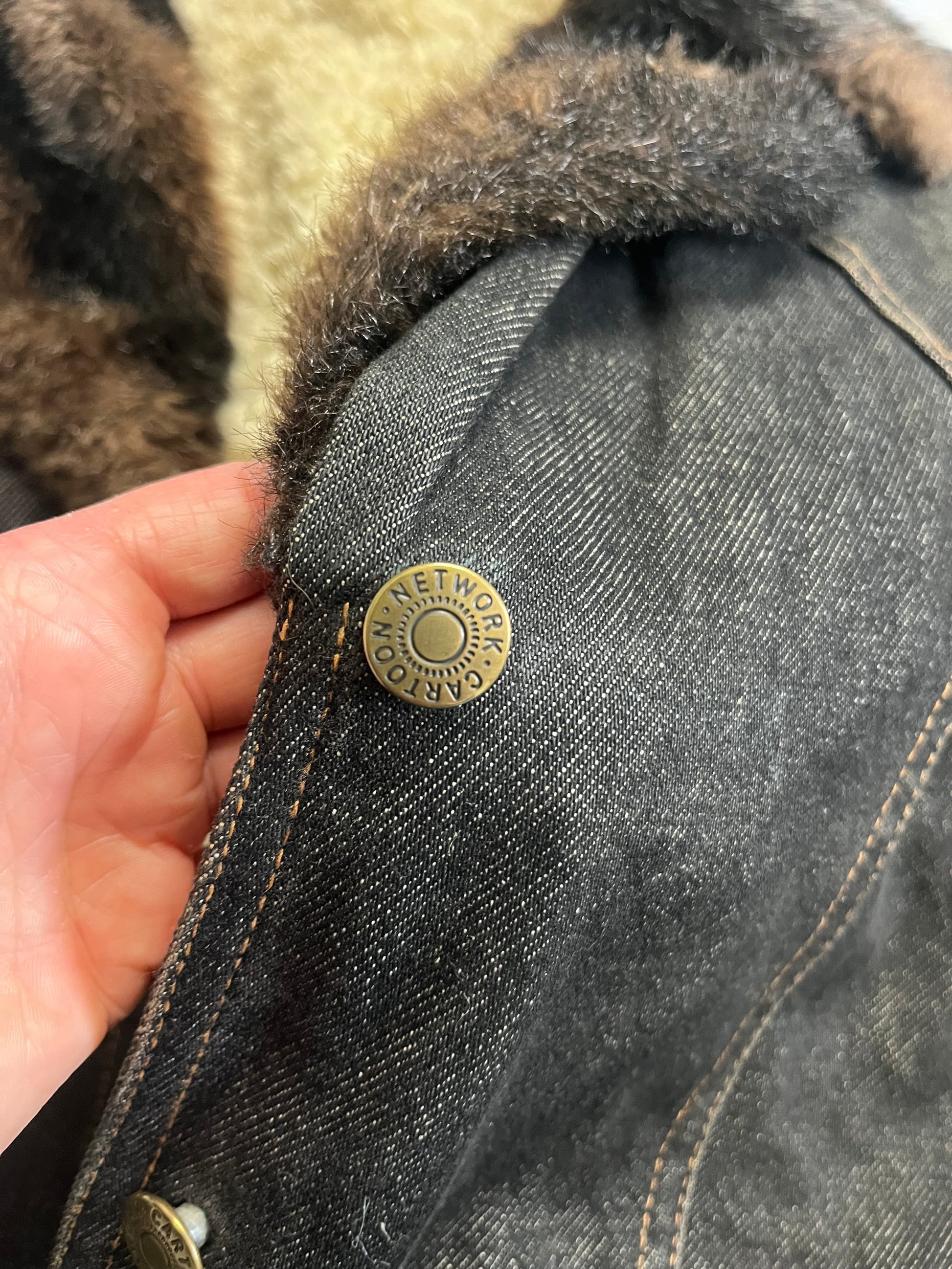Amazing 1990s denim afghan coat! Button up front coat with pockets, a long cosy fit and faux fur trim. This has no brand tag but the buttons say Cartoon Network! I cant find much info about it but I think it was a custom made promo item made for cast/crew/staff working on cartoon network.