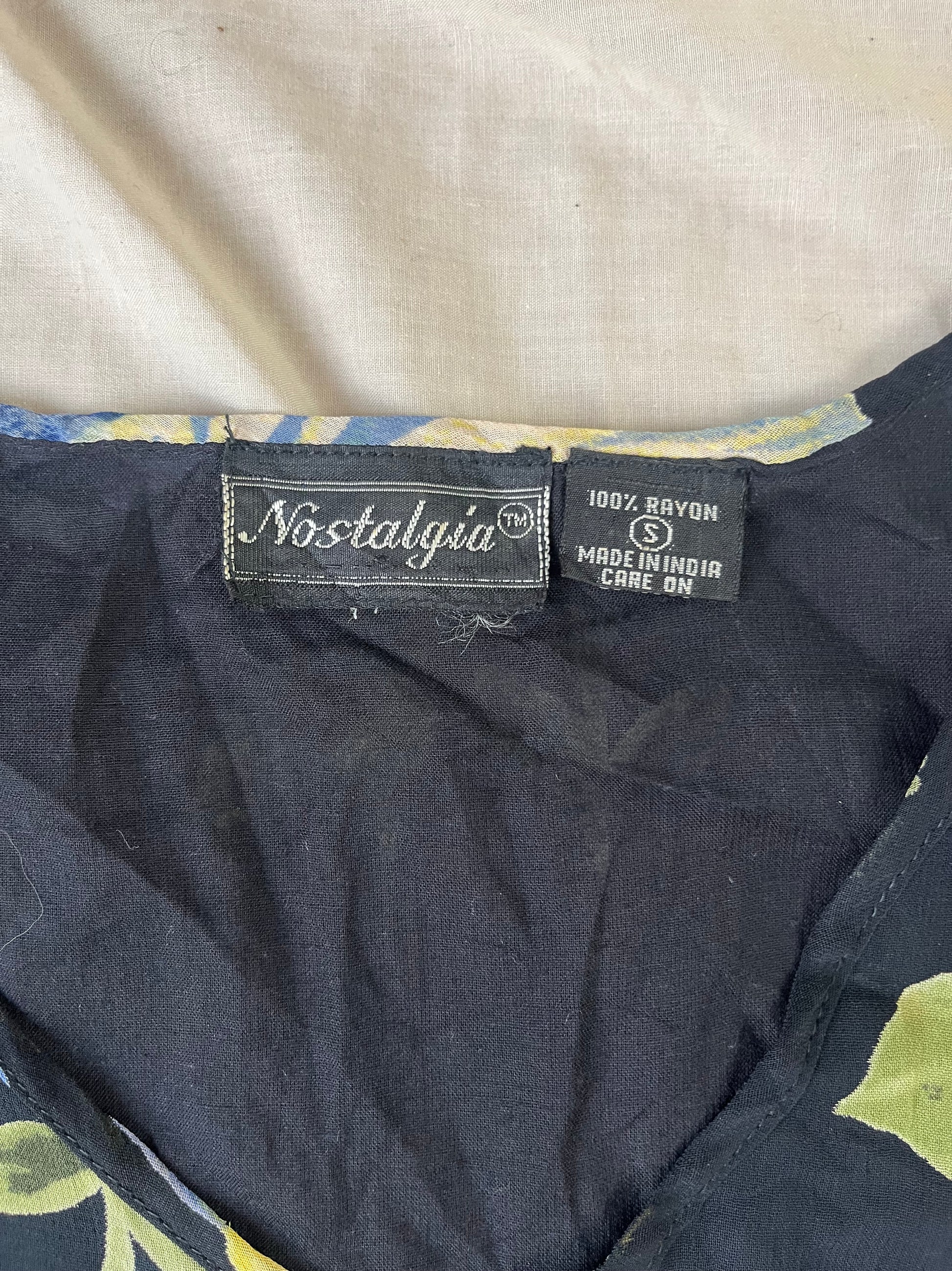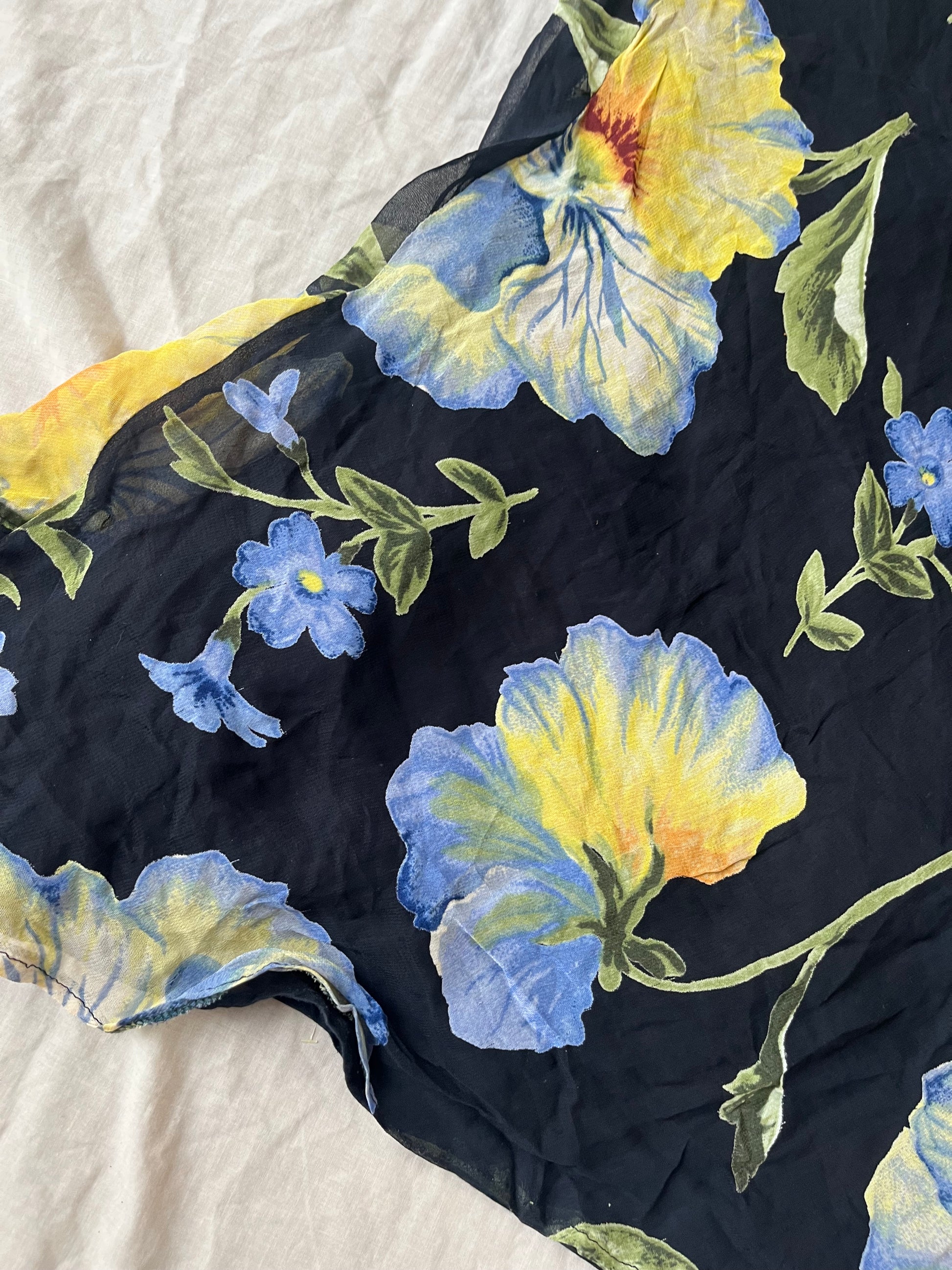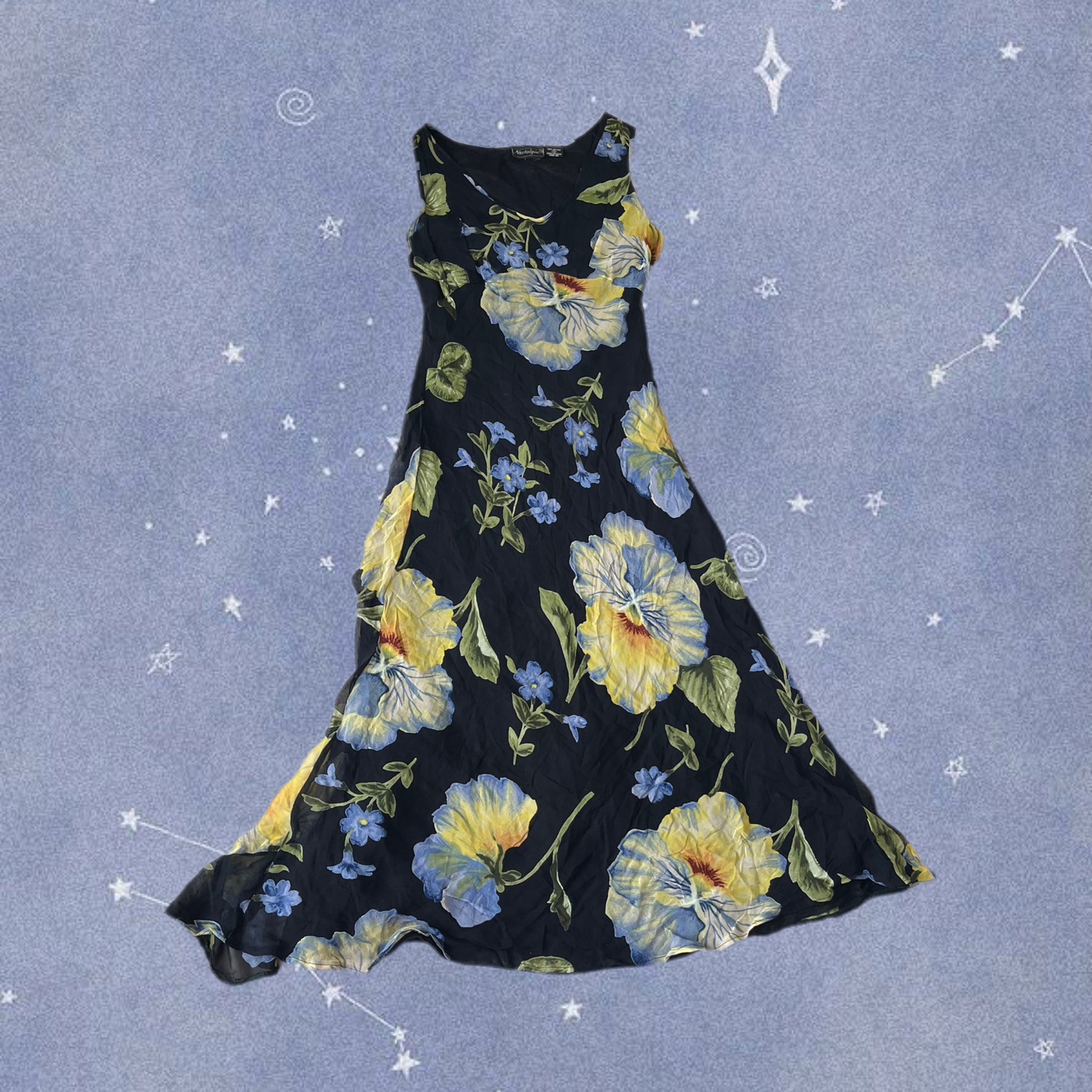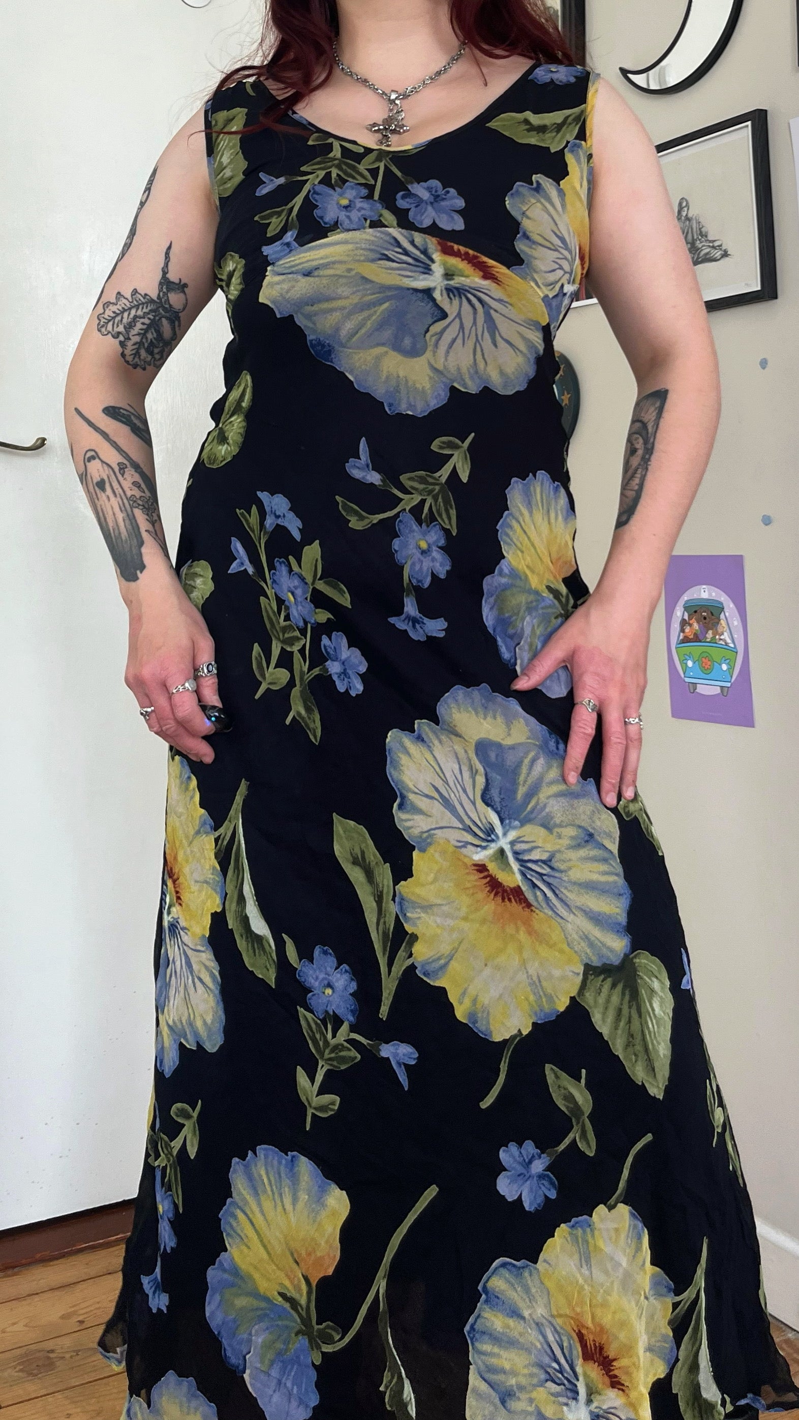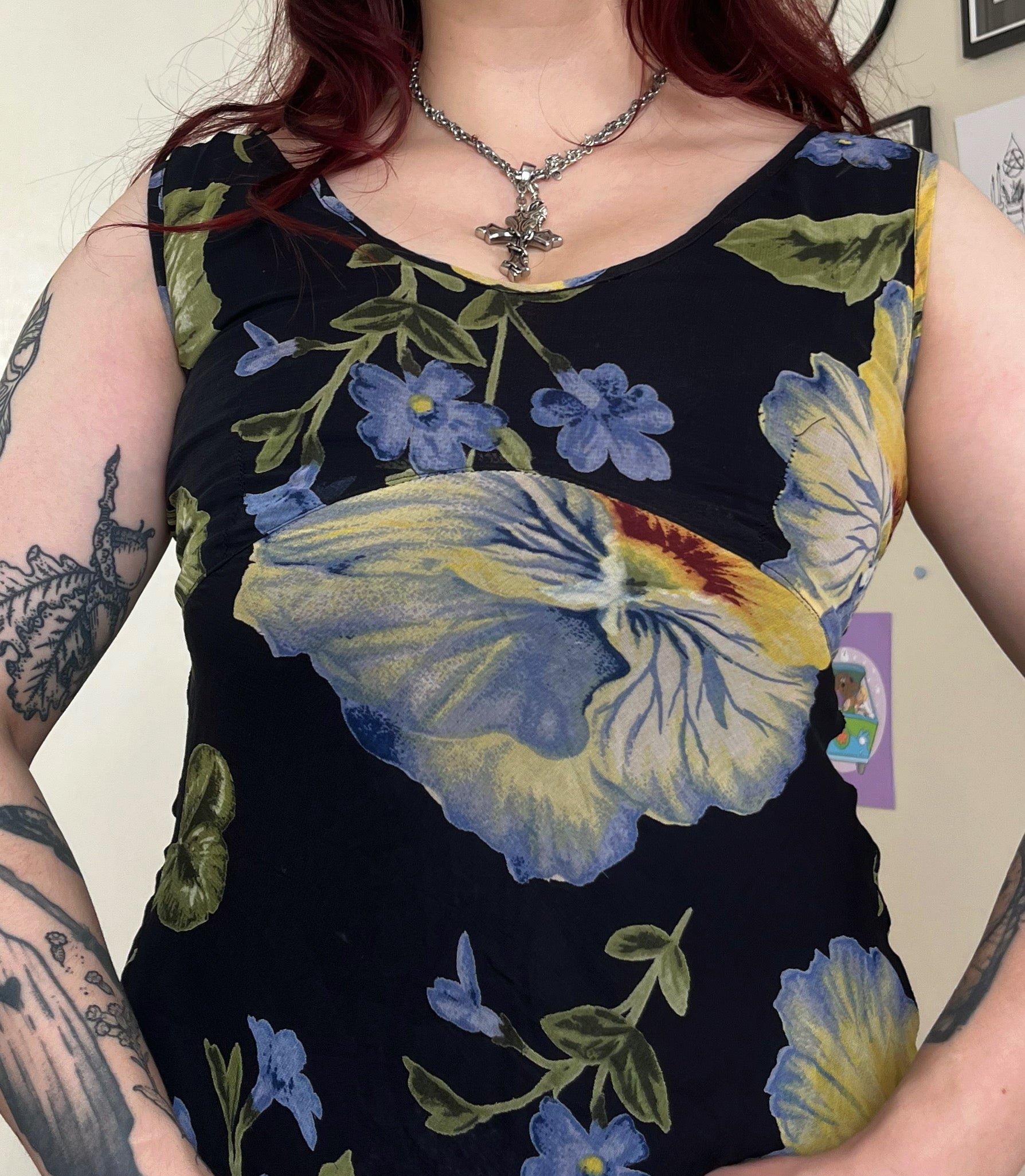 Gorgeous 1990s black mesh dress with a floral pattern all over. Super flattering fit!
