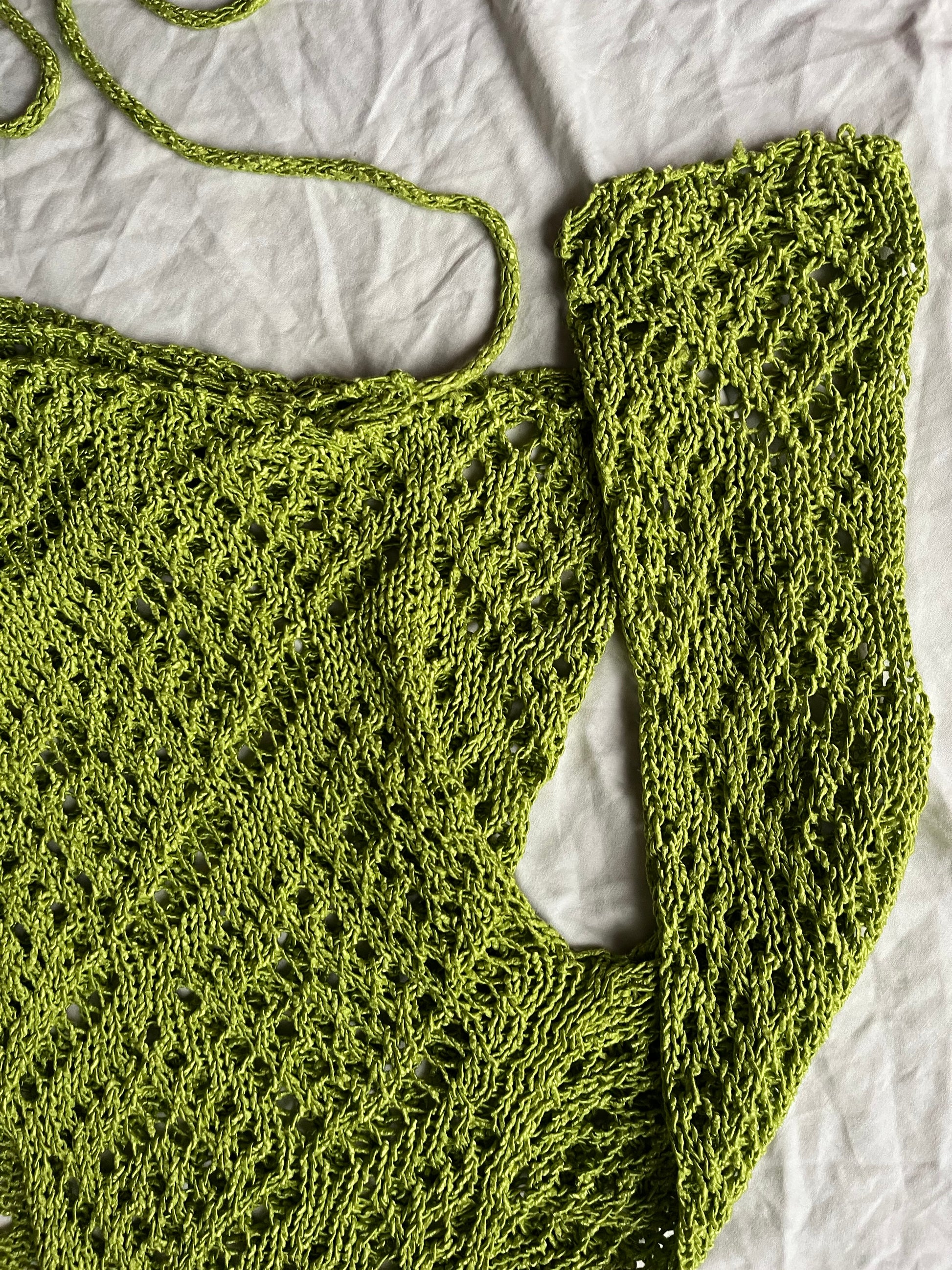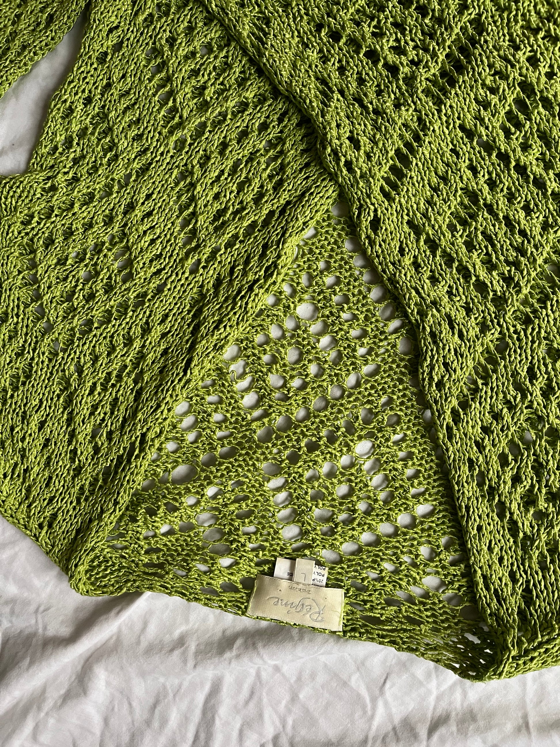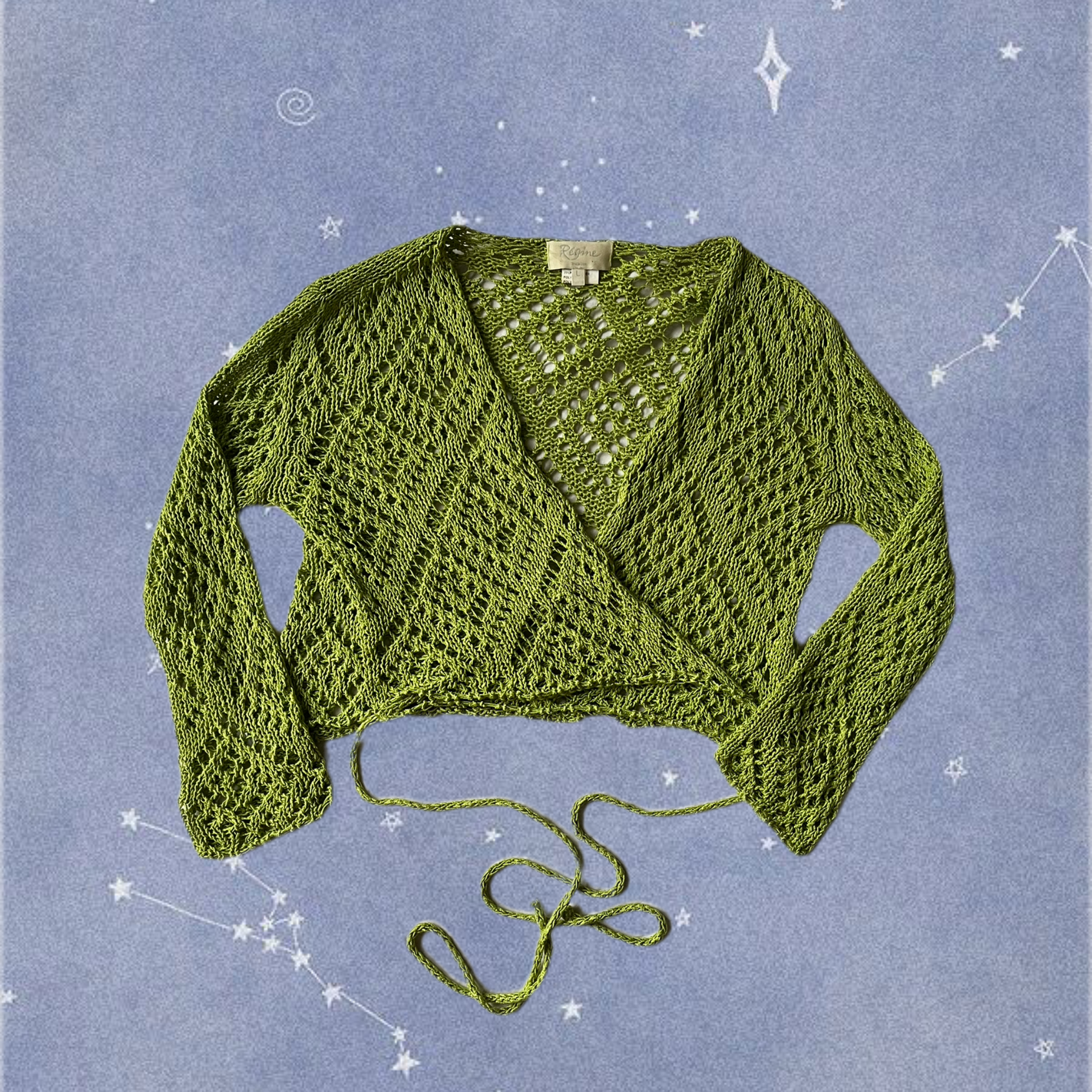 Gorgeous 1990s mossy green tie front wrap cardigan! Cropped fit with a crochet like design. Labelled L but fits more like M.