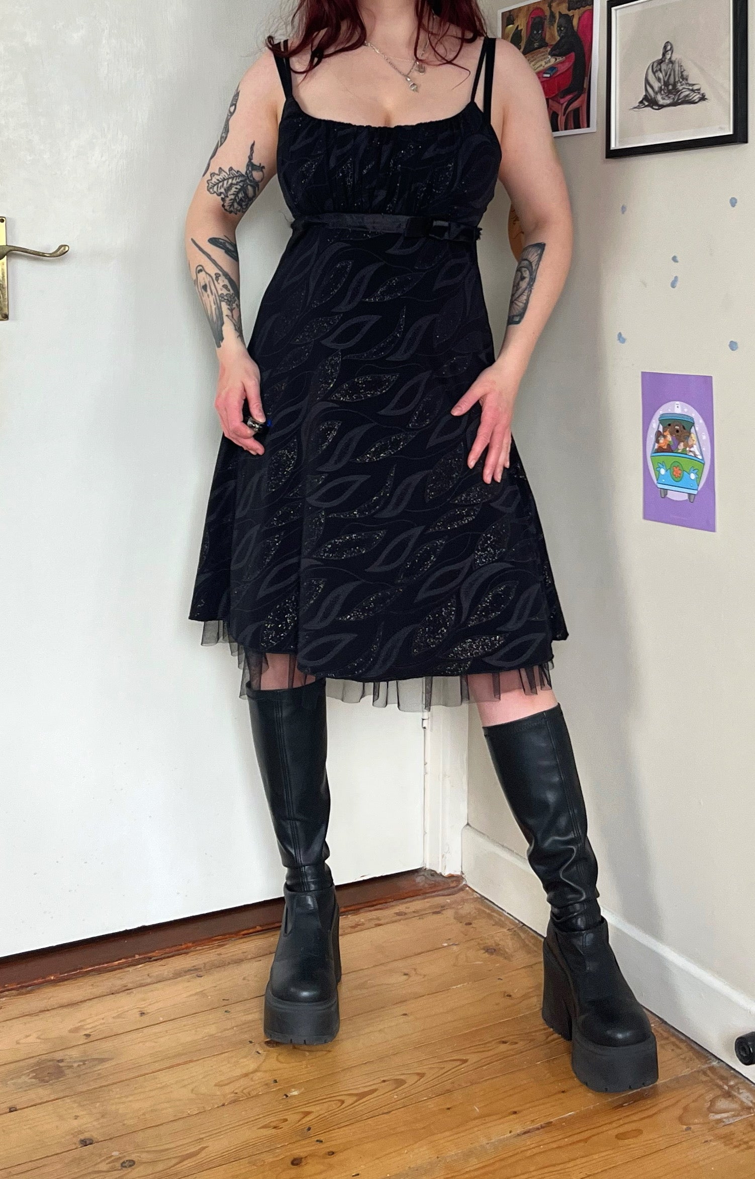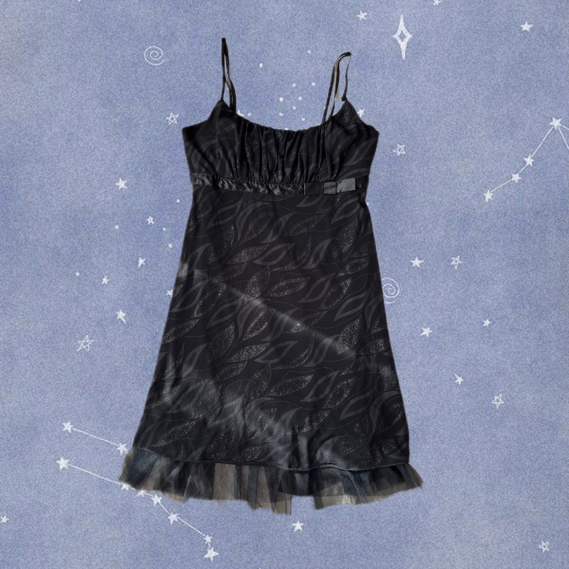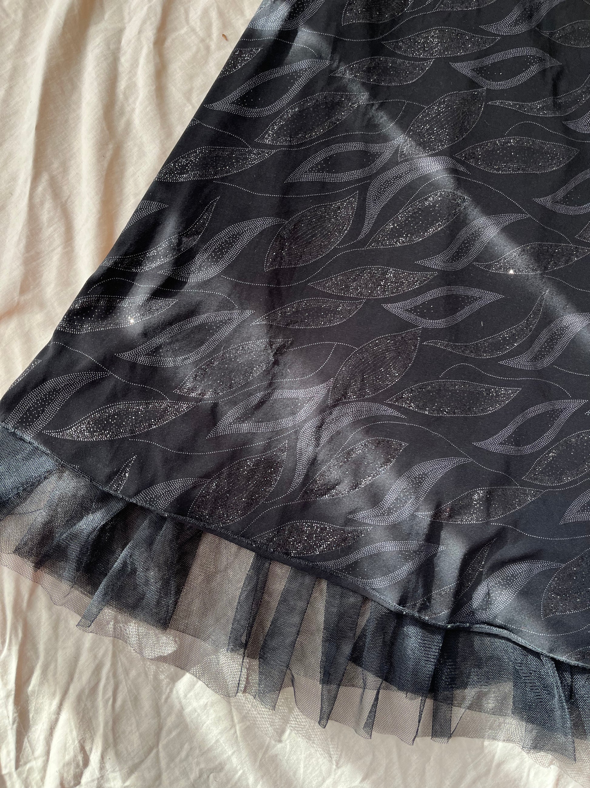 Gorgeous 2000s black glittery mesh dress! This dress has a stretchy back for easy fit, flares out from the waist and has tulle trim on the hem.
