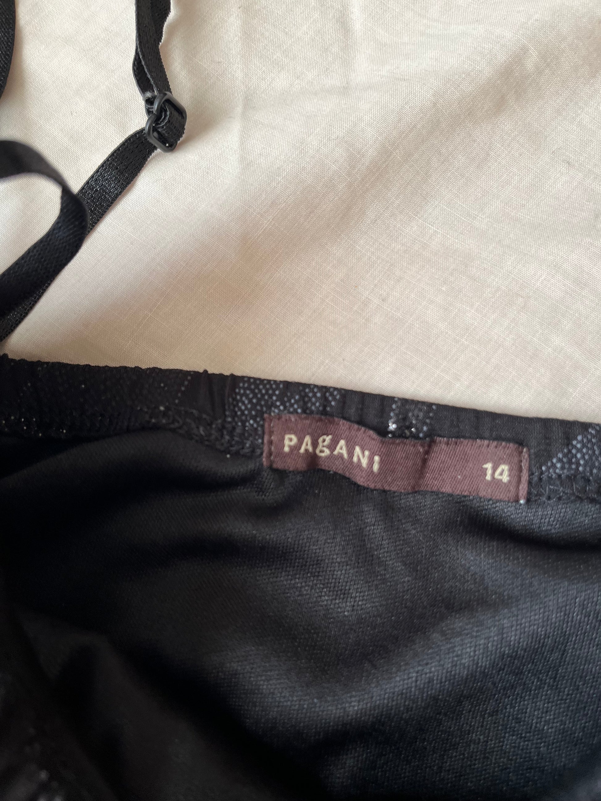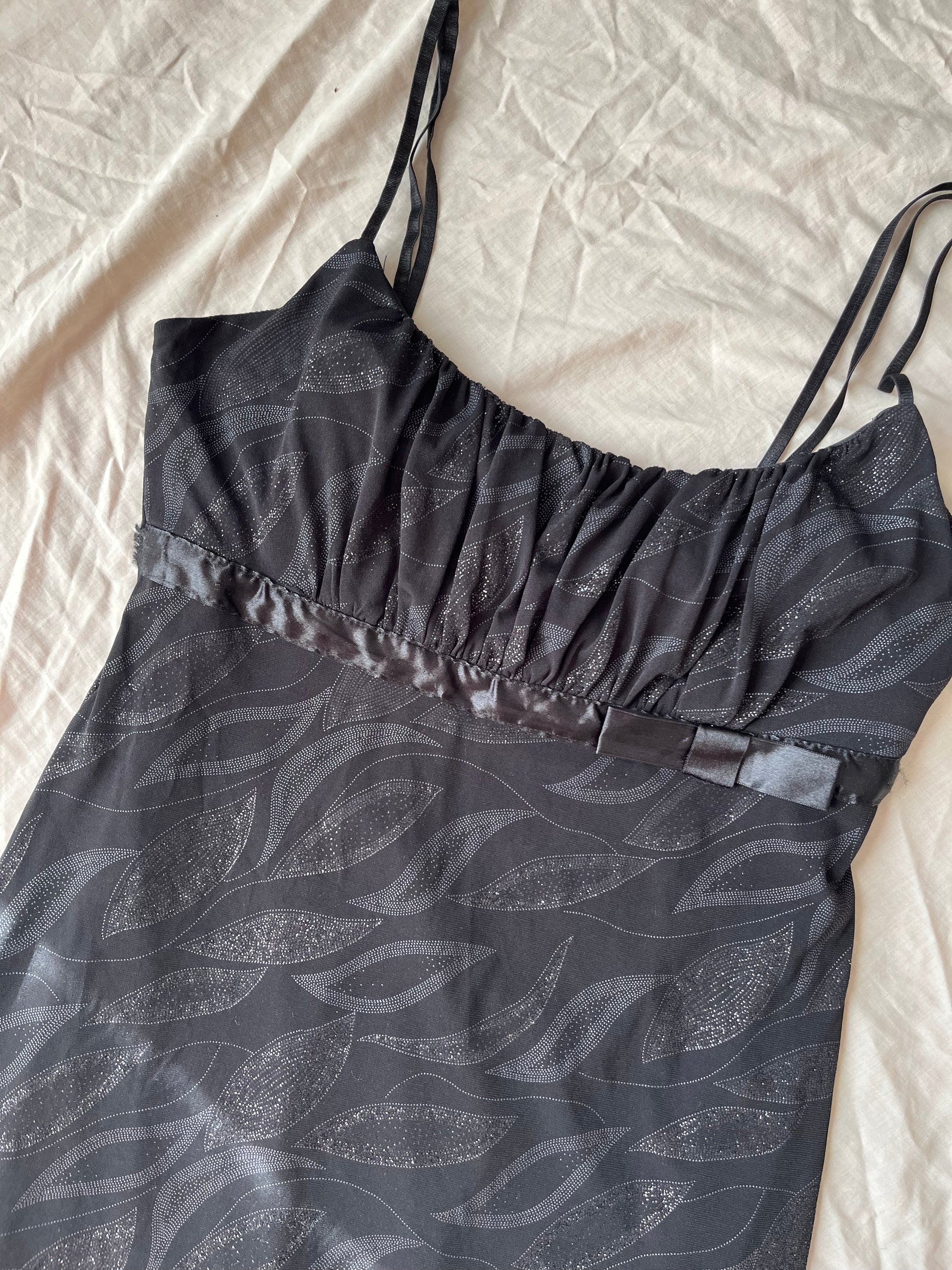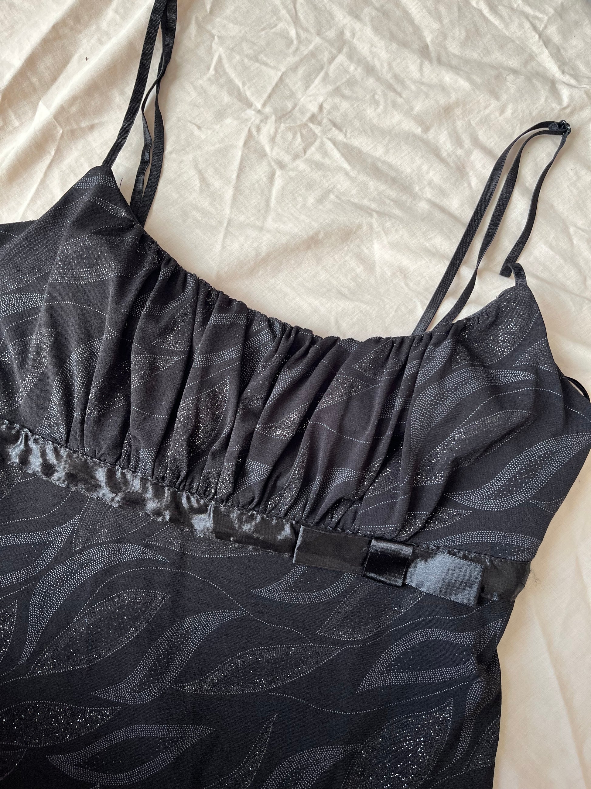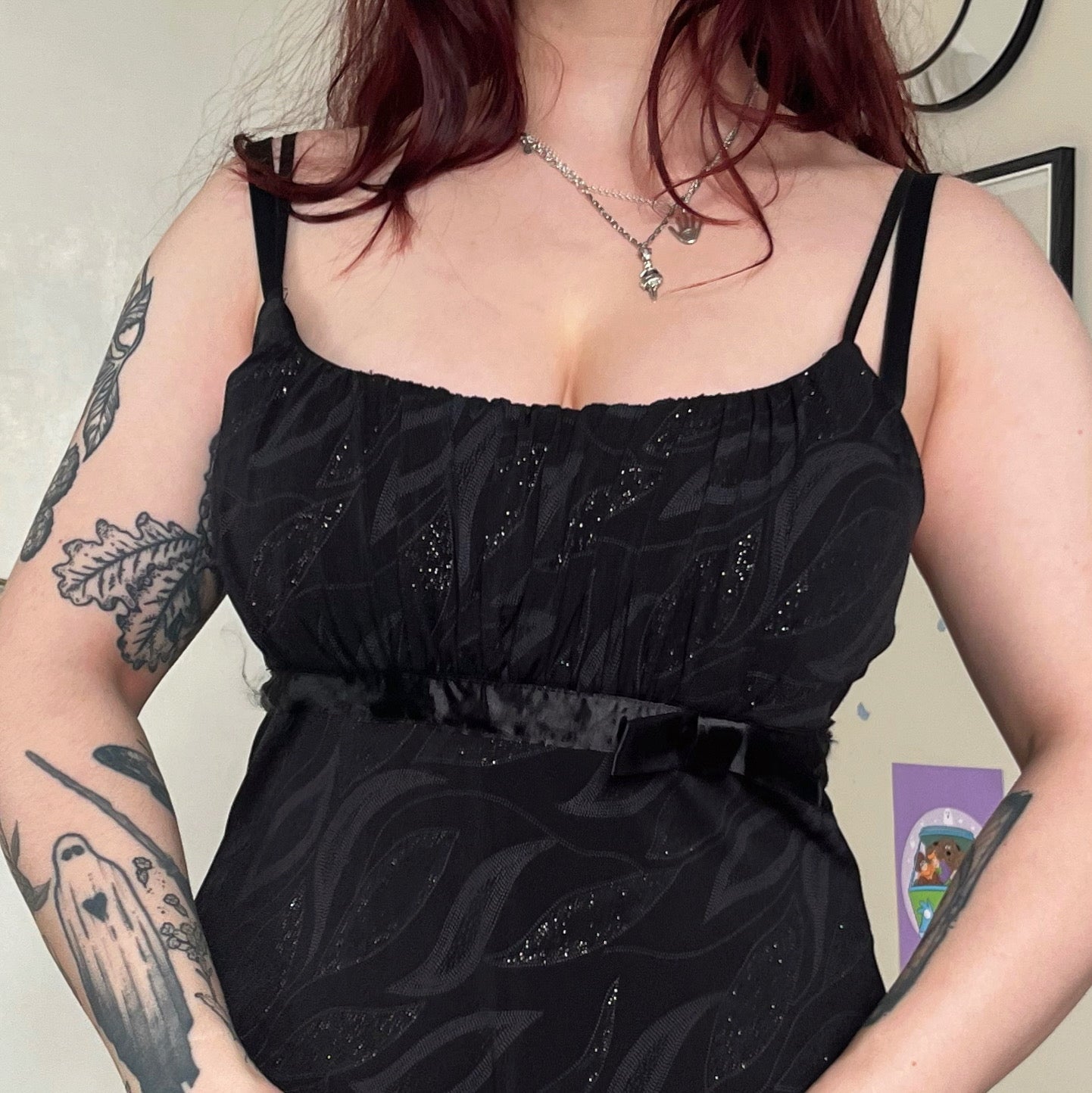 Gorgeous 2000s black glittery mesh dress! This dress has a stretchy back for easy fit, flares out from the waist and has tulle trim on the hem.