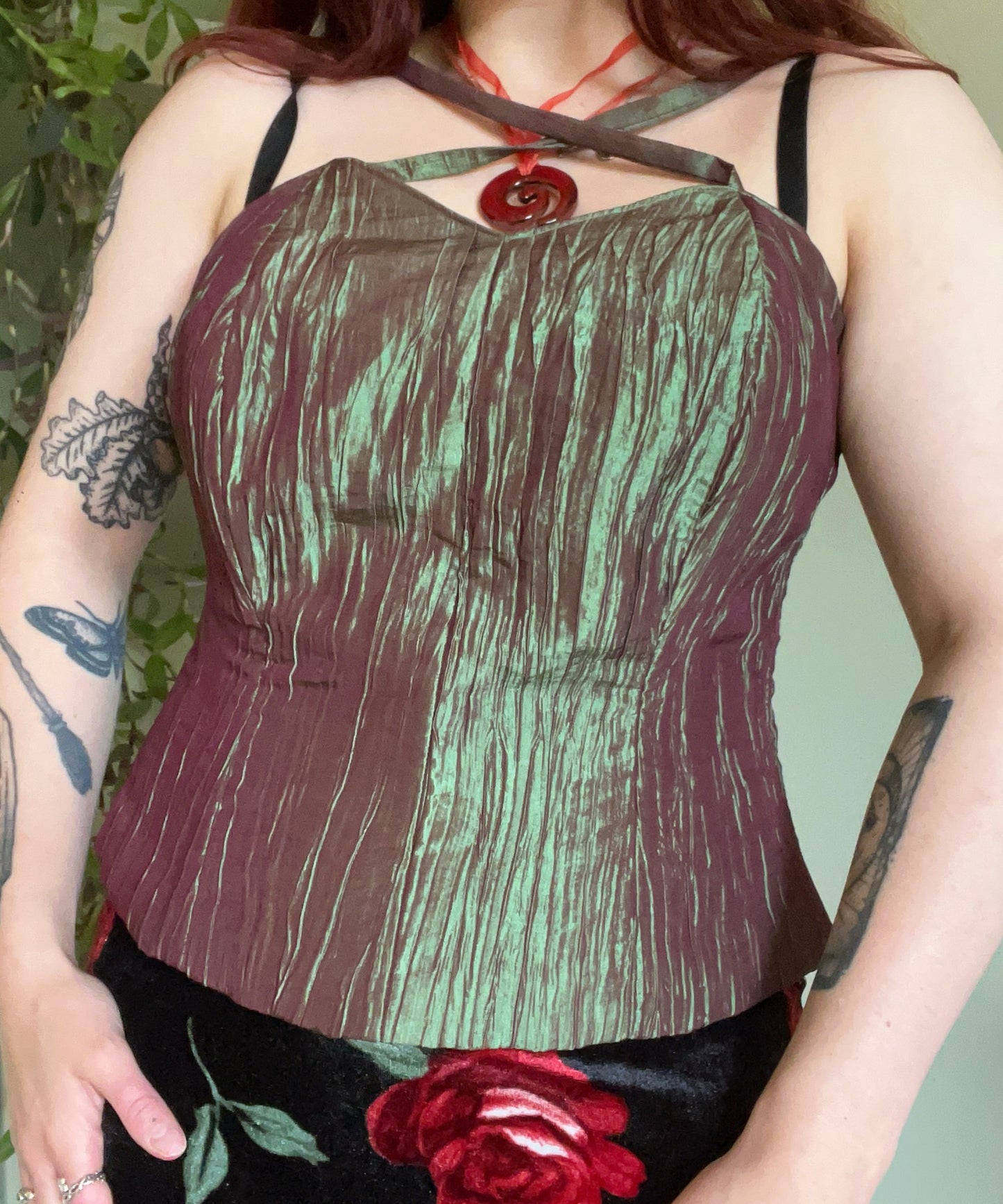 90s iridescent green corset top! Has a zip on the back. In perfect vintage condition and would best fit a UK 12-14.