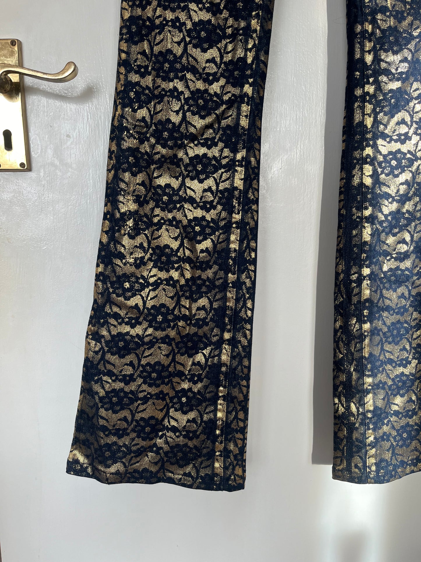 Super cute 2000s blue and gold pants! These have a floral design, low waist and flared legs. In perfect vintage condition and would best fit UK 4.