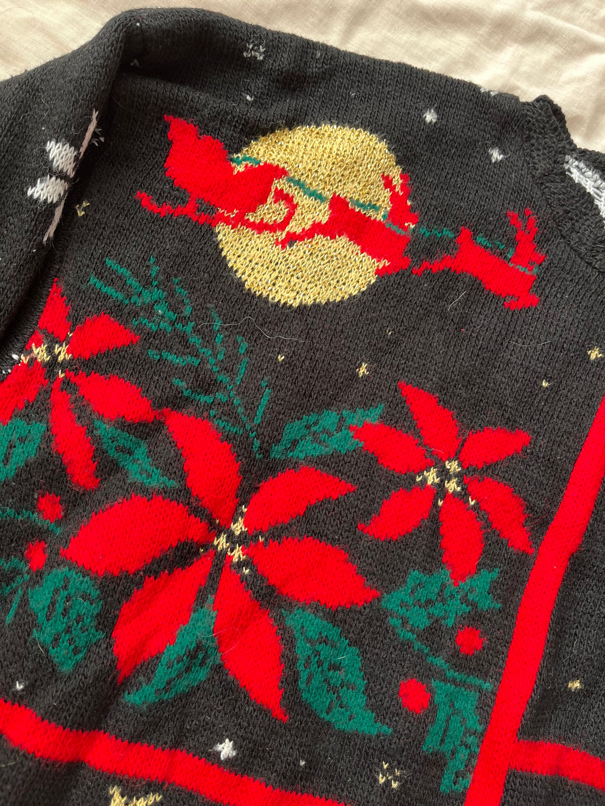 1990s black festive jumper! Features a festive design of an angel, a snowman, a wreath, and a sleigh.