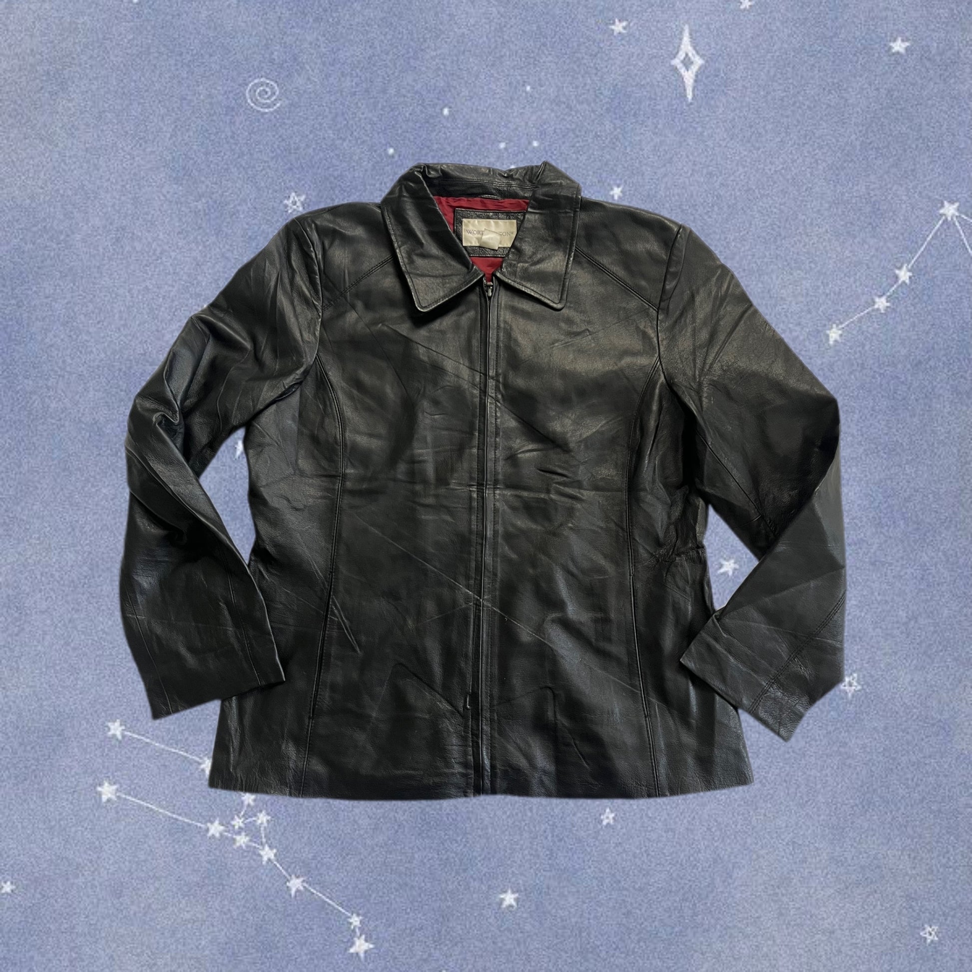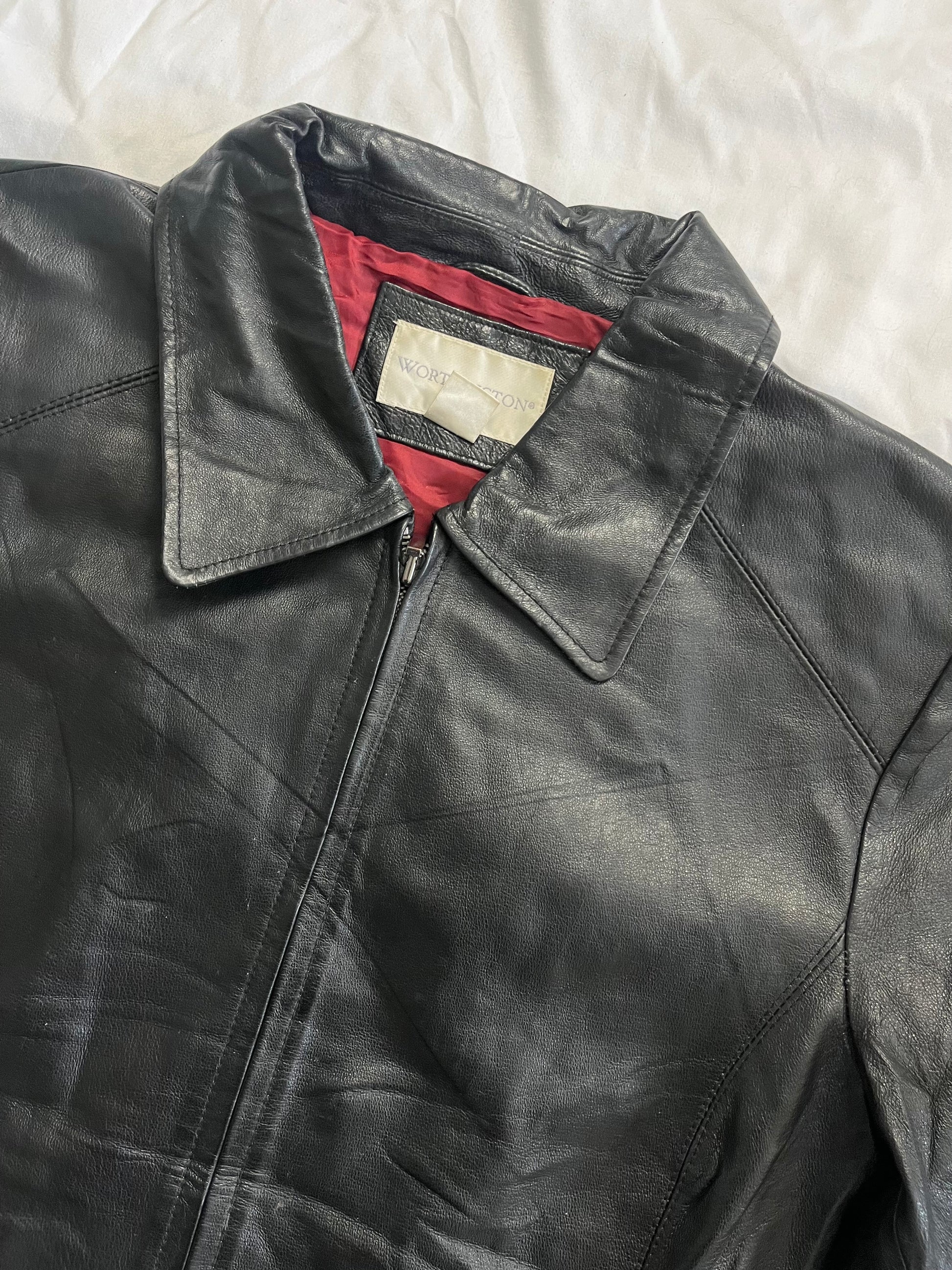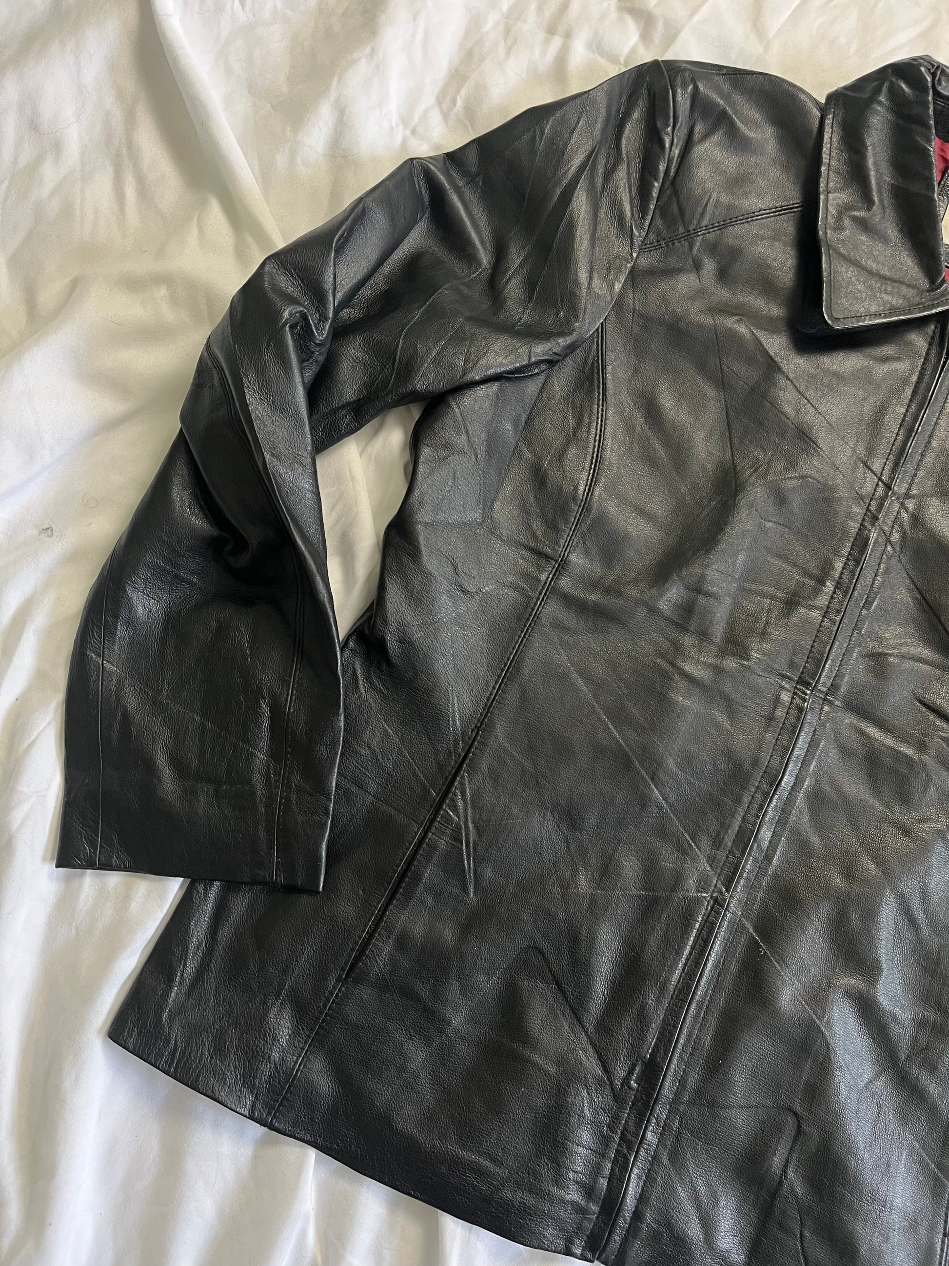 1990s black leather jacket with a red lining! This has a zip on the front and is made from real leather.