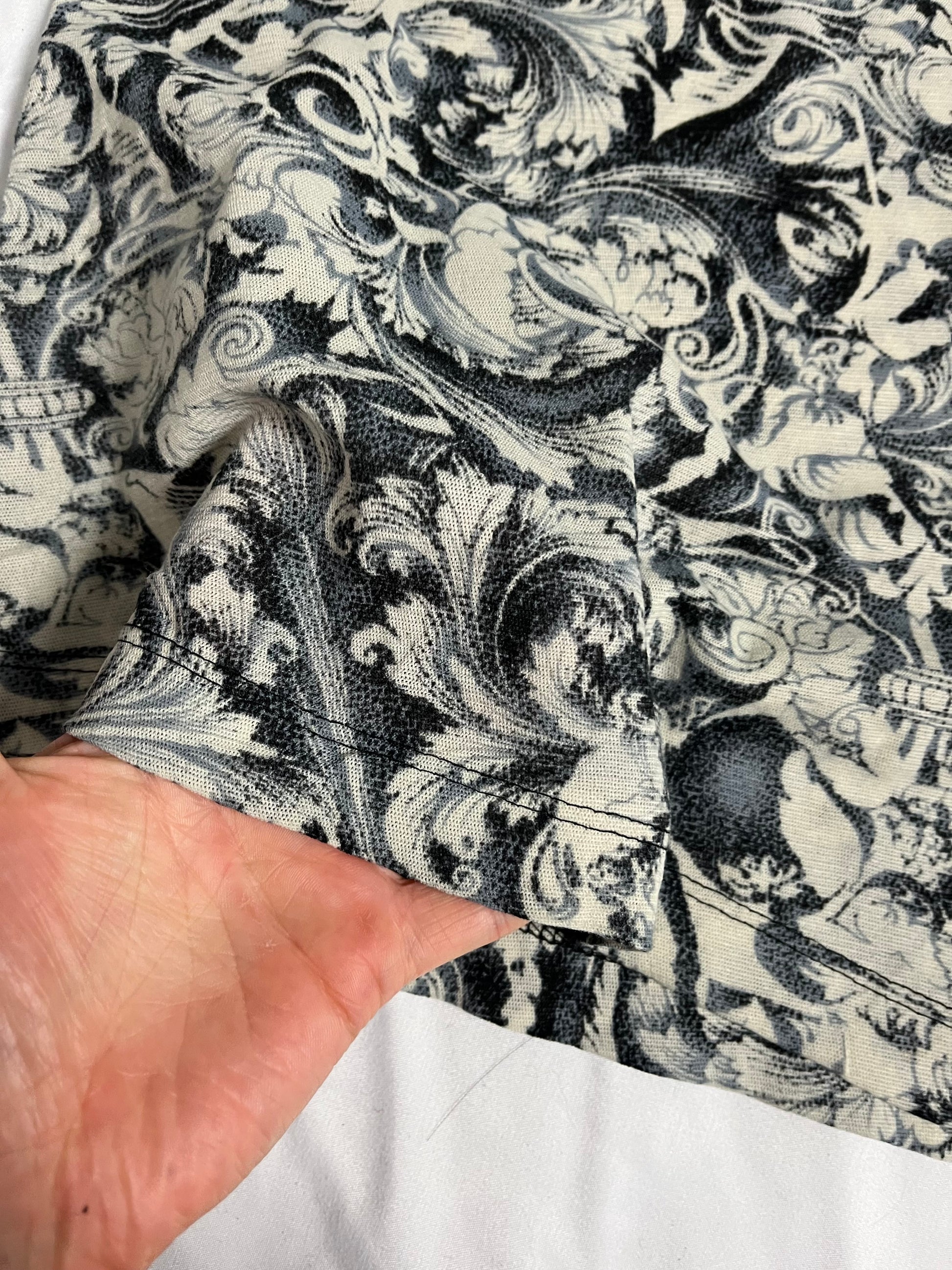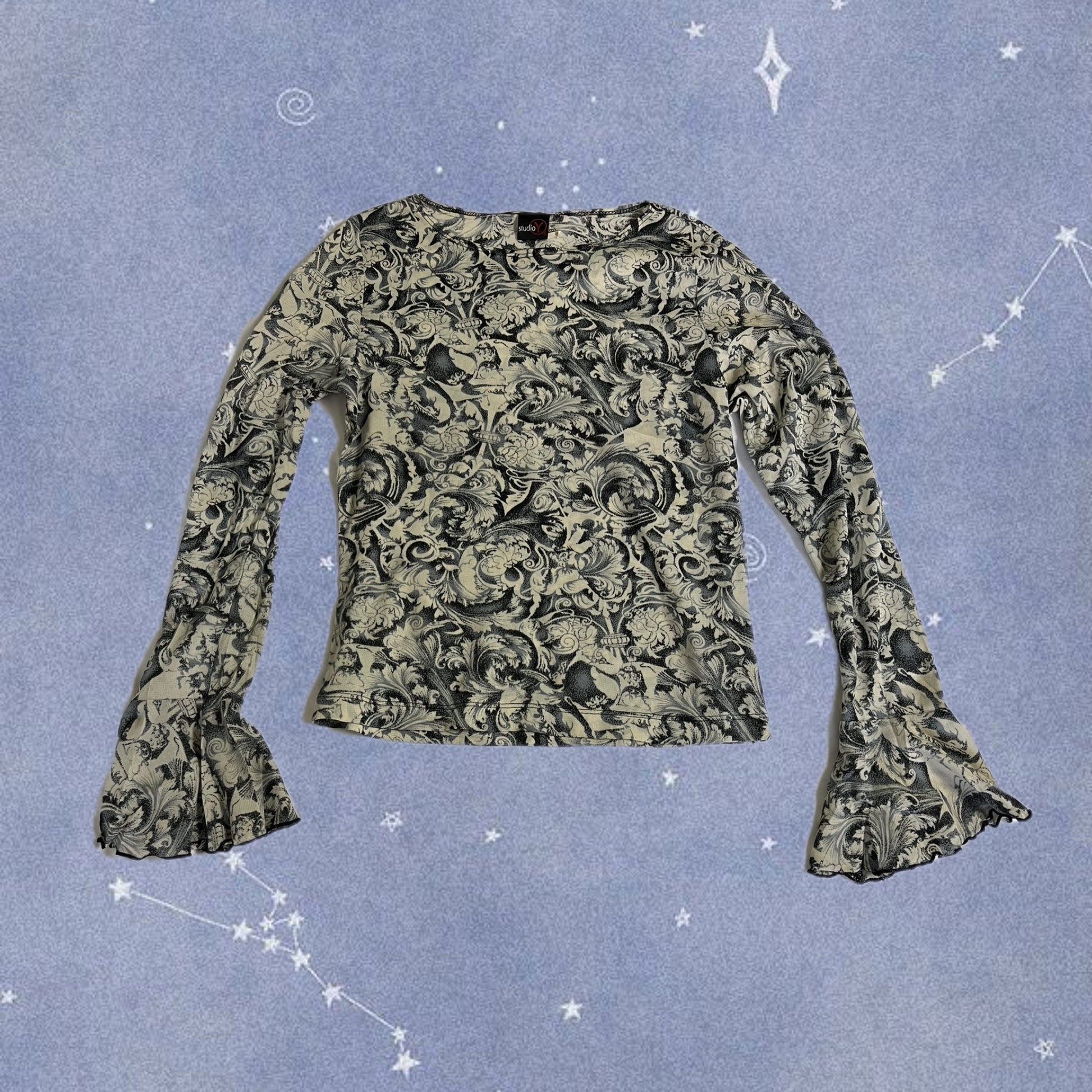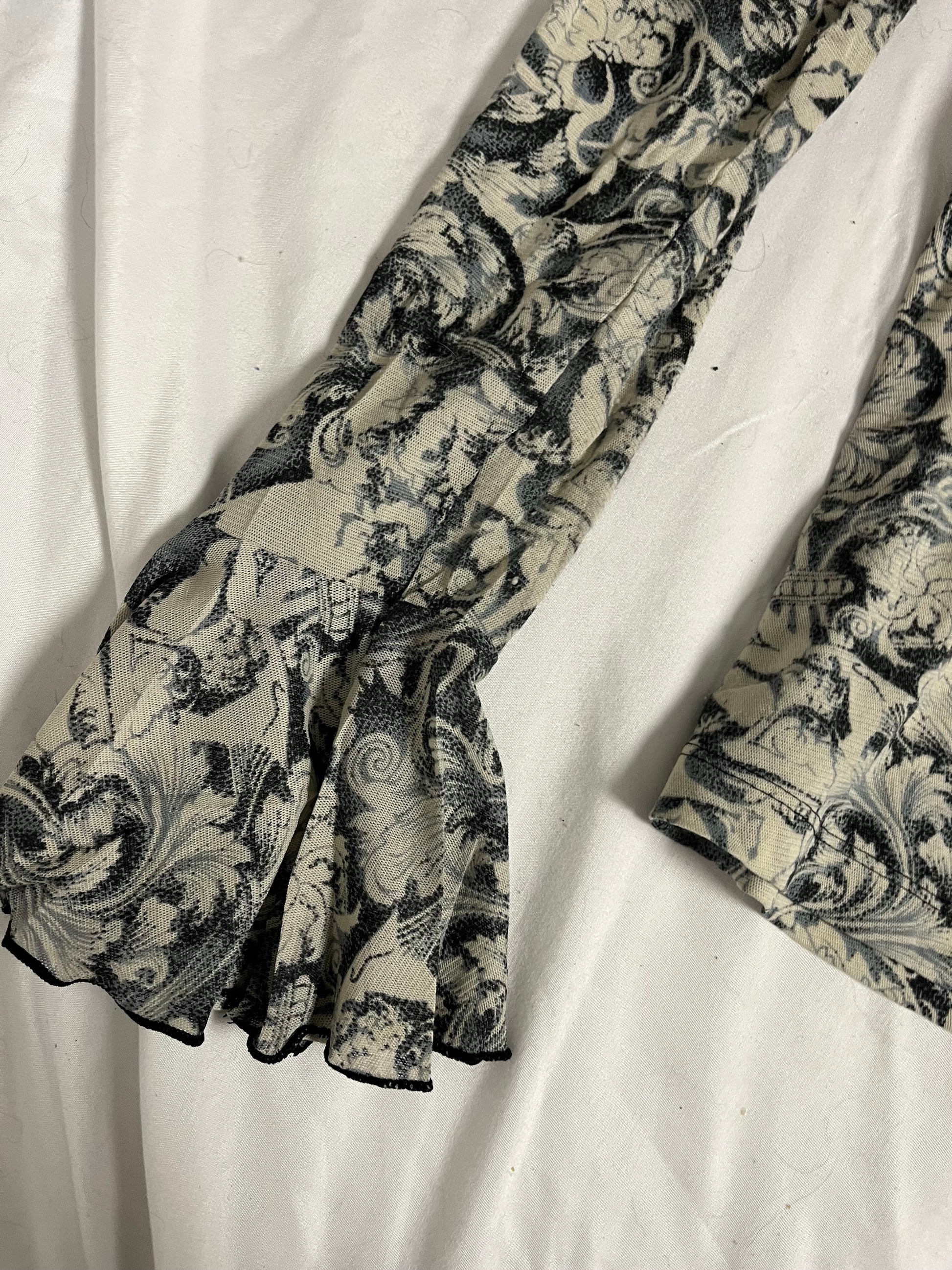 2000s mesh top by Studio Y! This has a stretchy fit with a gorgeous filigree design and flared sleeves.