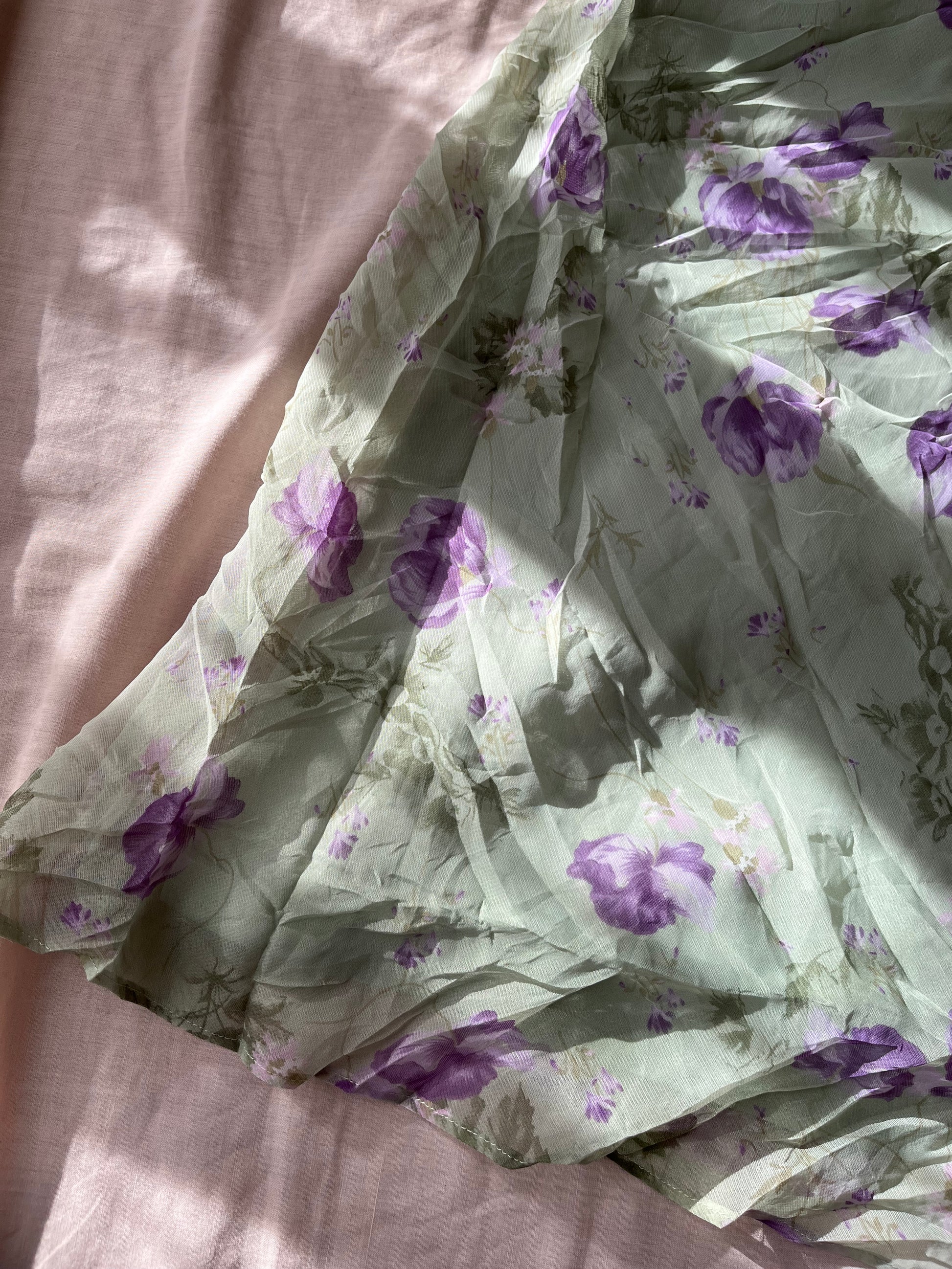 1990s green and purple floral mesh mini dress! Some slight stretch to it.