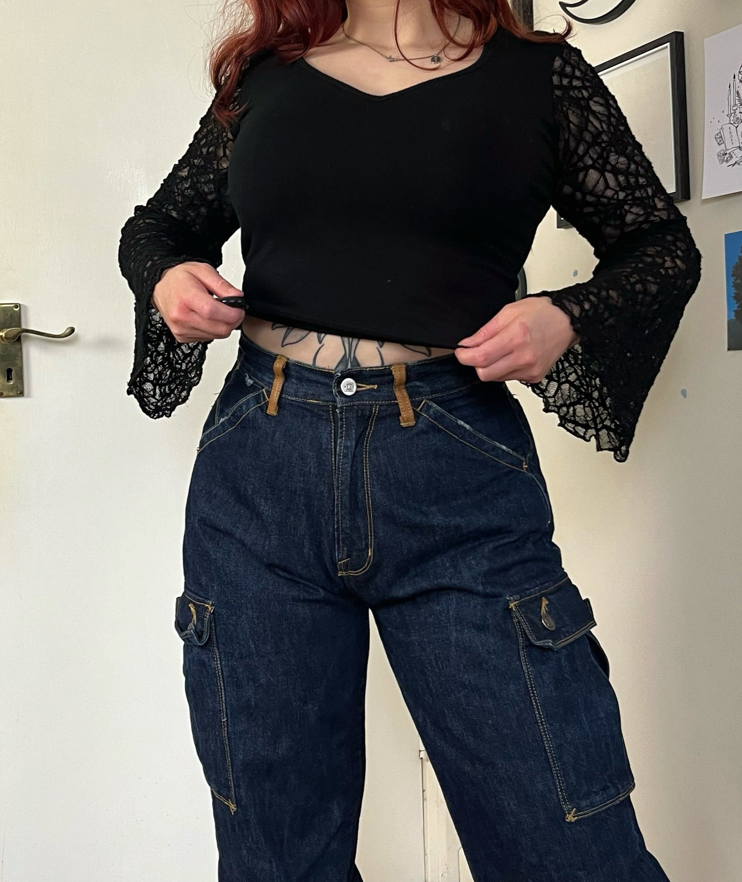 Amazing 90s blue cargo jeans! Cargo pants with loads of pockets and a high waist! In perfect vintage condition and would best fit UK 12.
