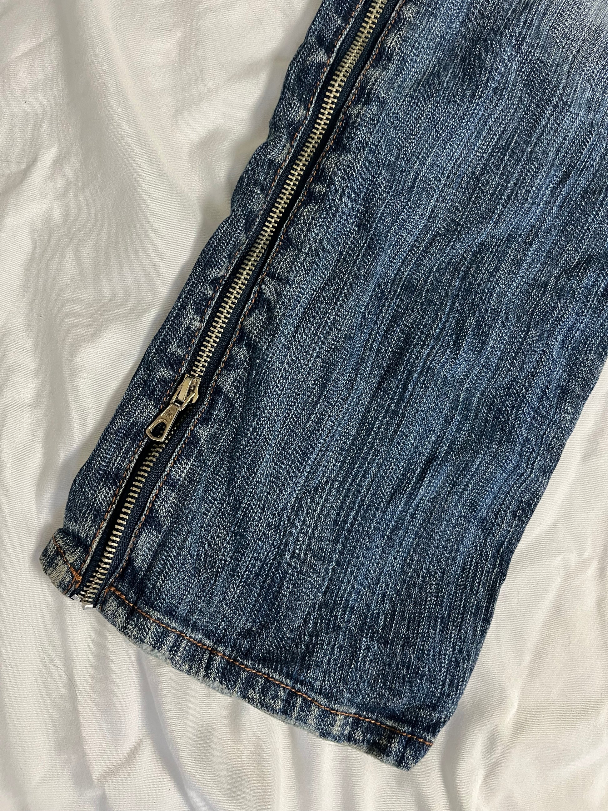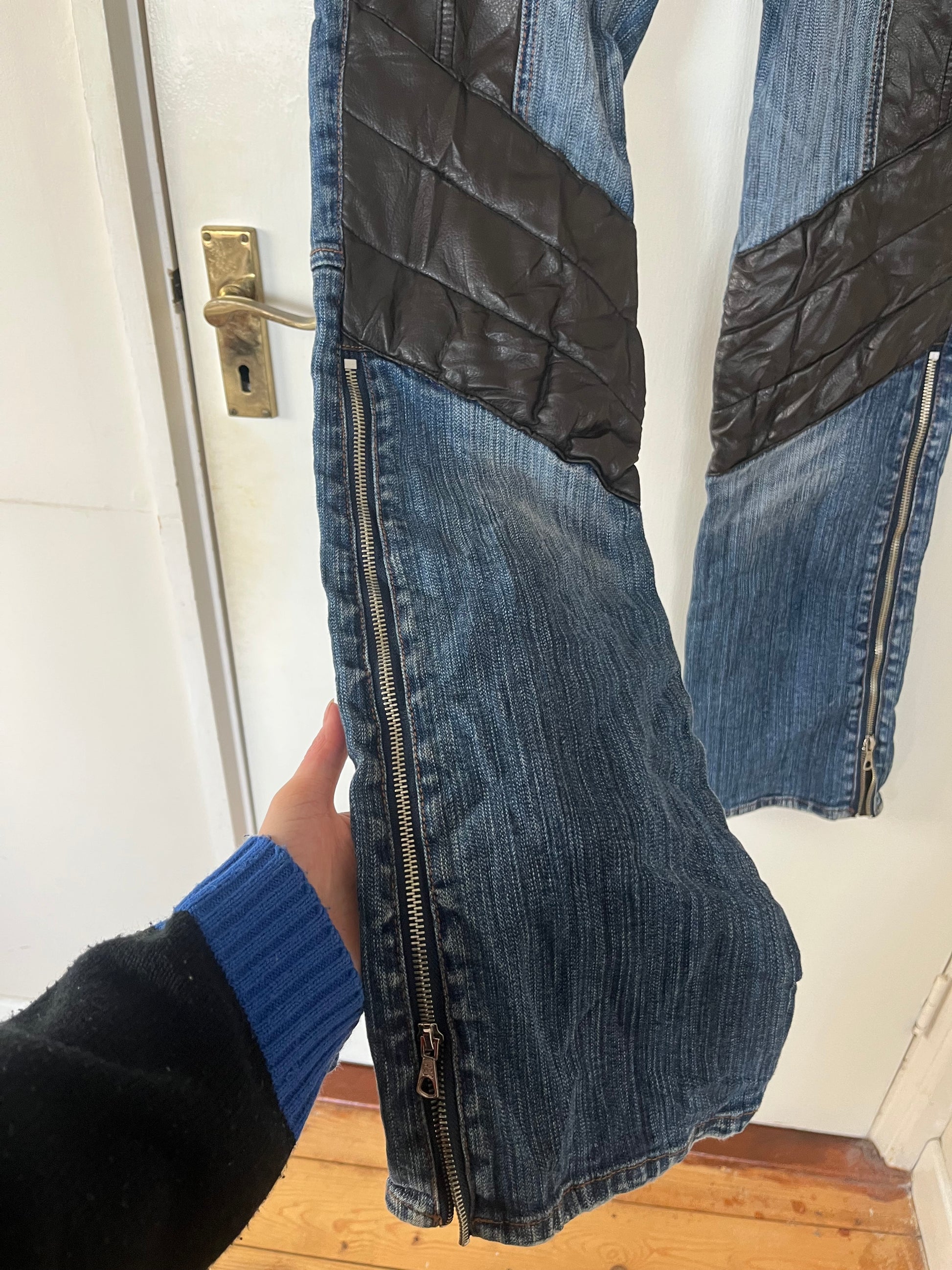 Rare 2000s flared leg jeans by Parasuco! These have a flared leg, buckles on the waist, zips on the legs and leather elements.