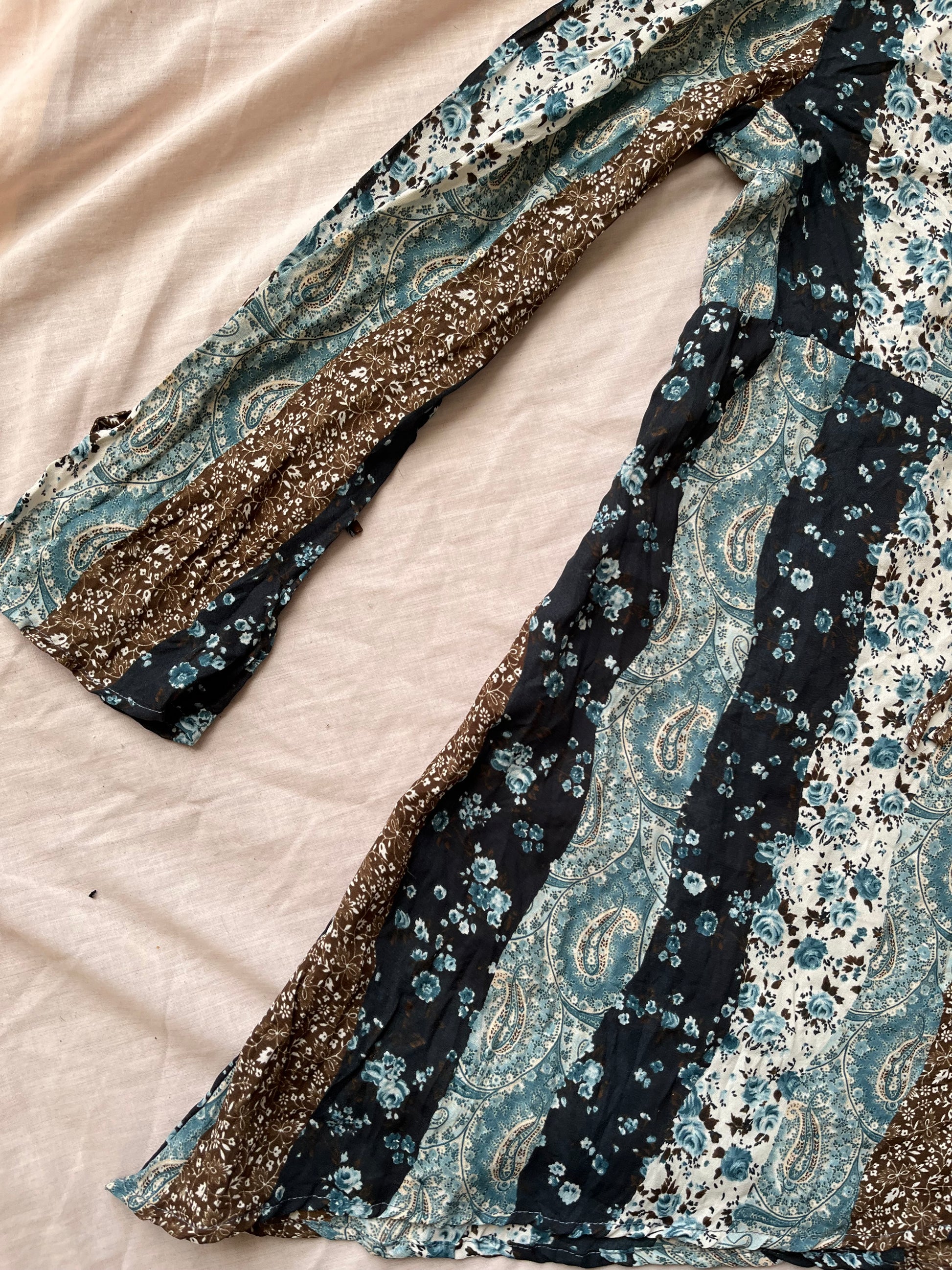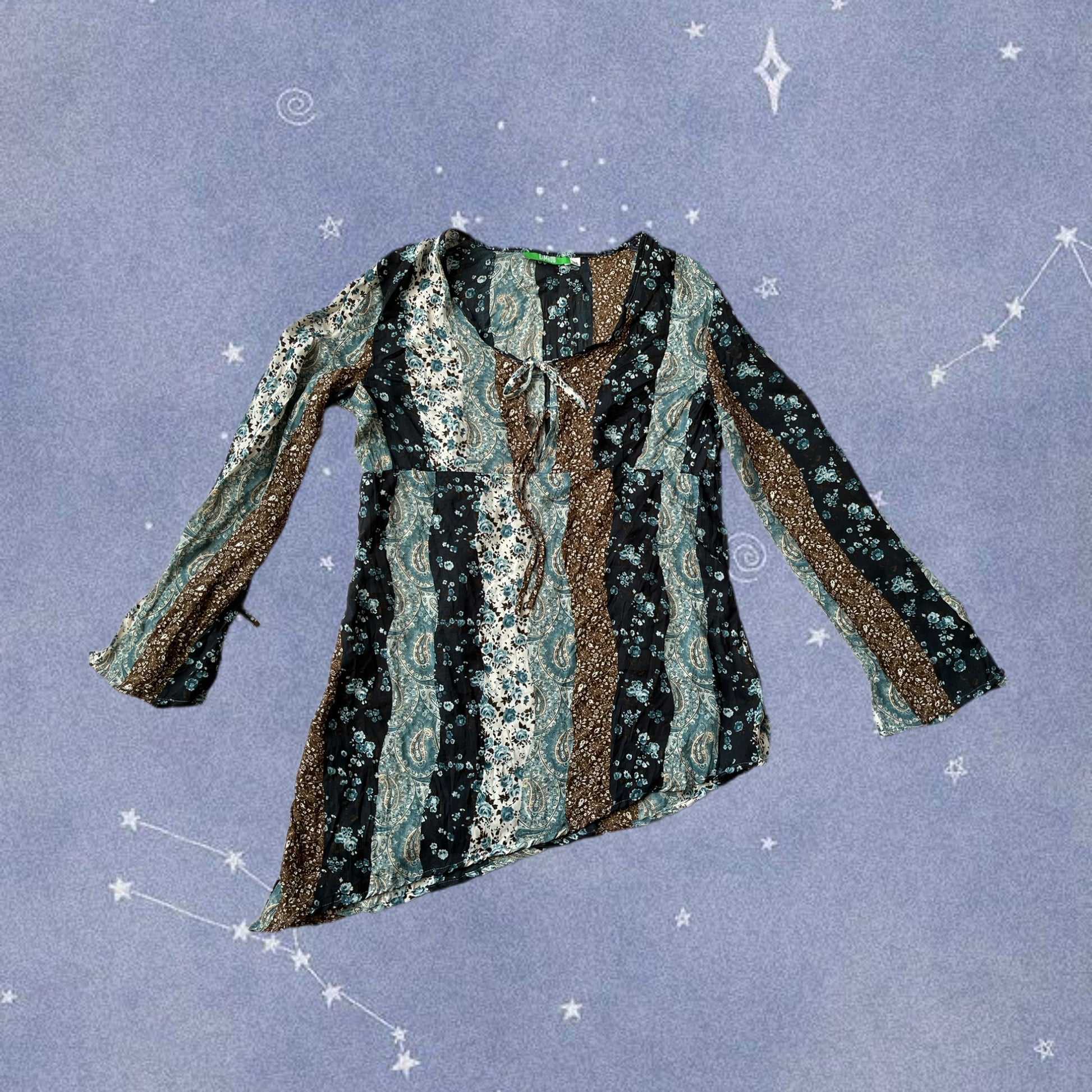 Gorgeous 2000s floral pattern patchwork top! This has a keyhole neckline, and asymmetrical hem and wide sleeves.