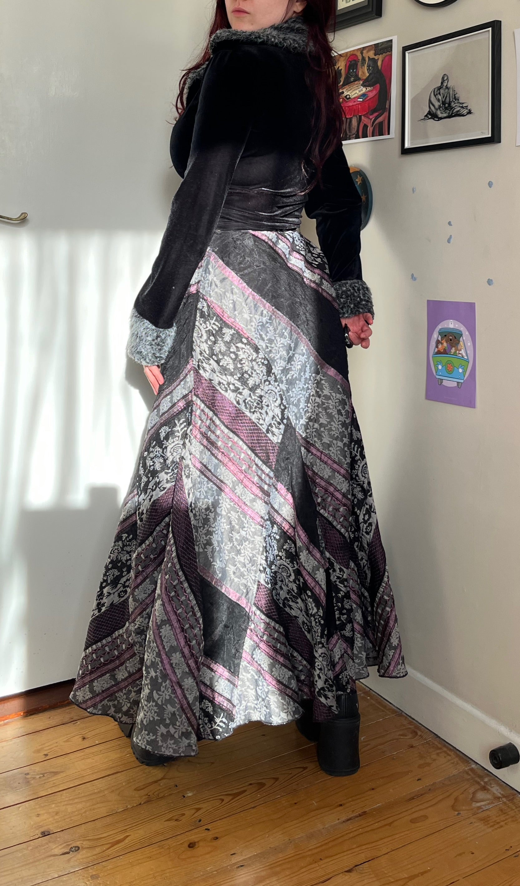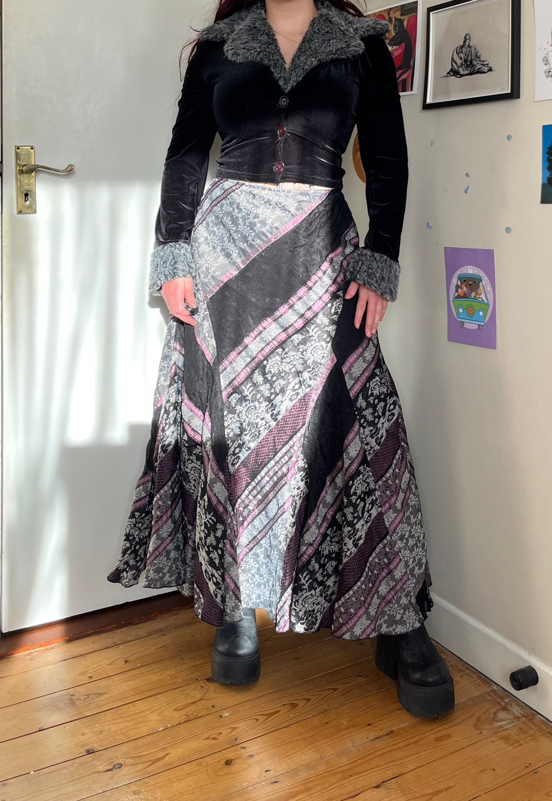 Super nice 2000s patchwork style maxi skirt! Features different floral and patchwork designs all over.