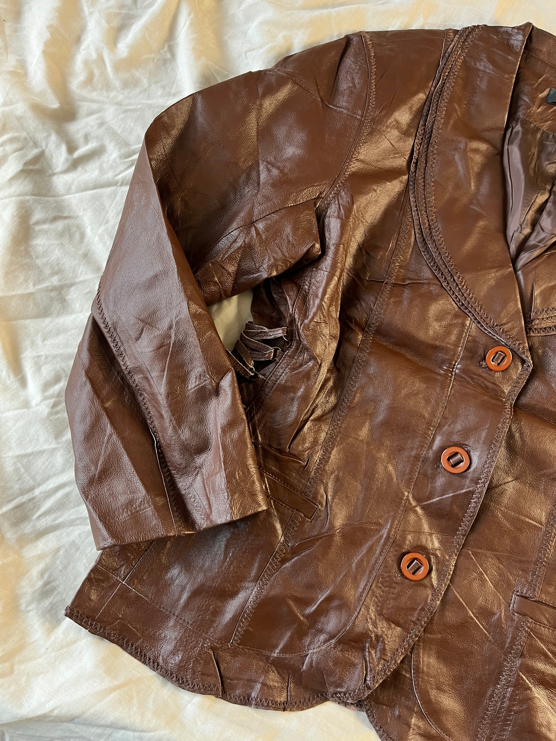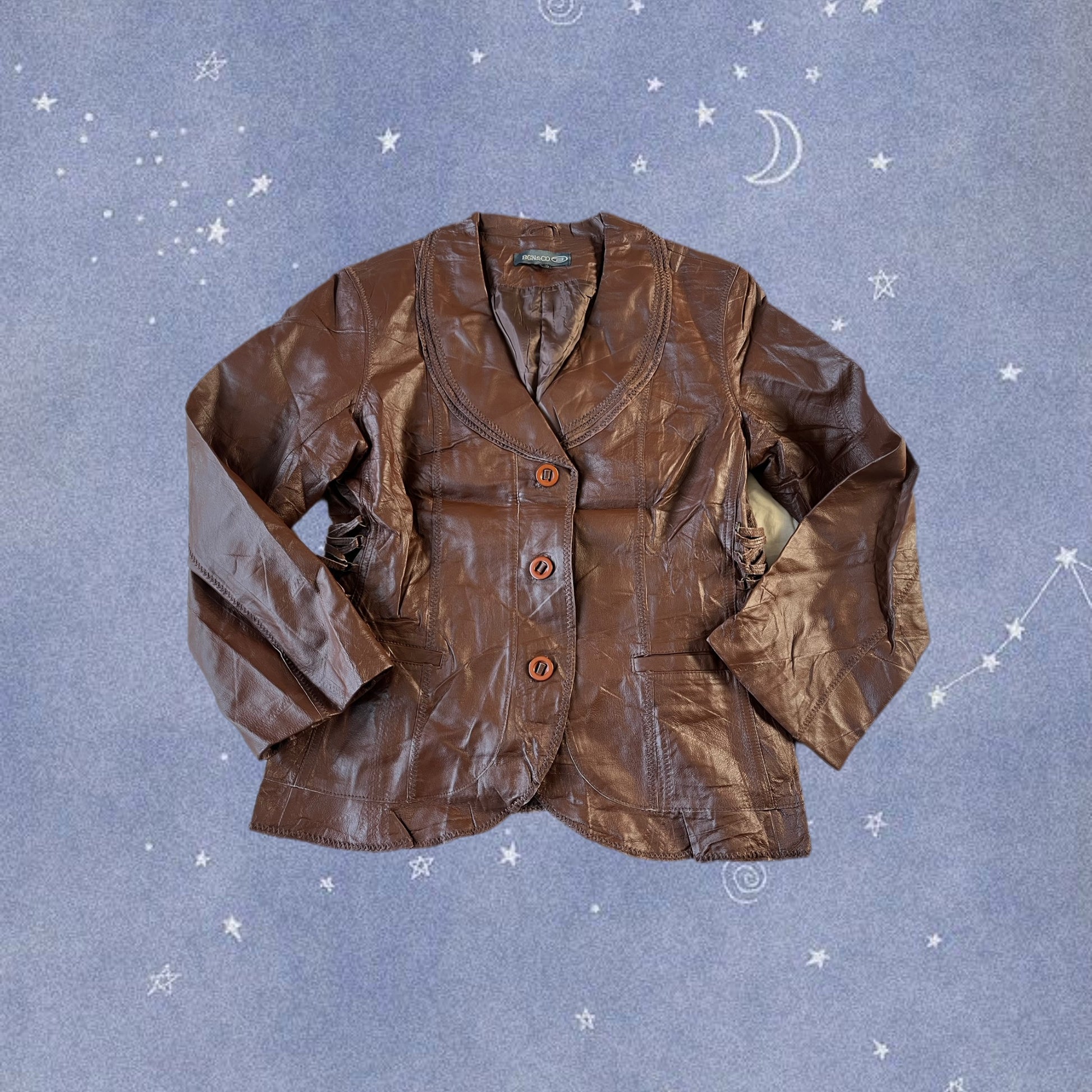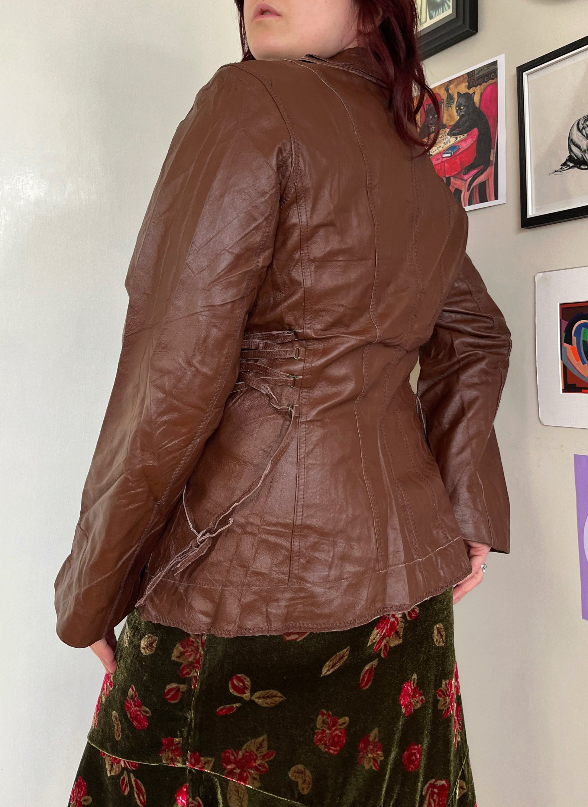 Amazing 2000s light brown leather jacket! Buttons on the front and tie details on the side. In perfect vintage condition and would best fit UK 12-14. 100% leather.