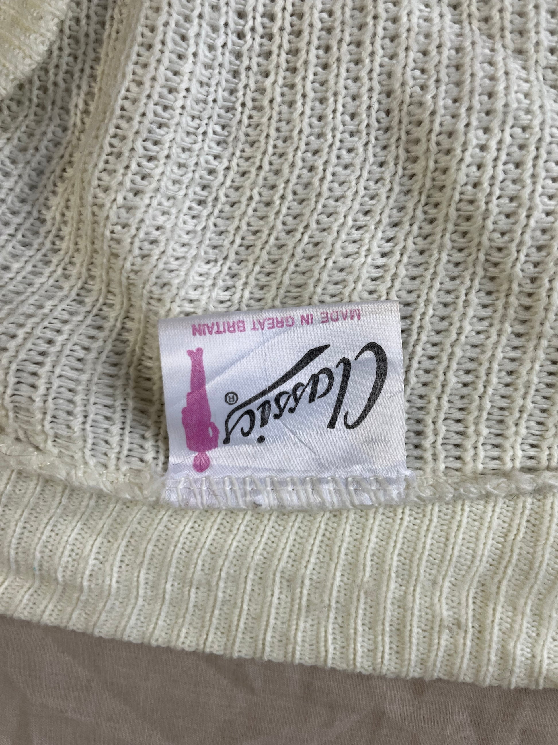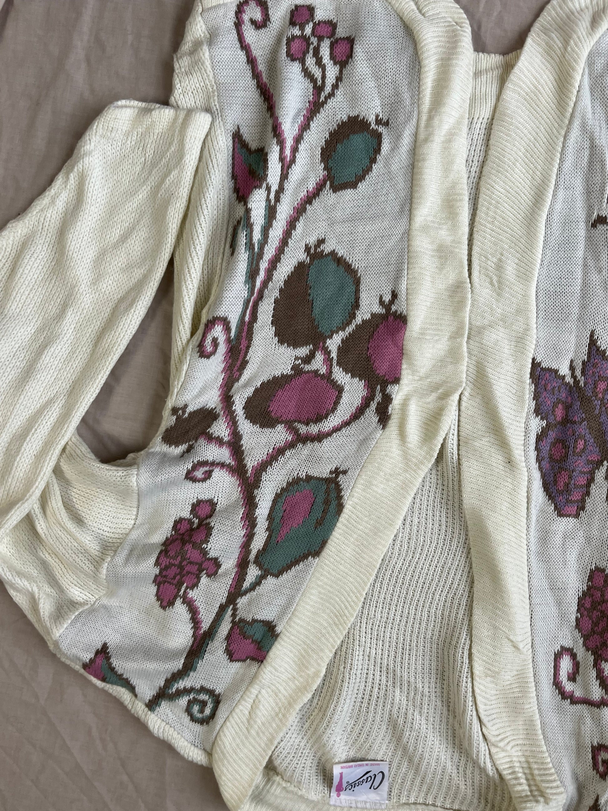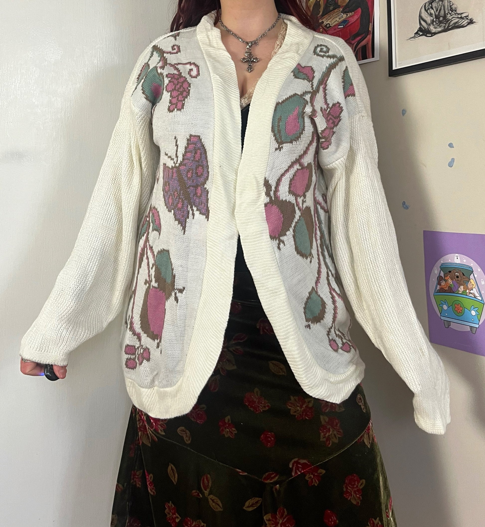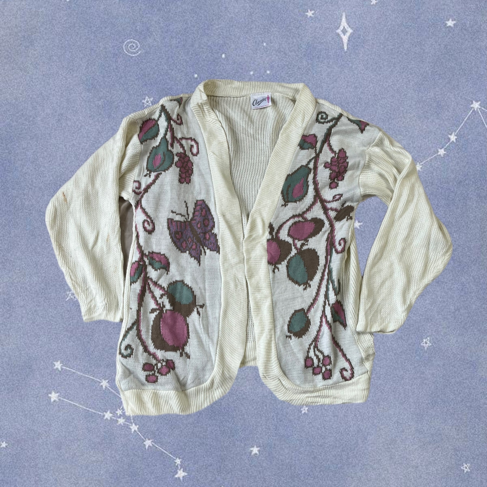 Gorgeous 1990s white open front cardigan! This has an open front with a butterfly, berry and pear design on the front. Can fit multiple sizes but labelled XL. Made from 100% acrylic materials.