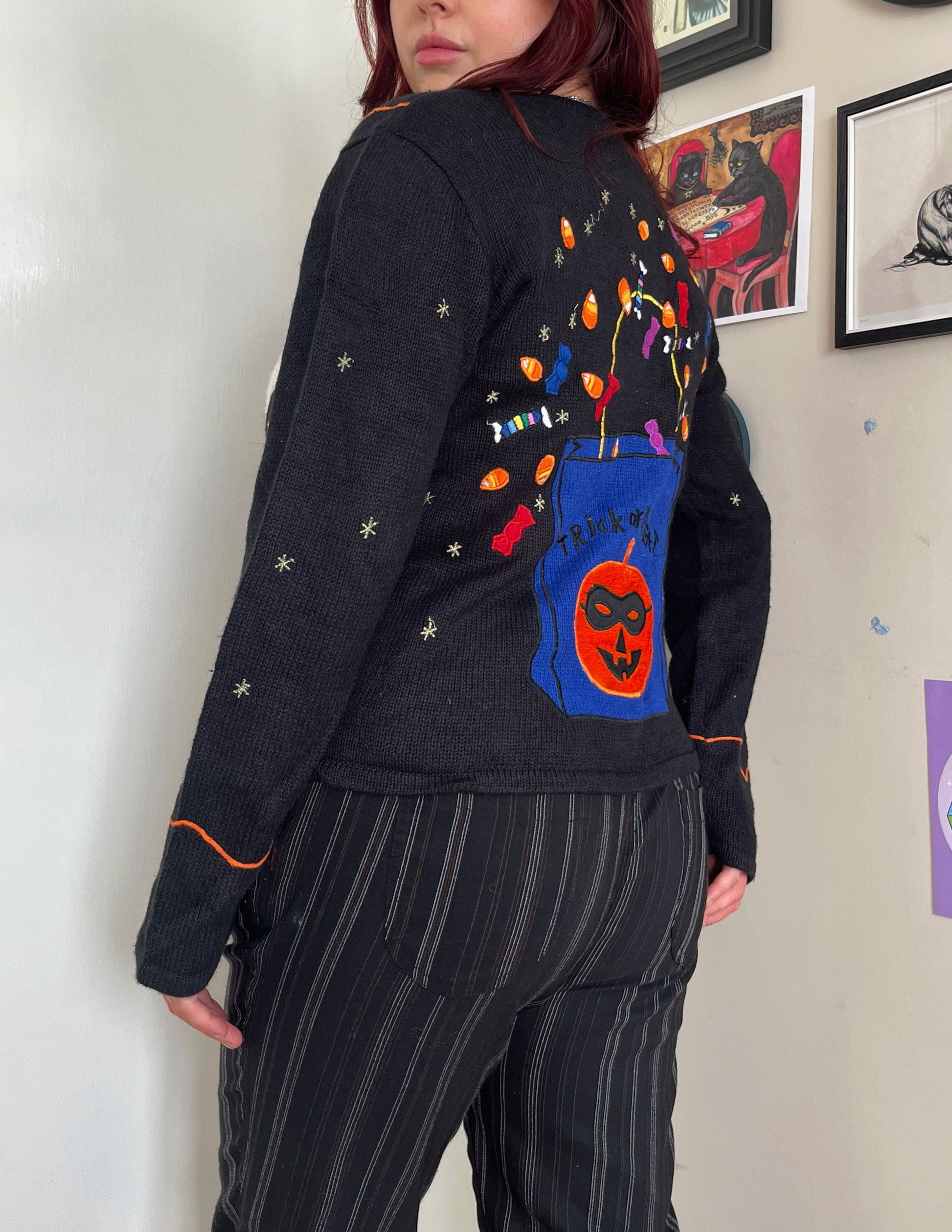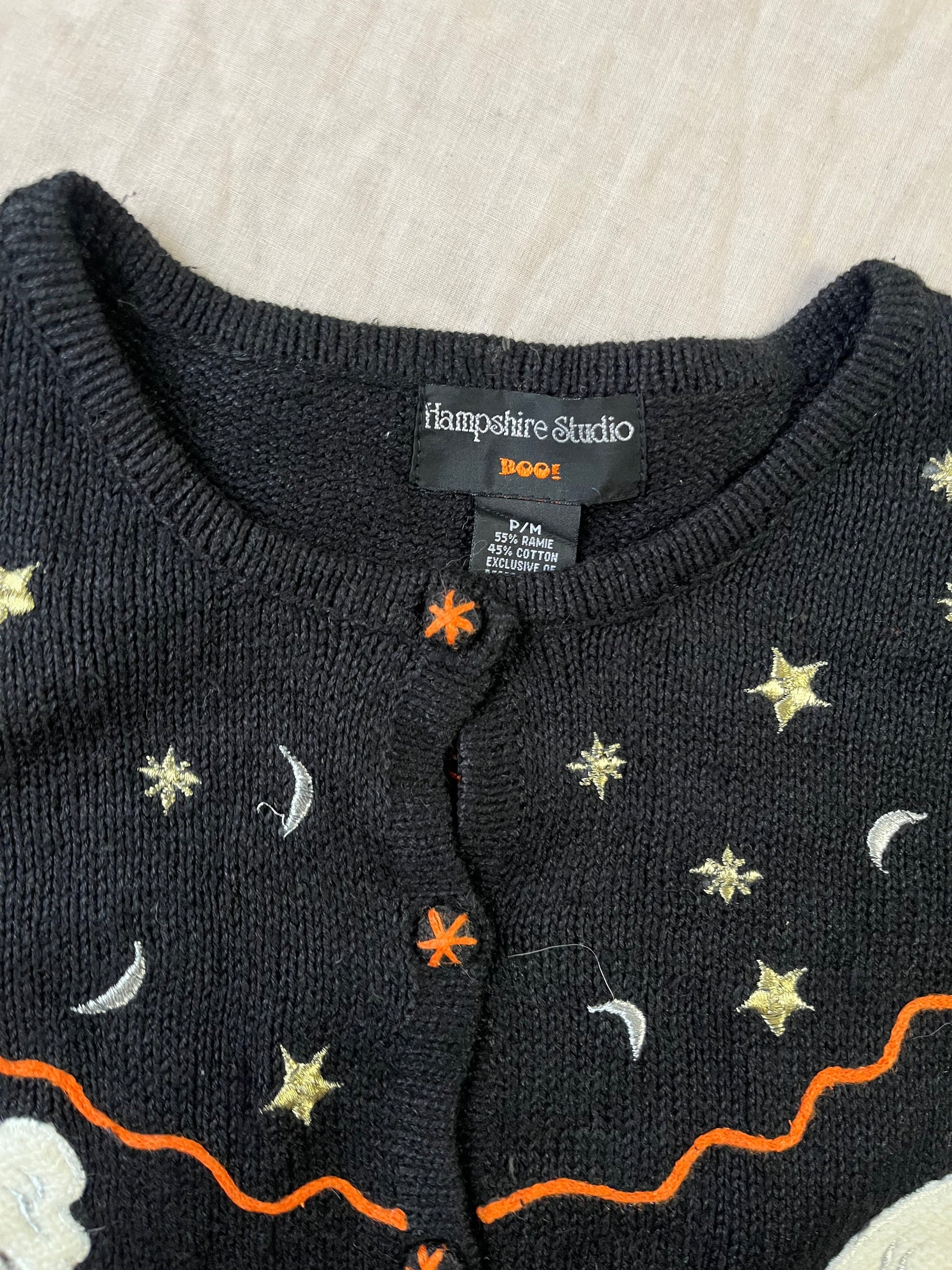 1990s Halloween button up front cardigan! Has a design of ghosts, sweets, moons, stars, pumpkins and more on it! Labelled M.
