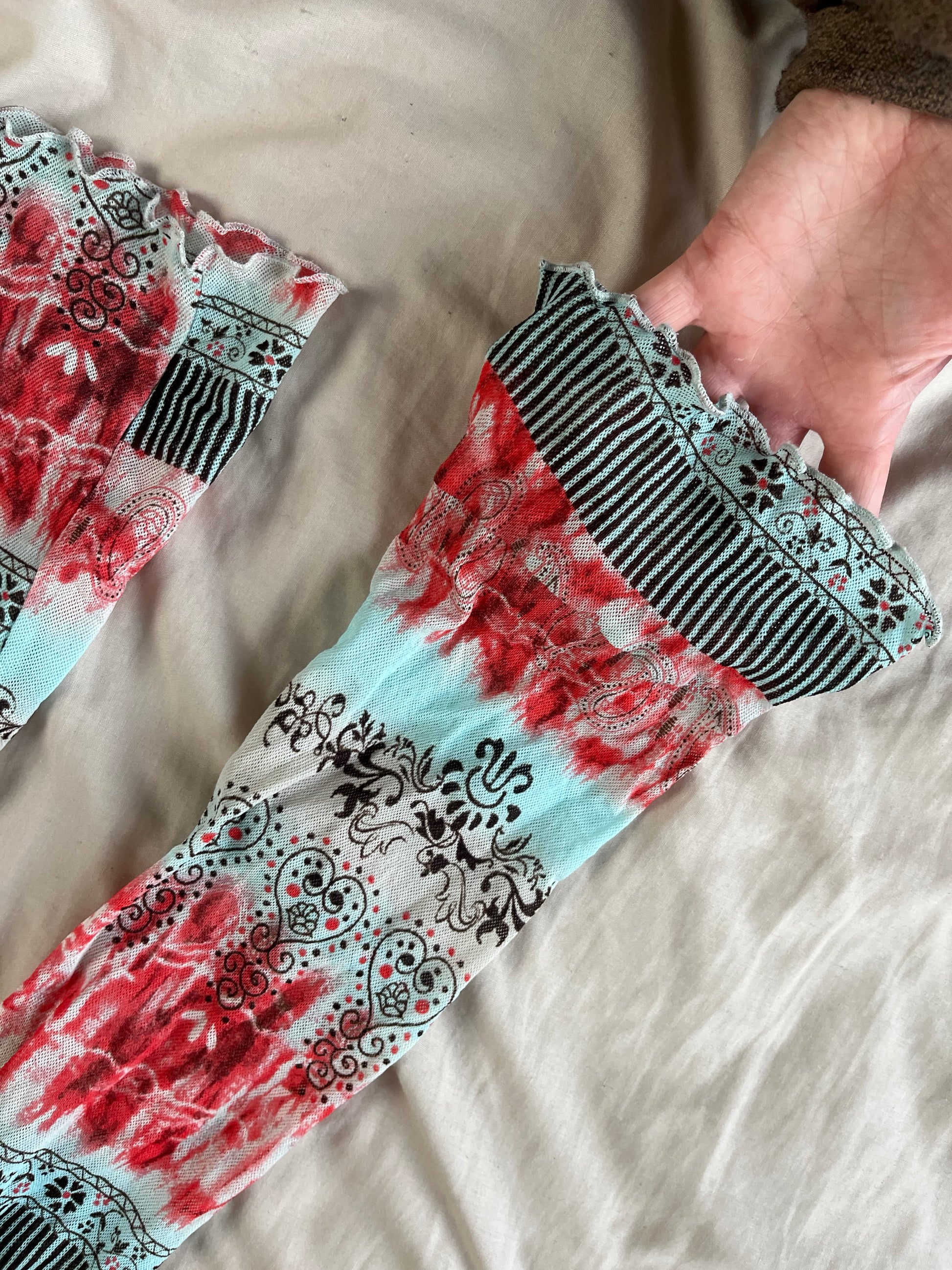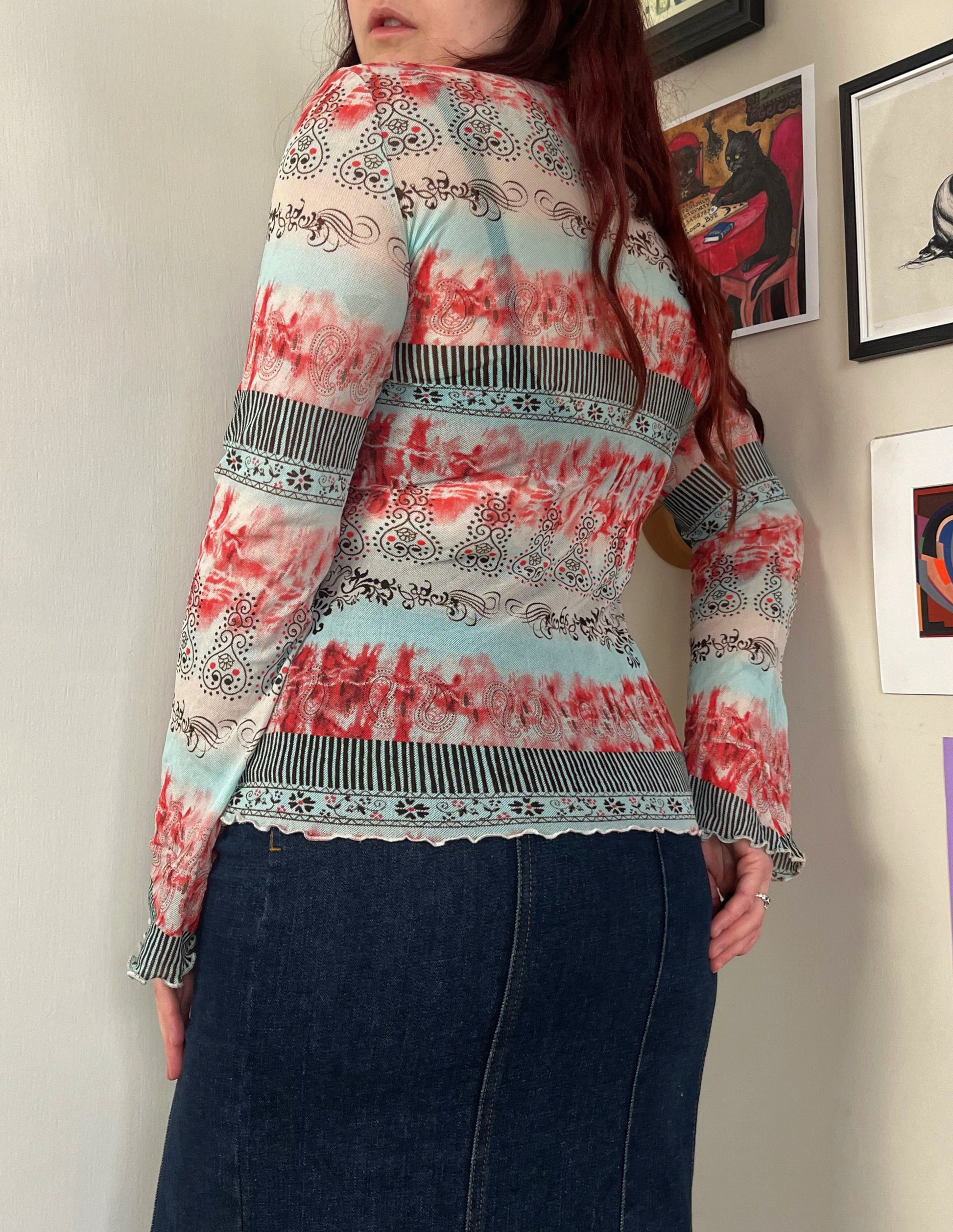 Gorgeous 2000s boho mesh top! This has a stretchy fit with a cool design and flared sleeves. In perfect vintage condition and would best fit UK 10-12.