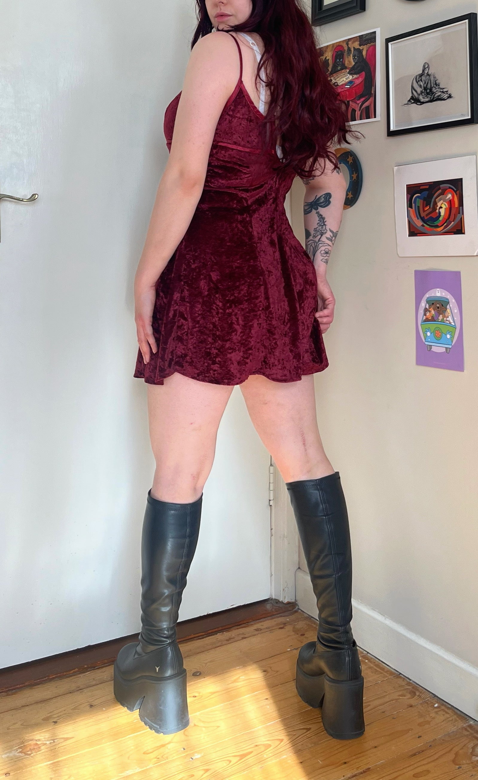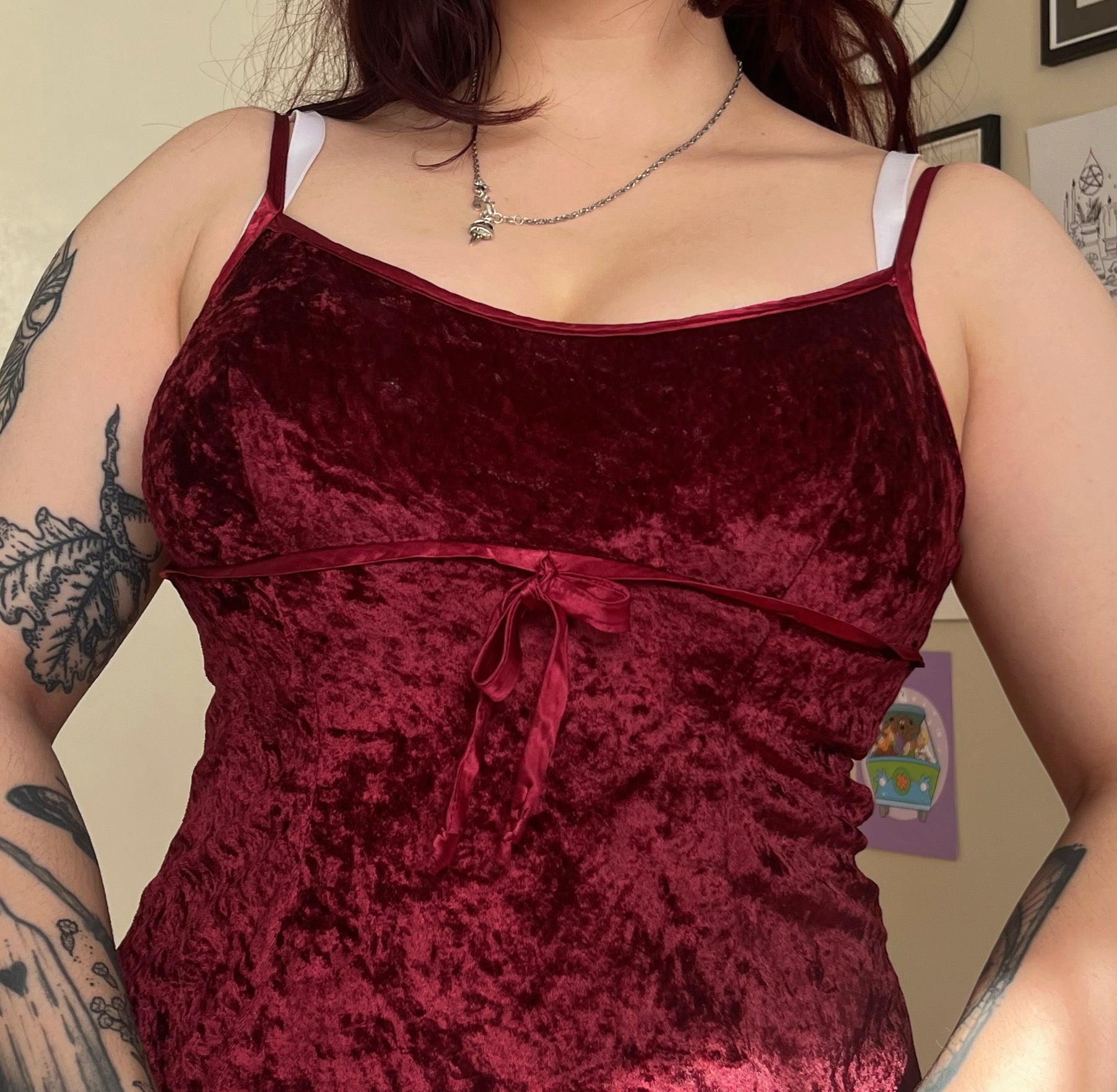 2000s red velvet mini dress! Zips up at the back with a flattering fit.