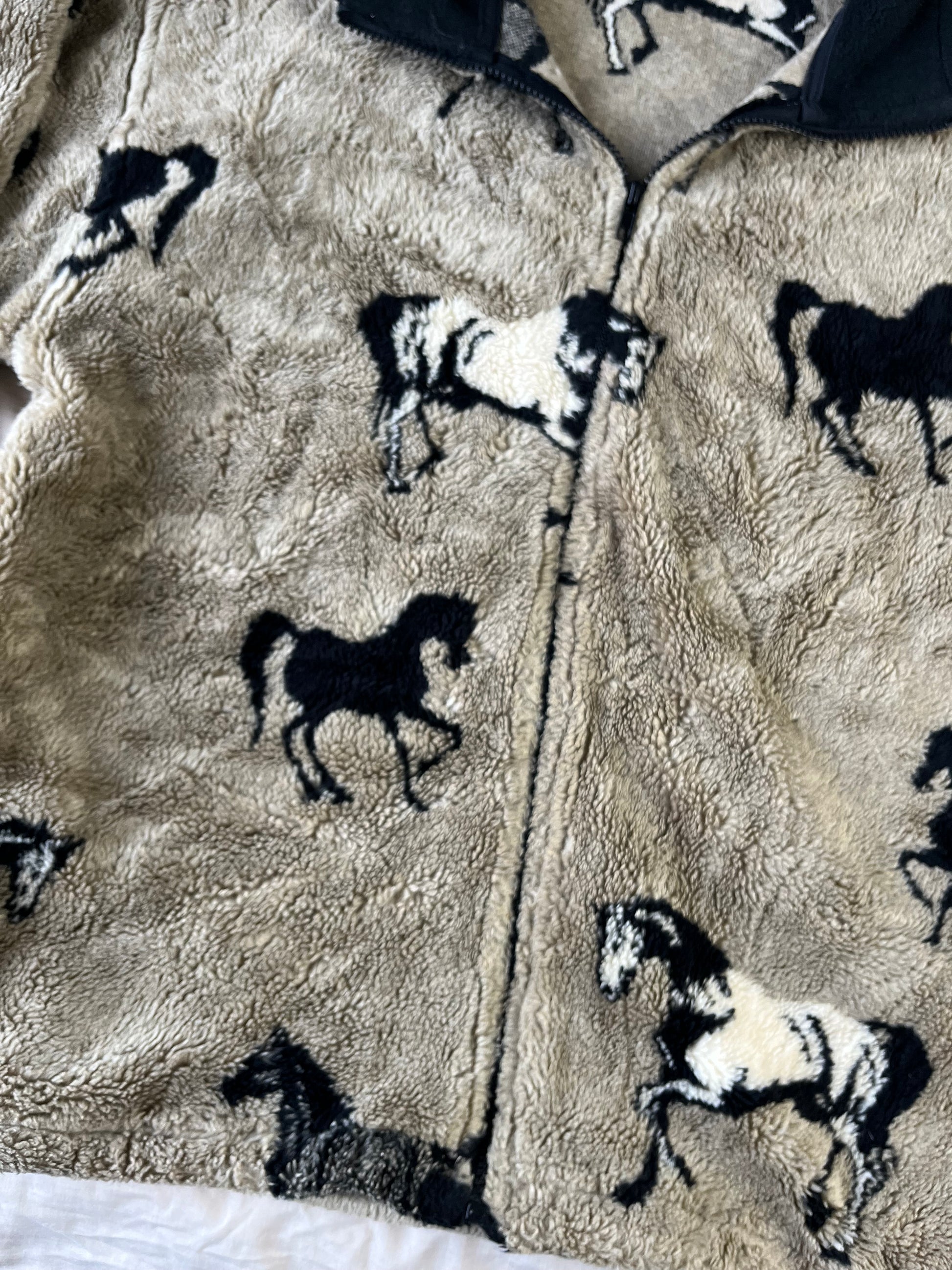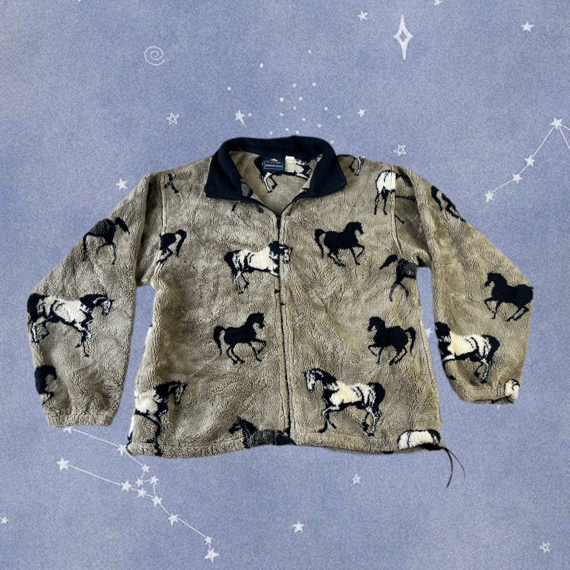 Amazing 1990s made in the USA fleece jacket! Zip up front with a cool horse pattern all over. In perfect vintage condition and would best fit UK 6-18 depending on desired fit.