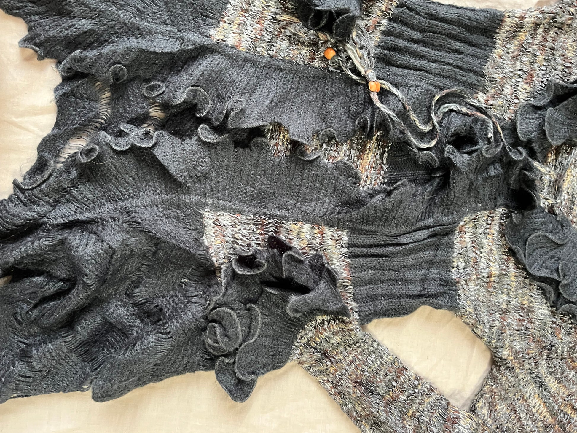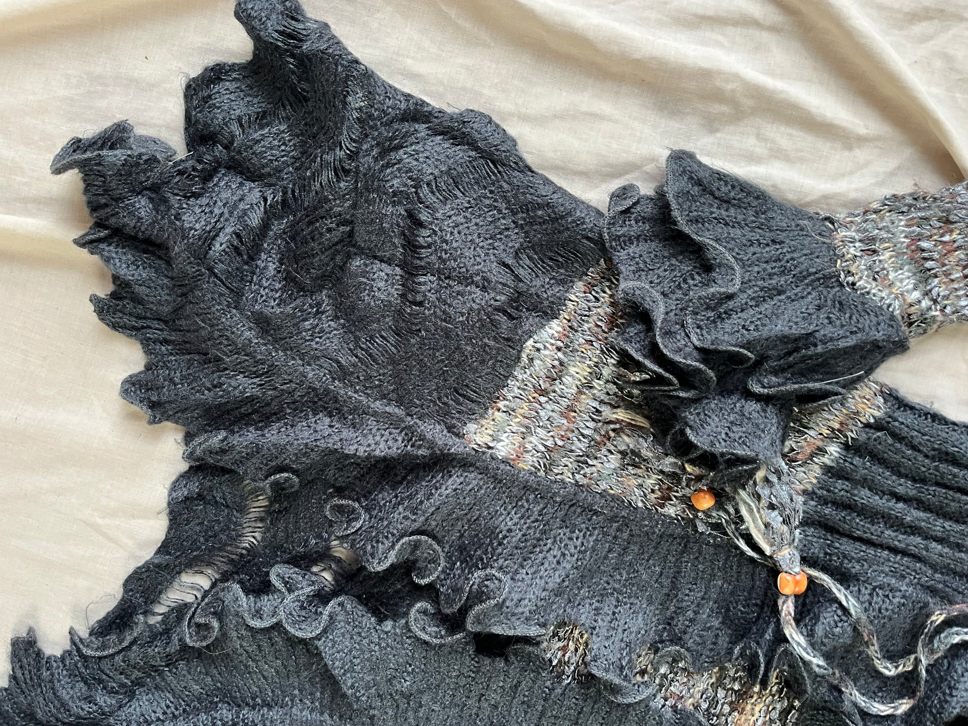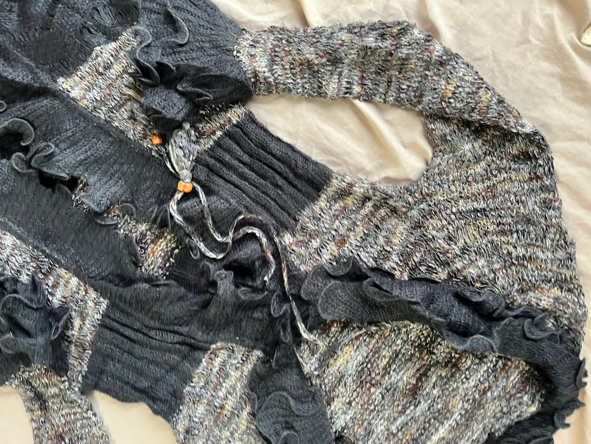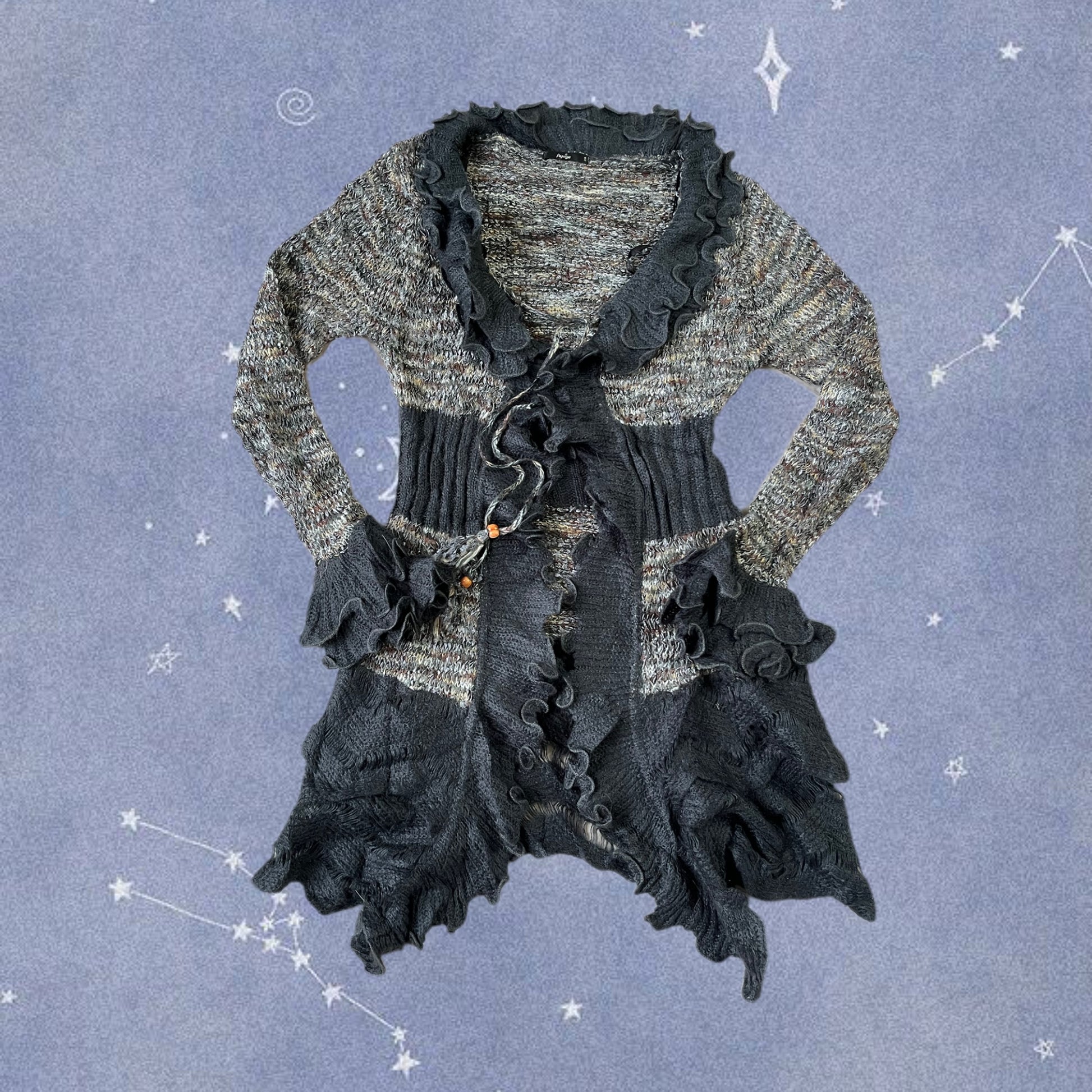 Gorgeous 1990s grey tie front cardigan! Ruffly hem and sleeves and can be worn open or tied at the front.